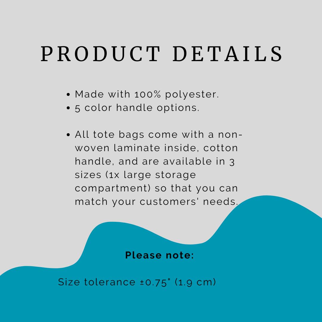 .: All tote bags come with a non-woven laminate inside, cotton handle, and are available in 3 sizes (1x large storage compartment) so that you can match your customers' needs.