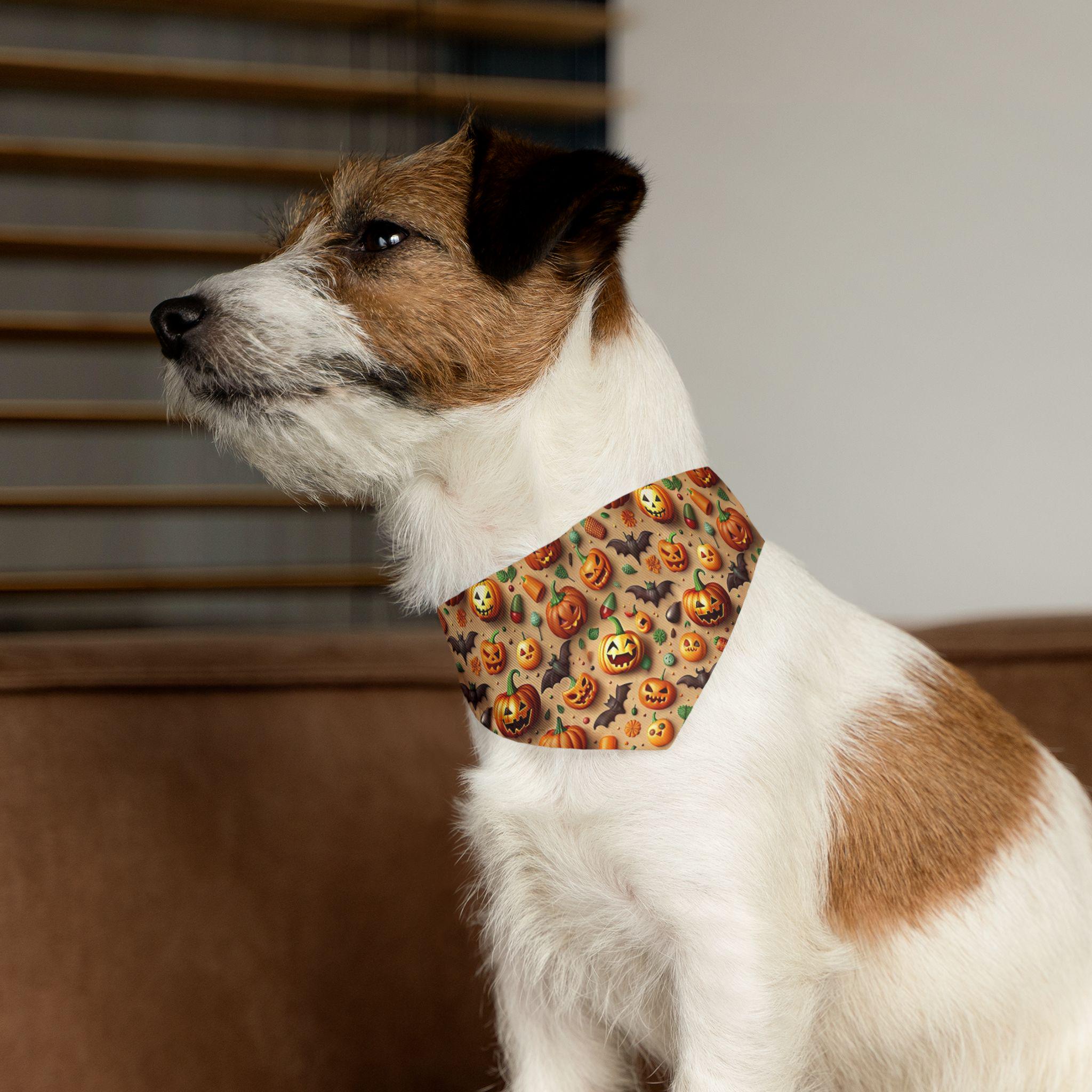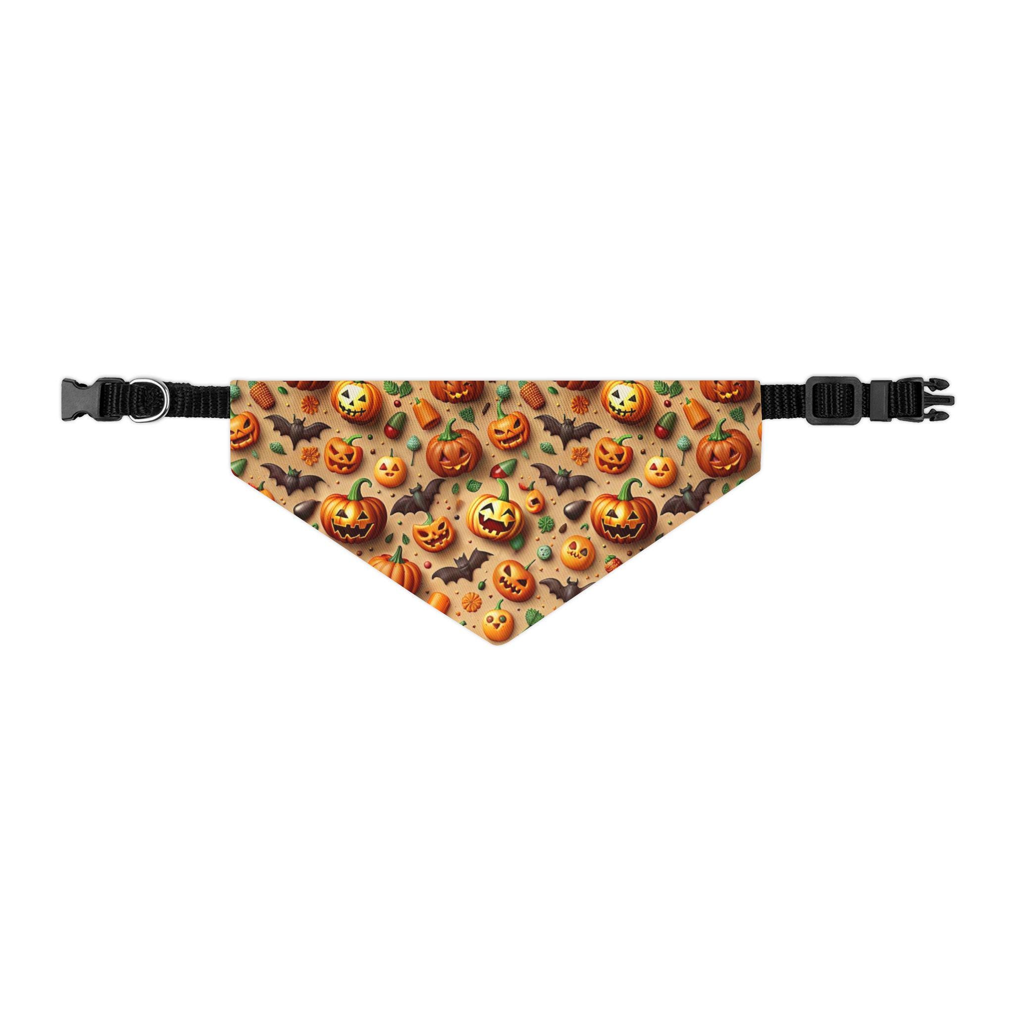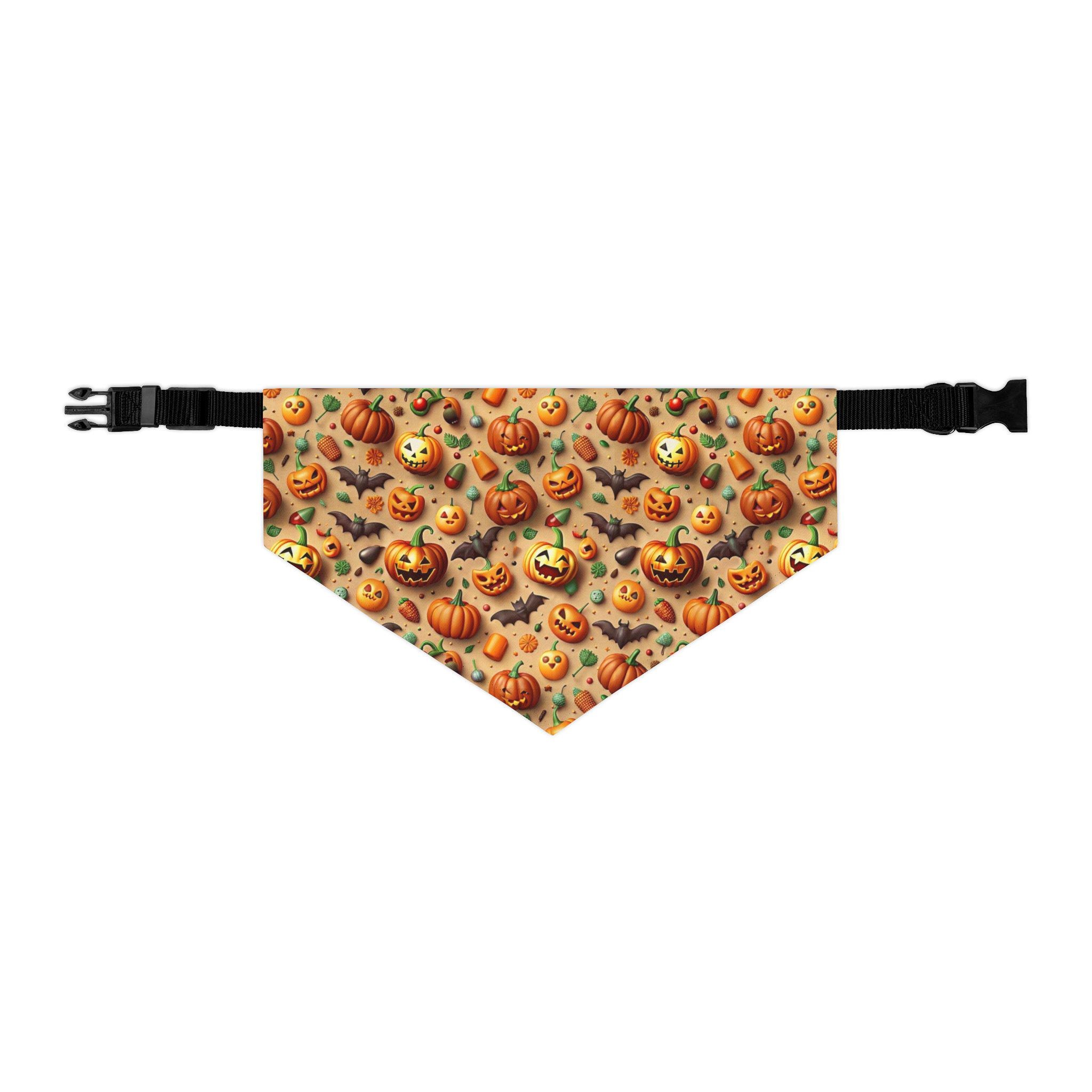 Dress your furry friend in style with this eye-catching pet bandana collar. The vibrant all-over print featuring playful pumpkins and spooky motifs creates a fun atmosphere, perfect for autumn festivities. Whether it's Halloween or a casual fall outing, this bandana adds a charming touch to your pet's wardrobe. The adjustable strap ensures a snug fit for pets of all sizes, making it suitable for both small and large companions. Ideal for pet owners who cherish seasonal celebrations, this bandana is a must-have for festive family gatherings. Give your pet a fashionable lift with a collar that showcases their personality, making every moment with them even more special!
