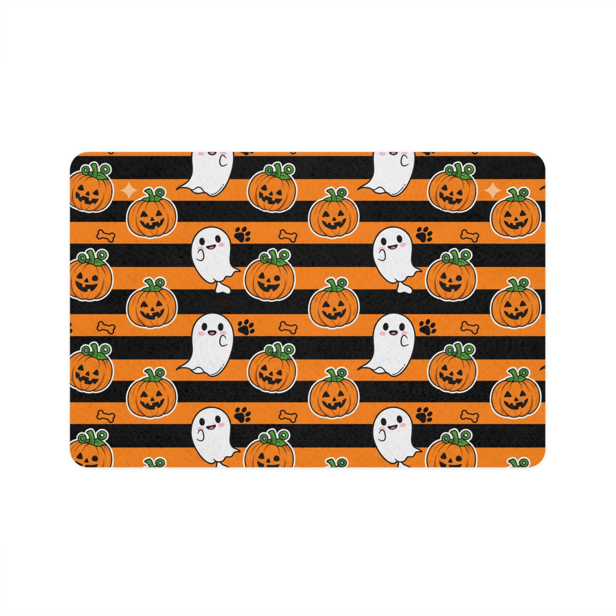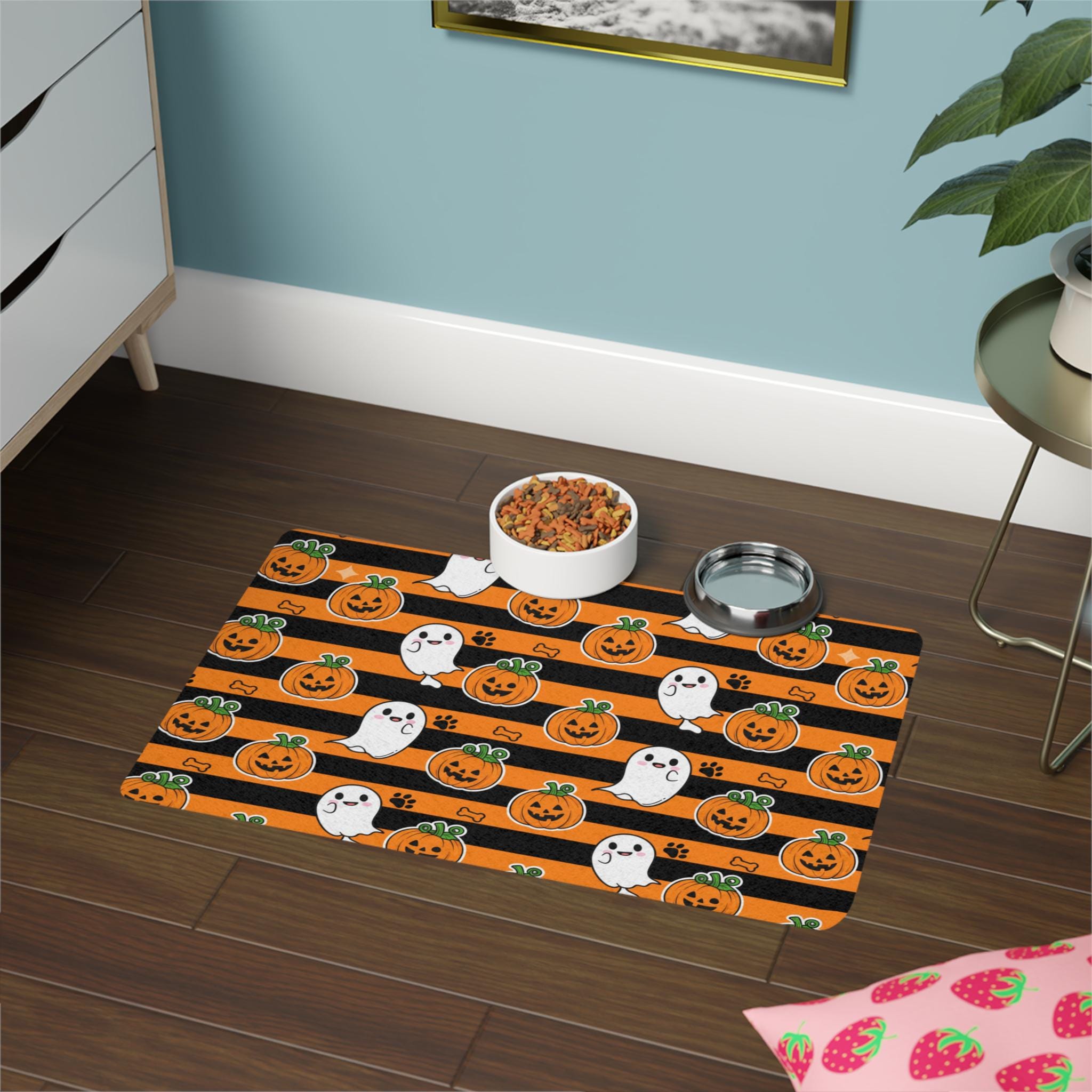 Elevate your pet's dining experience with this charming Pet Food Mat. Featuring a playful Halloween-themed design with ghosts and pumpkins, it brings a fun and festive touch to your home. This mat is perfect for pet owners who love to celebrate the spooky season and want to add personality to their pets' feeding area. It's ideal for households with cats and dogs of all sizes, making mealtime enjoyable and vibrant. Enjoy cozy autumn nights with your furry friend, as this mat is a delightful addition to Halloween festivities, pet birthdays, or just for everyday joy.
