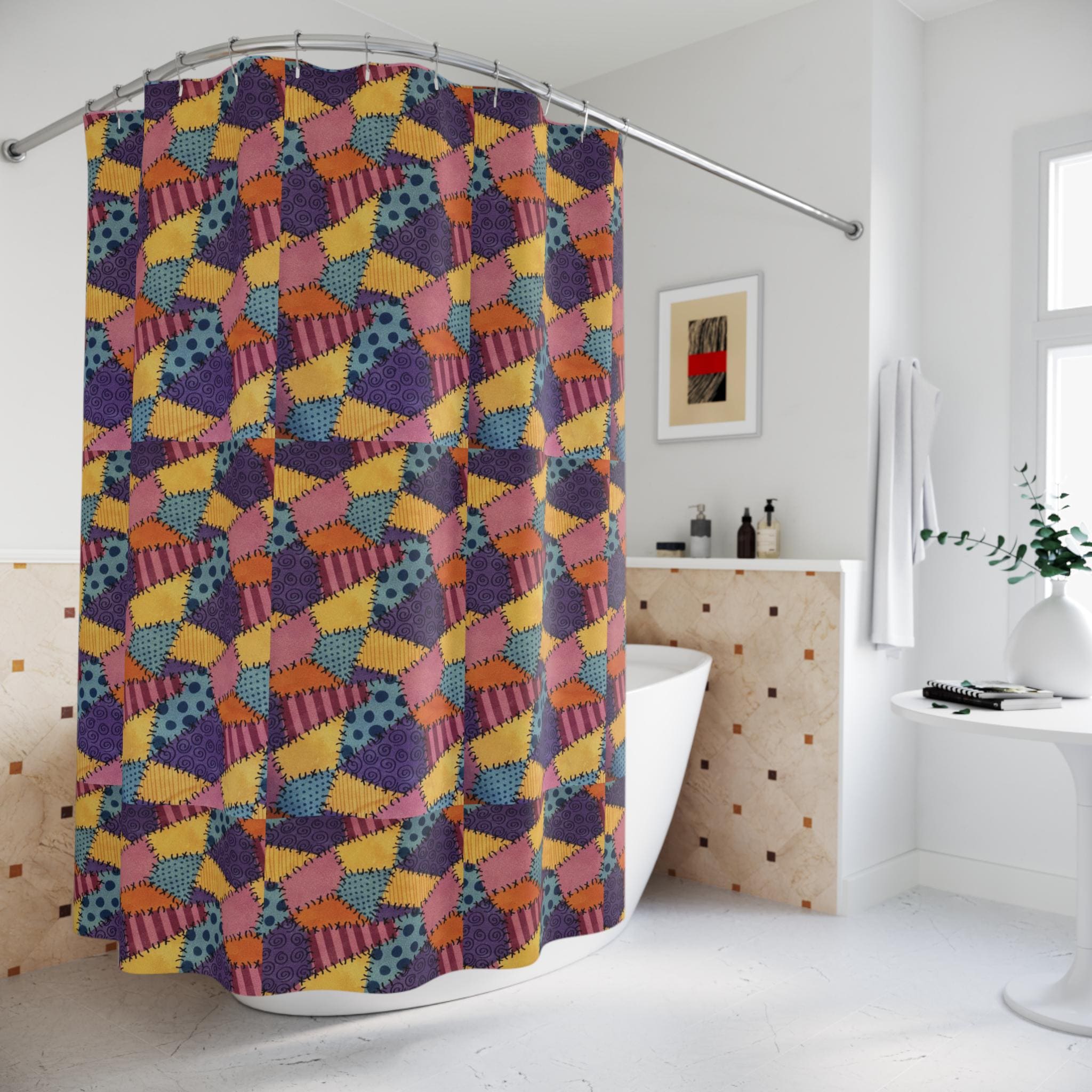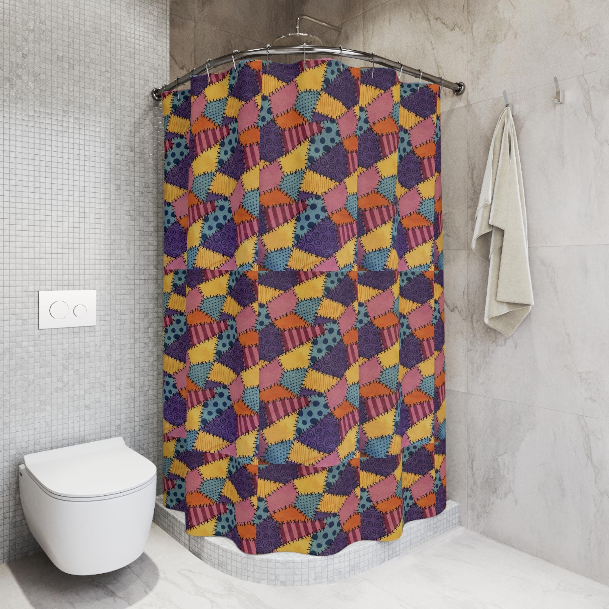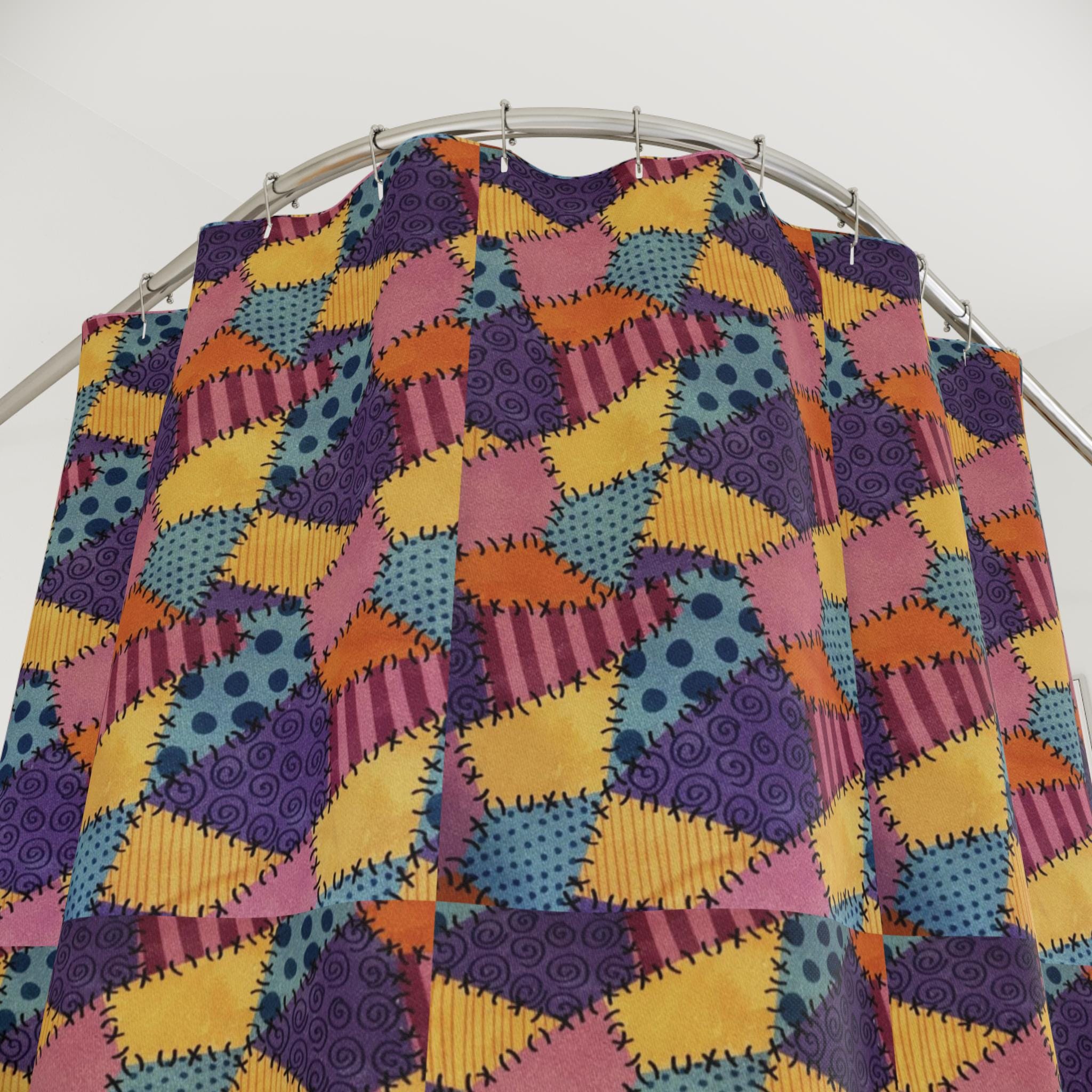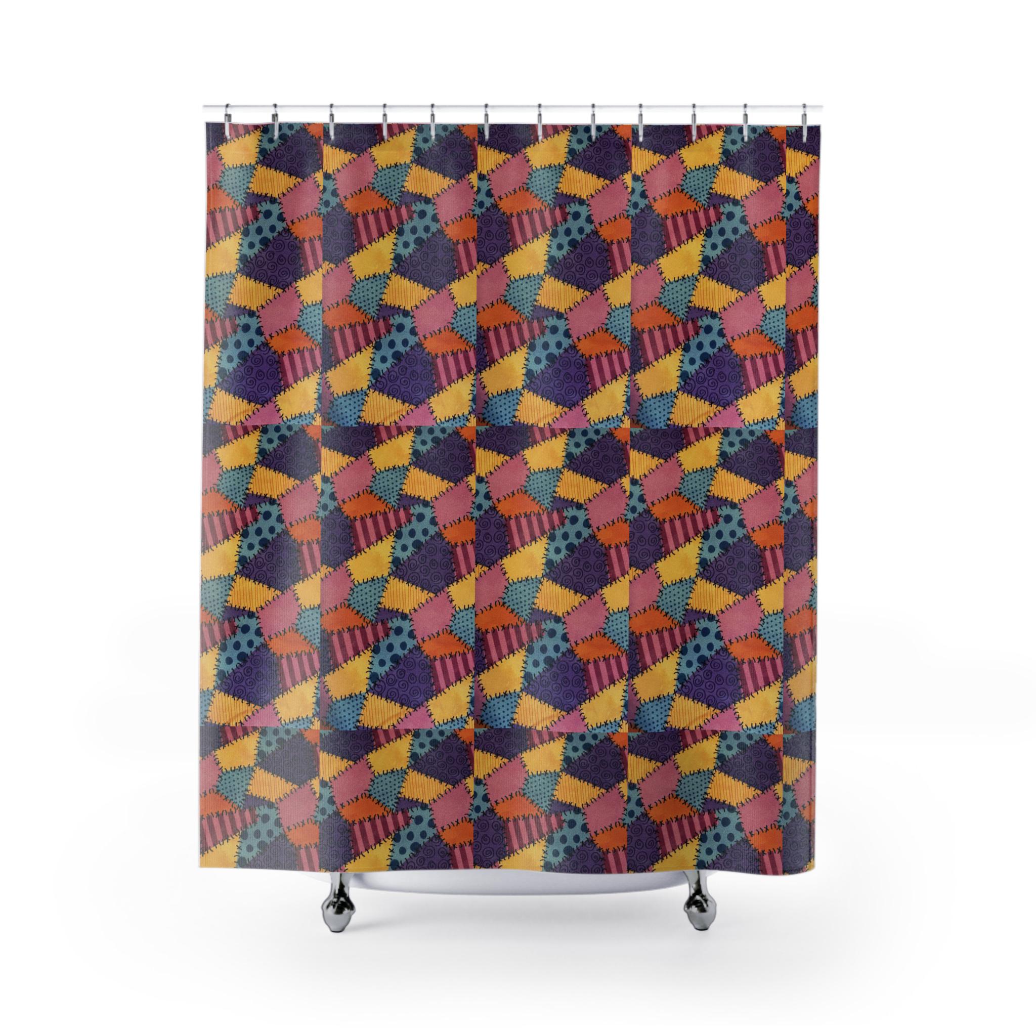 Bring a playful, cozy energy into your bathroom with this vibrant polyester shower curtain. The design layers stitched-patchwork motifs — bold yellows, deep purples, warm pinks and turquoise accents — into a lively, quilt-like repeat that feels both nostalgic and modern. The durable 100% polyester fabric resists wrinkles and dries quickly, so the pattern stays vivid through daily use. Twelve reinforced buttonholes along the top make hanging simple with standard hooks (not included). This curtain sets a cheerful, lived-in tone: imagine stepping into a warm, artful space that feels handcrafted, like the home of someone who loves color, texture and a little vintage flair. Size may vary slightly (+/- 2”) and the print appears on one side.