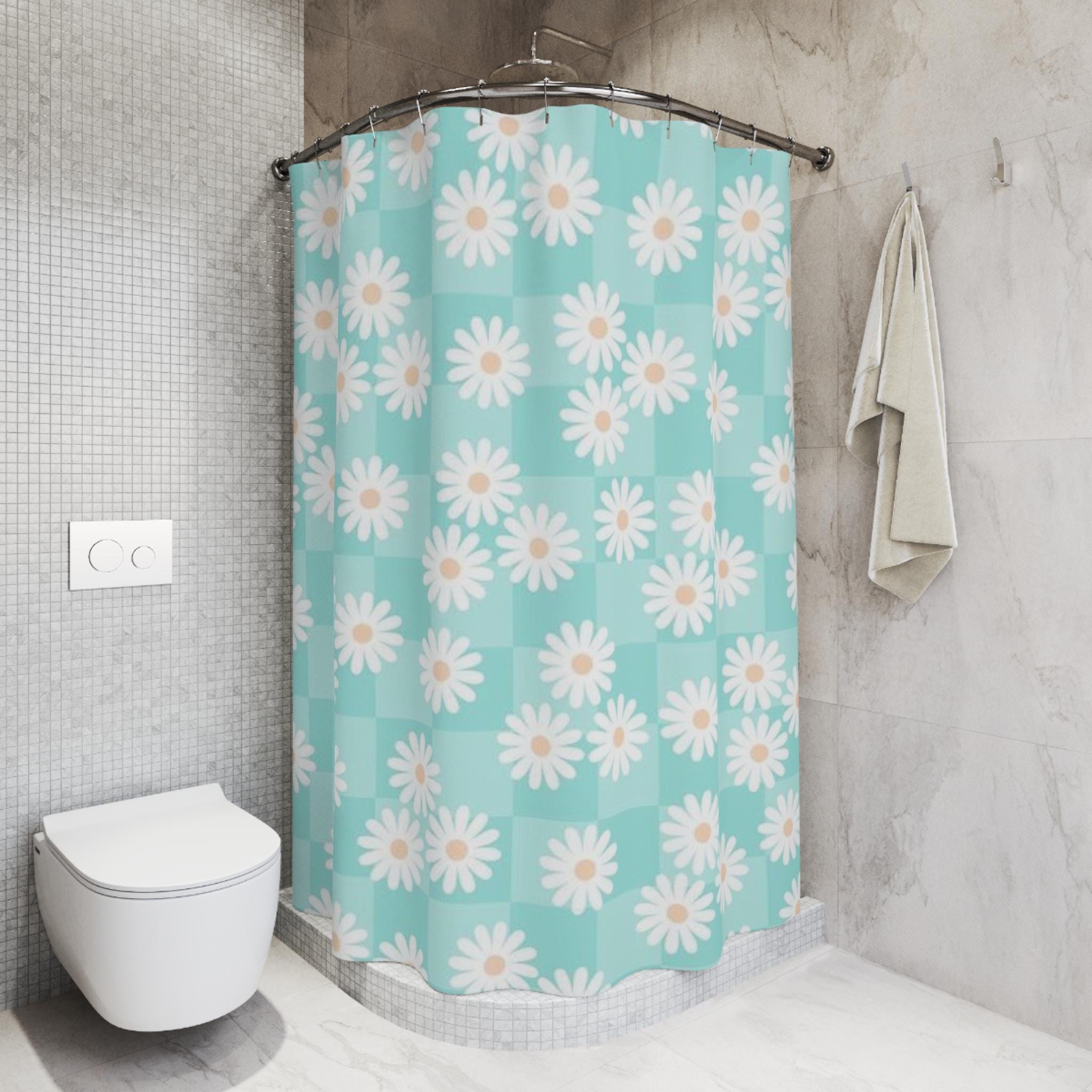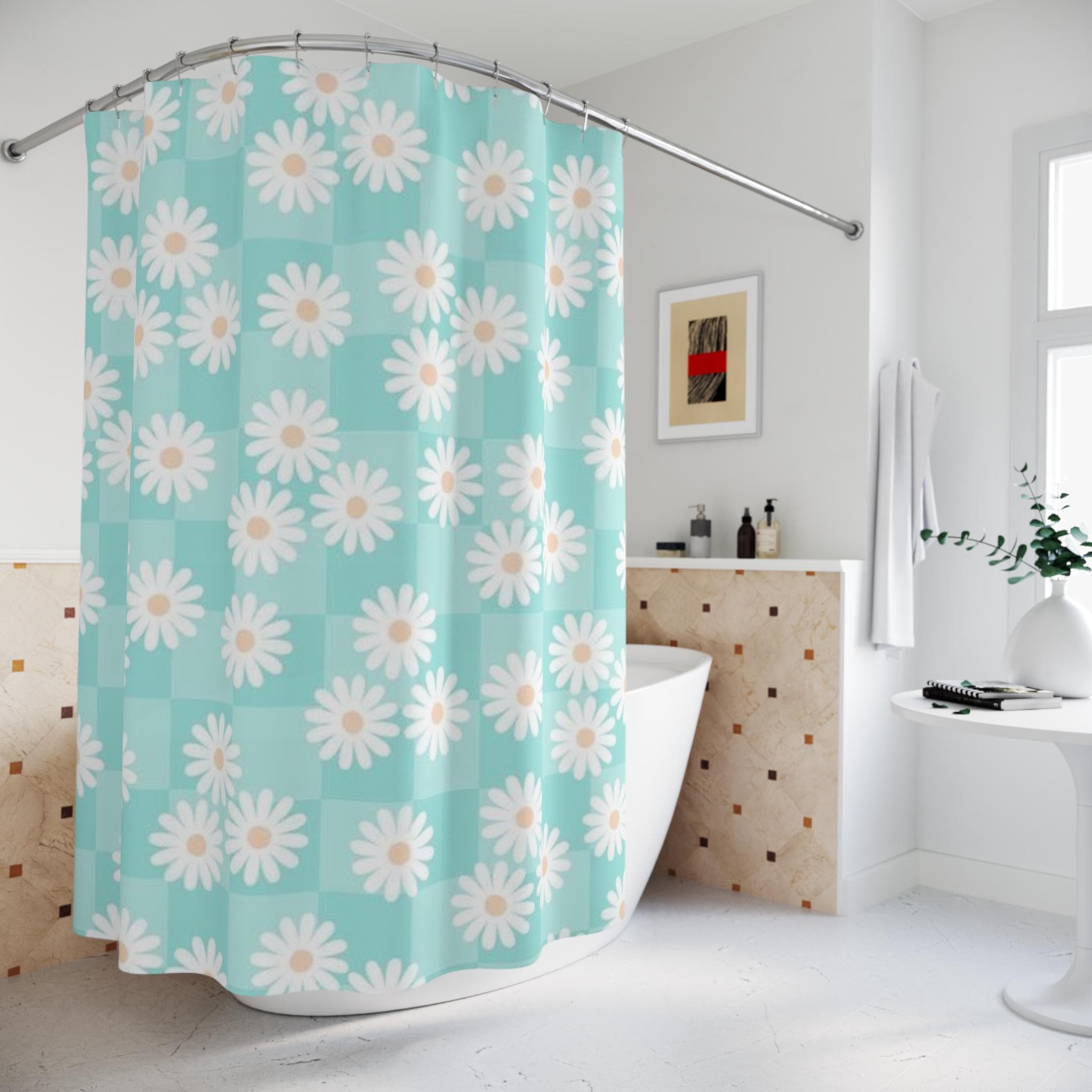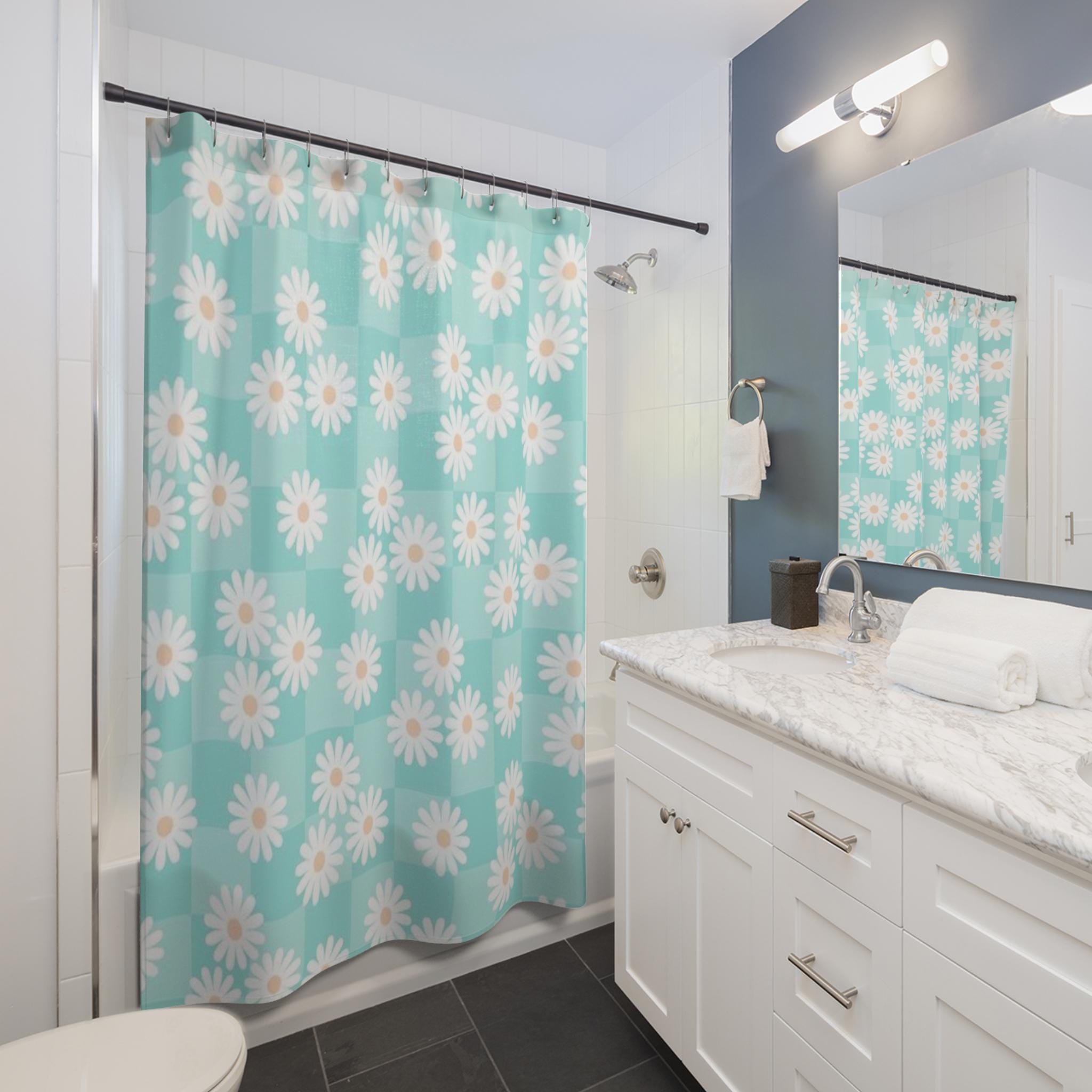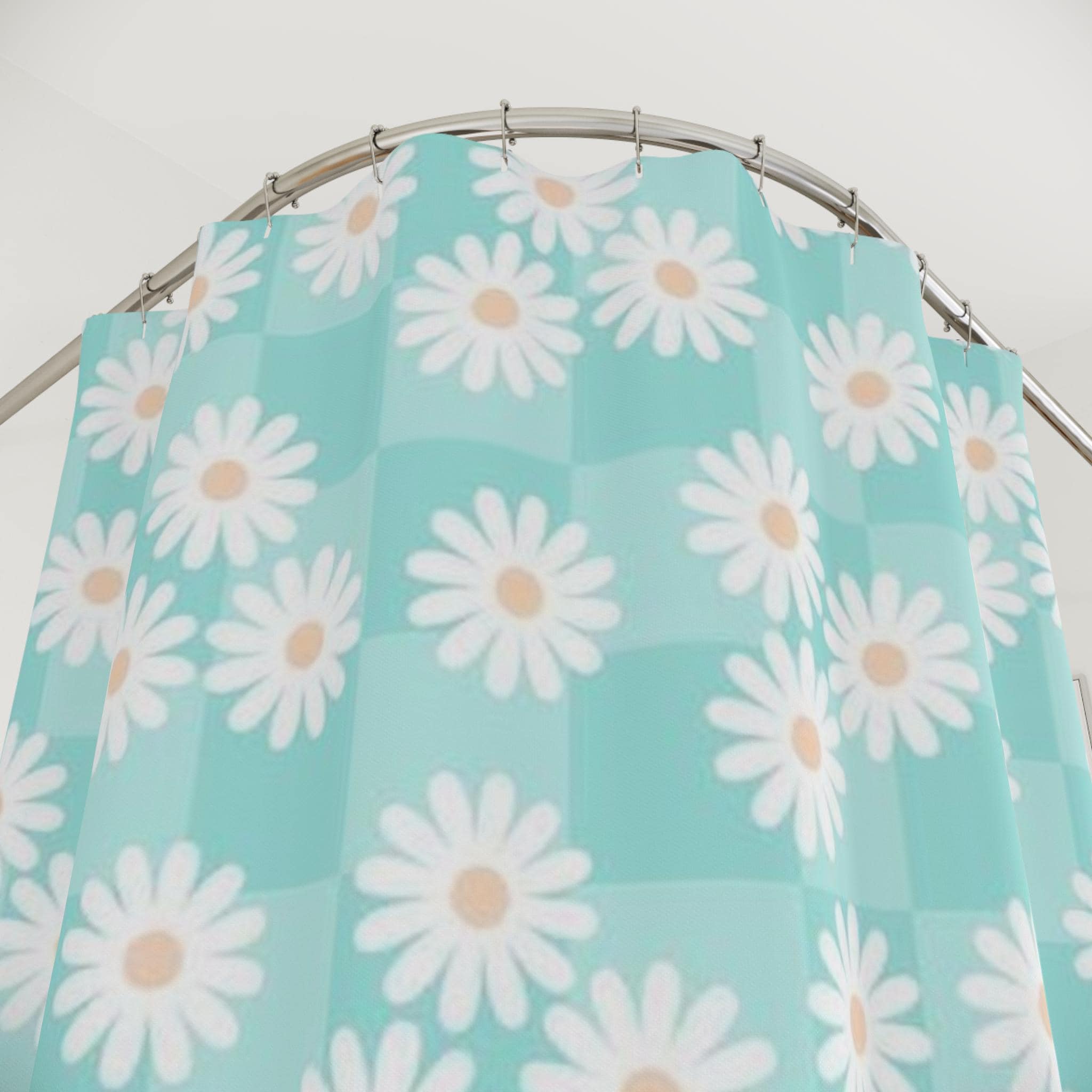 Bright, cheerful daisies bloom across a soft aqua checkerboard, bringing a light, vintage-meets-modern mood to your bathroom. The polyester curtain hangs with 12 top buttonholes for standard hooks (not included) and offers a single-sided print that reads beautifully from inside the shower. Lightweight and quick-drying, it keeps colors vivid while standing up to daily use. This shower curtain translates a sunny, cottage-core vibe into everyday ritual — morning routines feel fresher, small bathrooms feel airier, and guests notice the playful, nostalgic pattern.