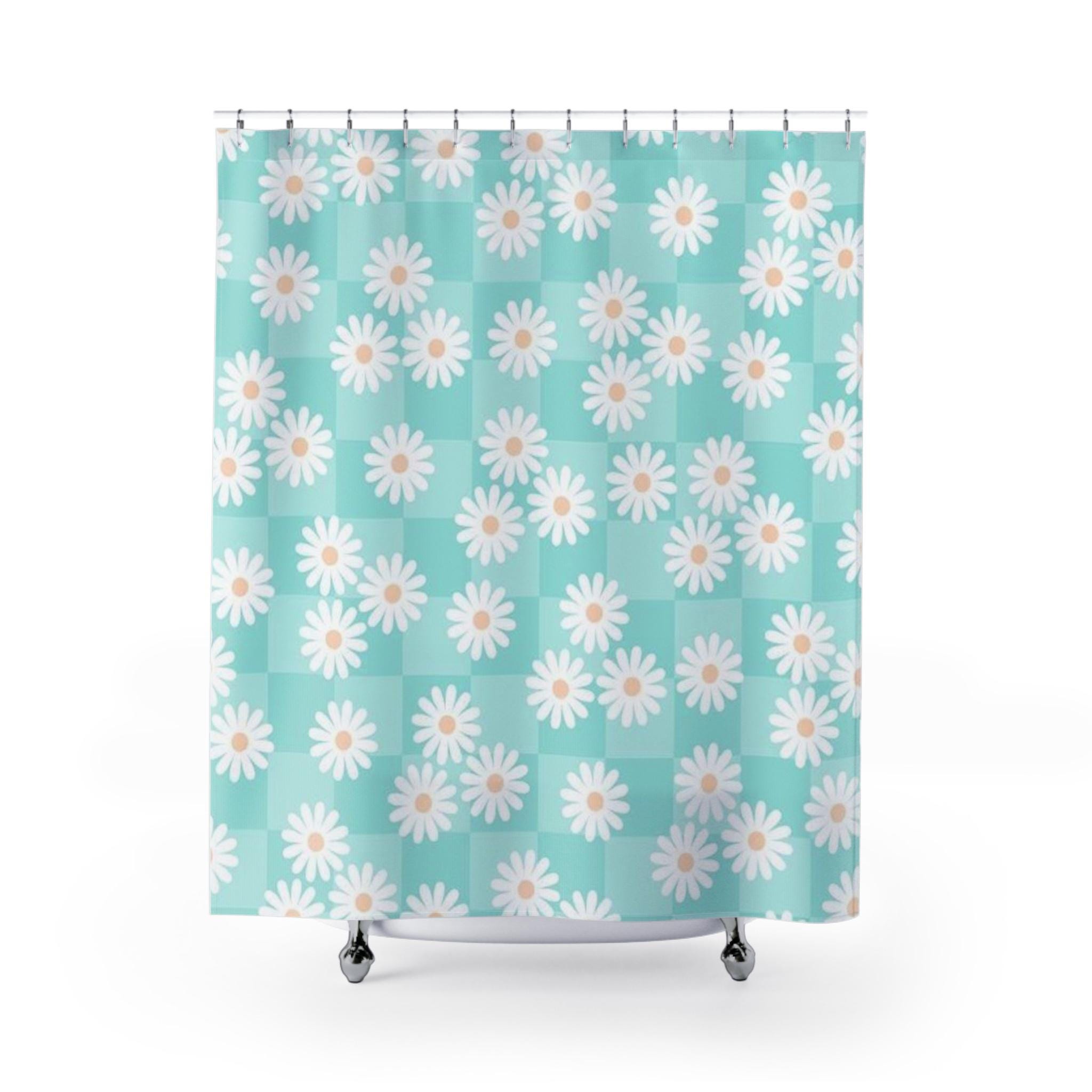 Product features - 100% polyester fabric — durable, shape-retaining, quick-drying - Single-sided print with vivid, soft aqua and daisy checker pattern - 12 buttonholes at the top for standard hook placement (hooks not included) - Pre-constructed size with possible variance of +/- 2 inches - Adult-use shower curtain; lightweight and easy to hang