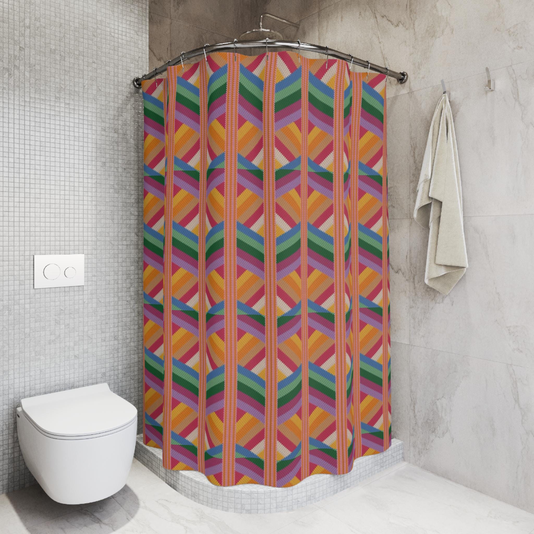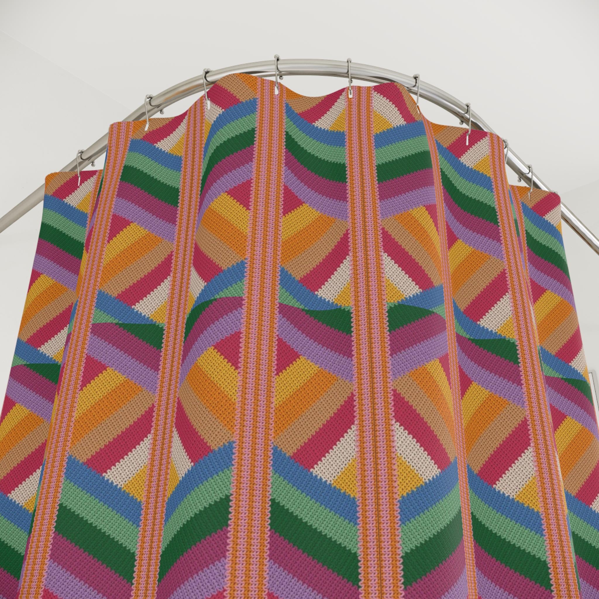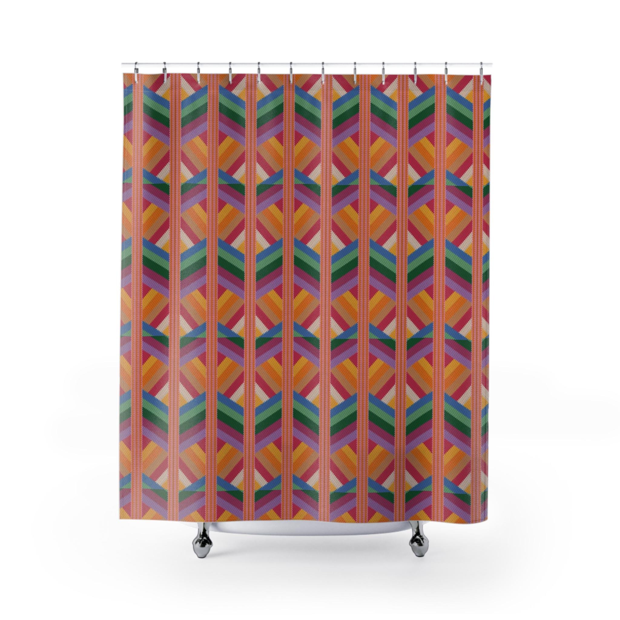 Bright, graphic, and unapologetically joyful — this polyester shower curtain turns a morning routine into a little celebration. Layered stripes and chevron shapes in warm oranges, pinks, greens, and blues create a rhythmic, retro-modern pattern that brings movement and color to the bathroom. The fabric hangs with soft drape, resists quick moisture, and shows the design on the front face for a bold visual from the doorway. It's the kind of piece that lifts a small space: imagine sunlight sliding across the repeating pattern and a ceramic sink catching the same tones. For those who love color-driven interiors and vintage-inspired geometrics, this curtain adds personality without fuss. Install with 12 standard hooks (not included) and enjoy an instant style update for daily routines or when hosting friends overnight.