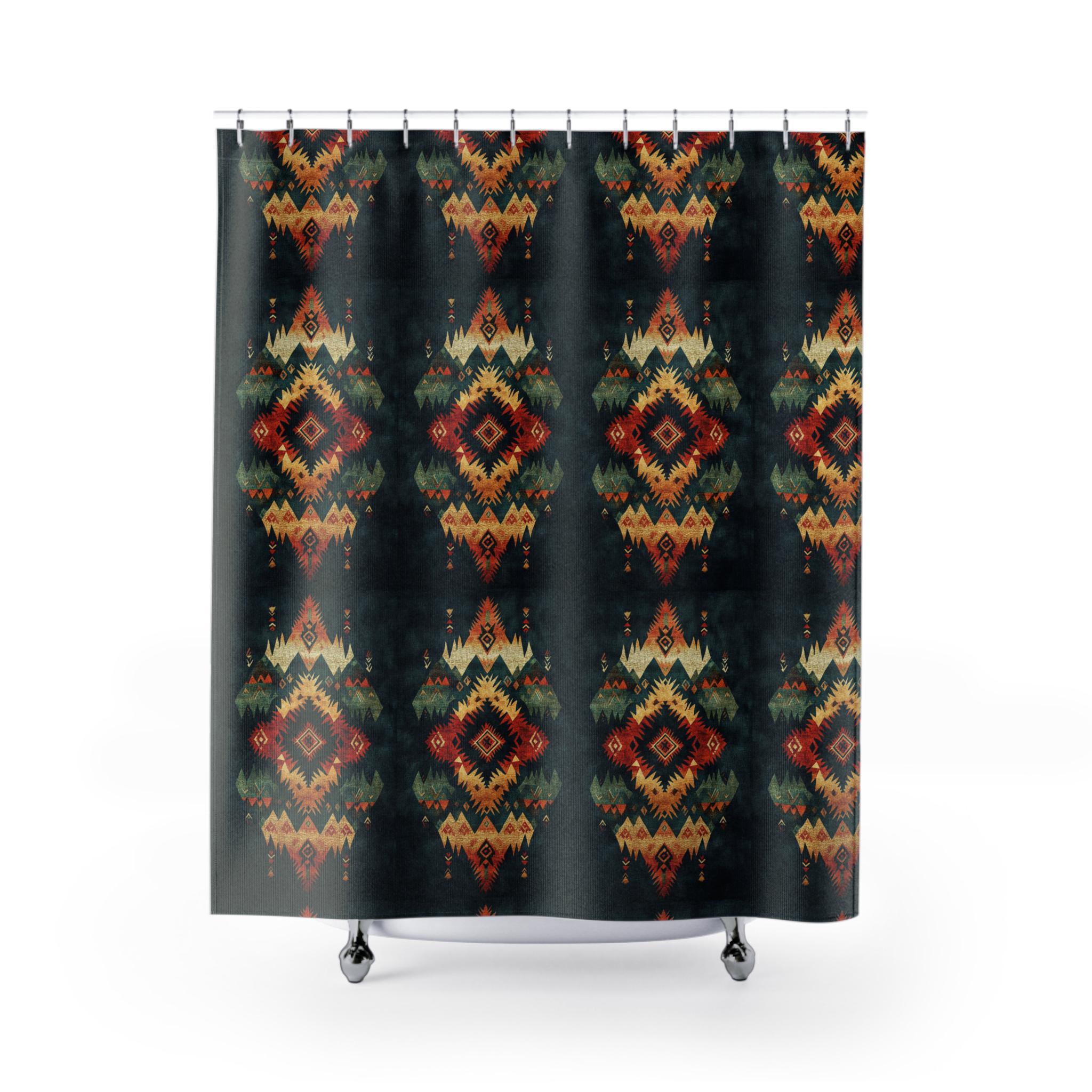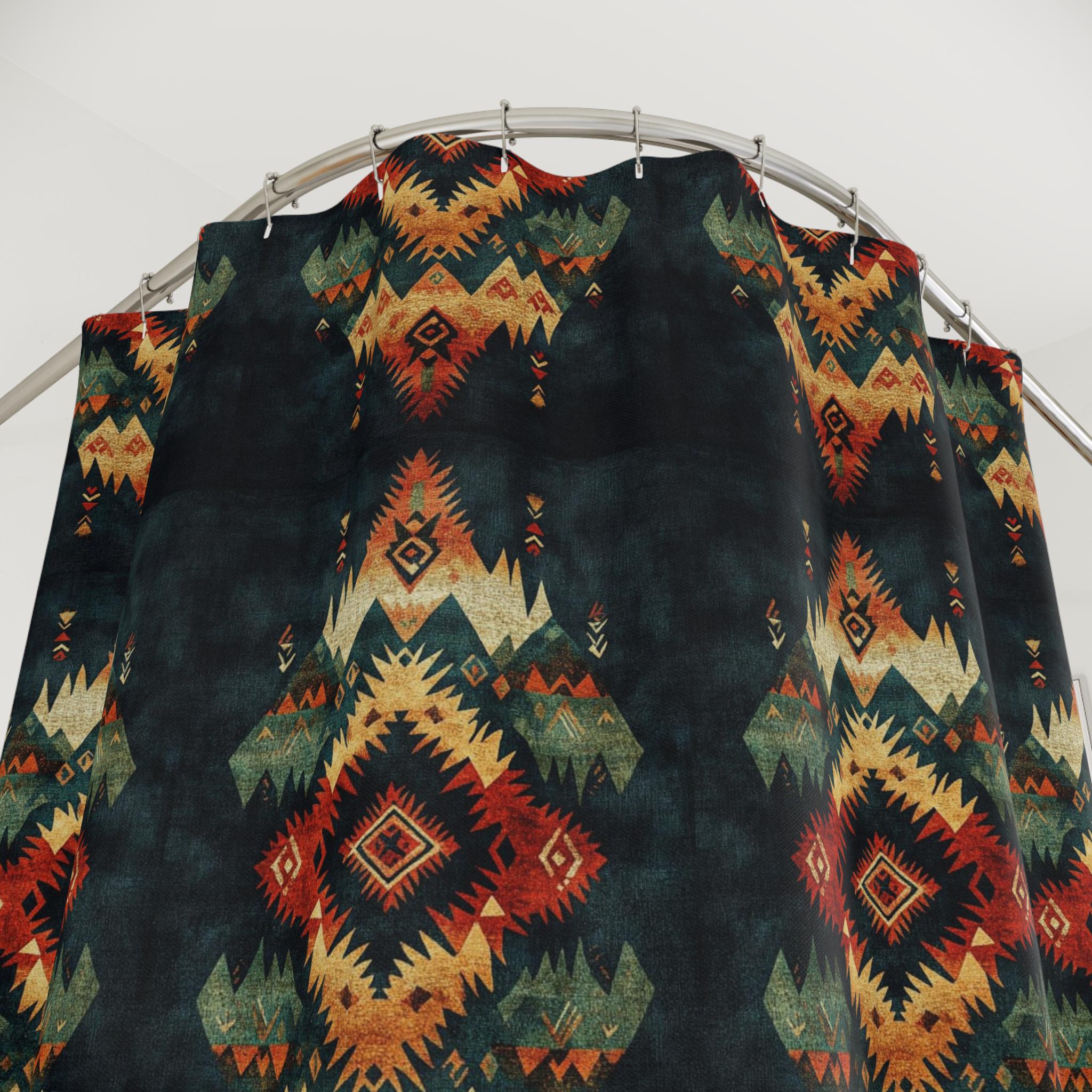 This shower curtain brings rich, warm patterning into the bathroom — deep emerald and charcoal fields punctuated by sunlit ocher and rust diamond motifs. The slightly faded, hand-dyed look creates a cozy, lived-in mood, like a well-traveled textile hung to dry in a mountain cabin. Hang it to anchor a moody bath with layered textures: matte tiles, wooden accents, and brass or black hardware. It's for people who prefer soulful, earthy decor and want their small spaces to feel curated and comforting.