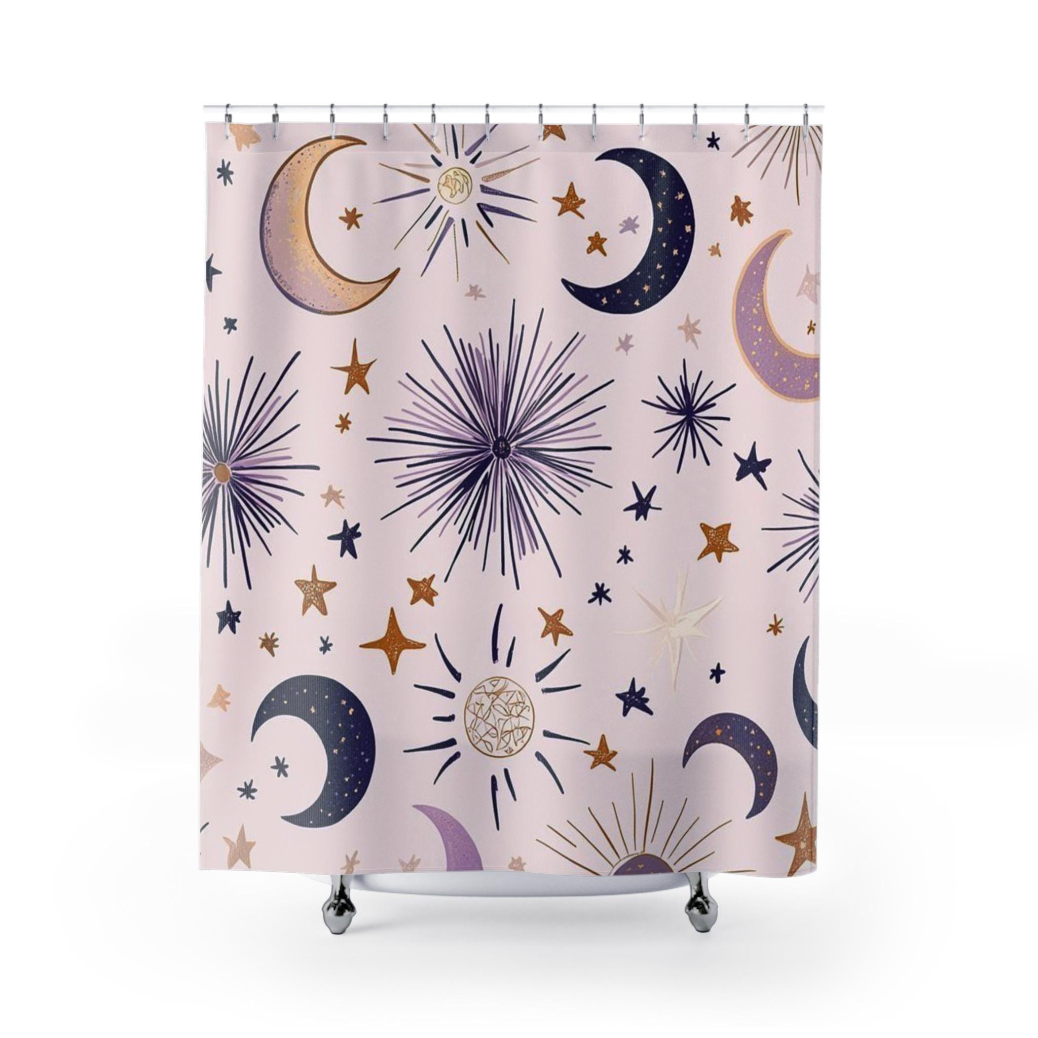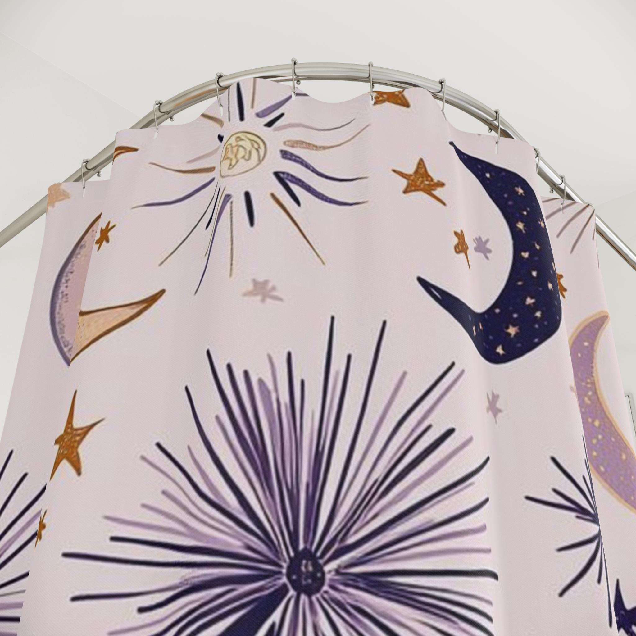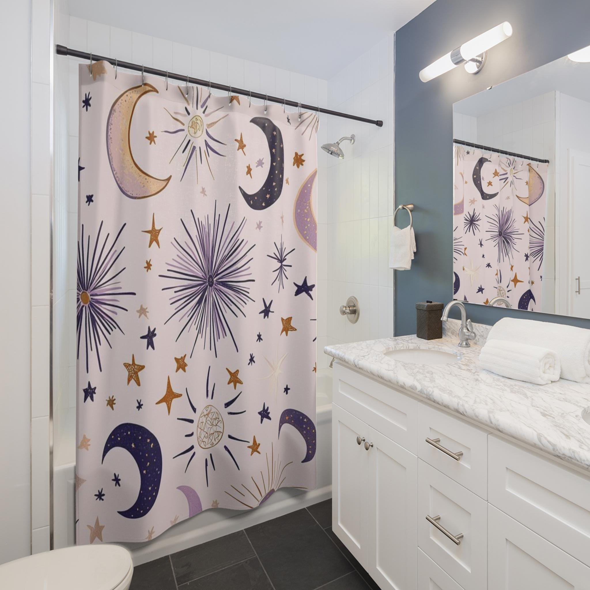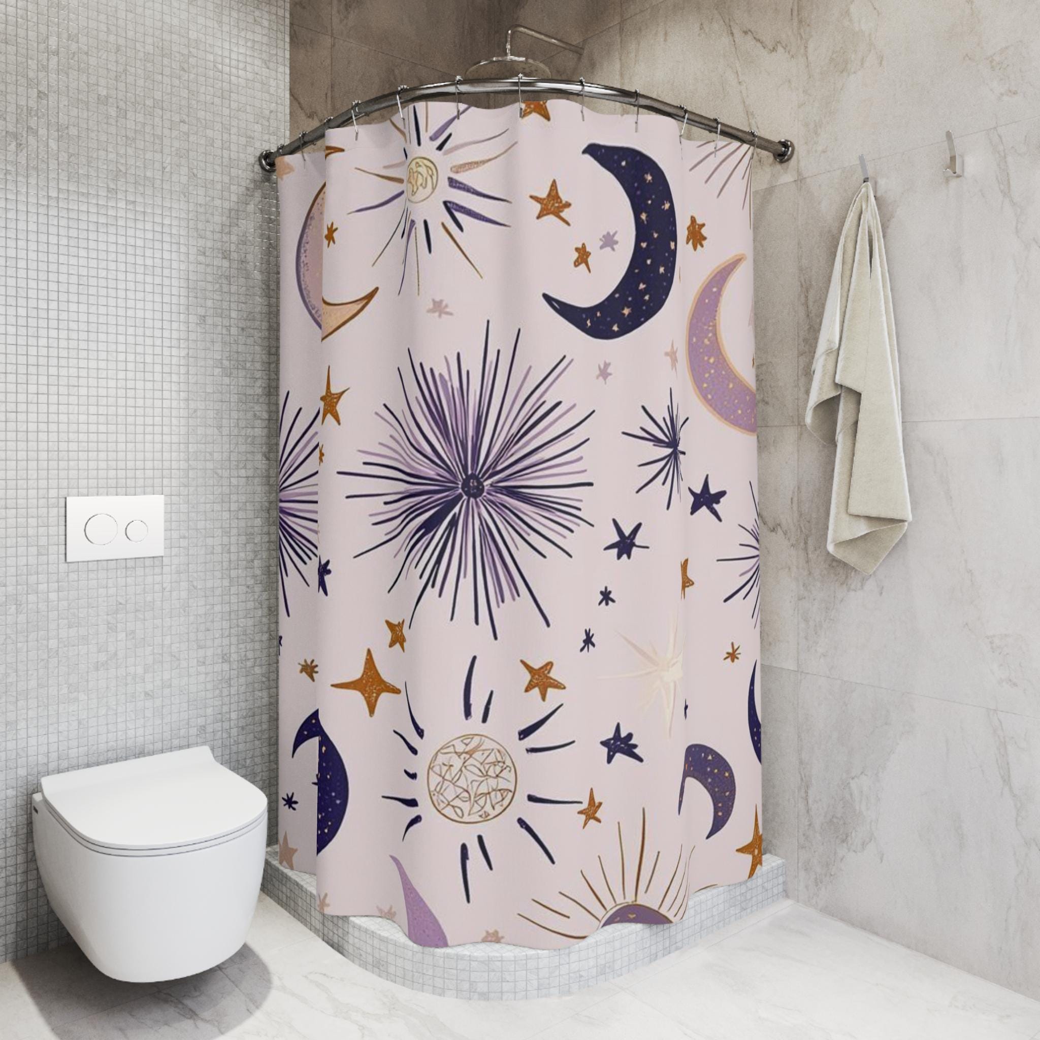 Float into a gentle, star-swept evening every time you step into the bathroom. This polyester shower curtain brings soft moons, scattered stars, and burst-like celestial florals in muted mauves, deep navy, and warm golds. The one-sided print reads like a hand-painted night sky on a pale blush background — calming, whimsical, and quietly sophisticated. It hangs with twelve buttonholes for standard hooks (hooks not included) and drapes with a light, durable feel that dries quickly. Use it to transform a routine shower into a small, personal ritual: dim the lights, let the pattern catch the glow, and breathe. A thoughtful way to add subtle cosmic charm to a grown-up bathroom or an intimate, self-care space for evenings when you need a little wonder.