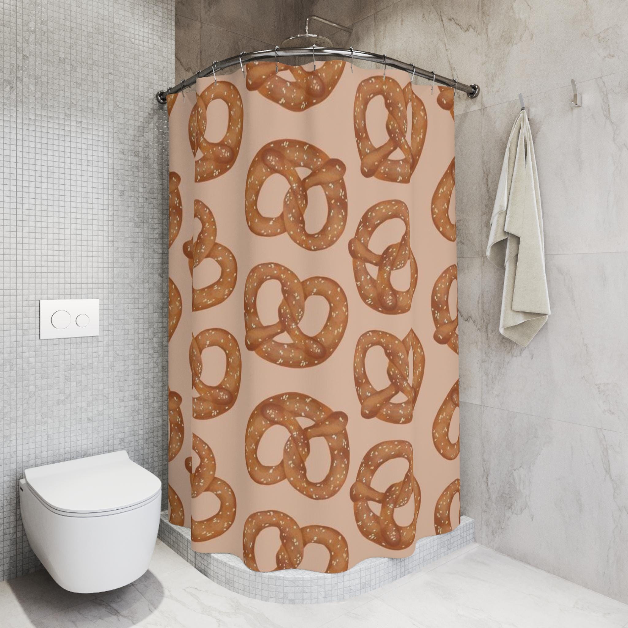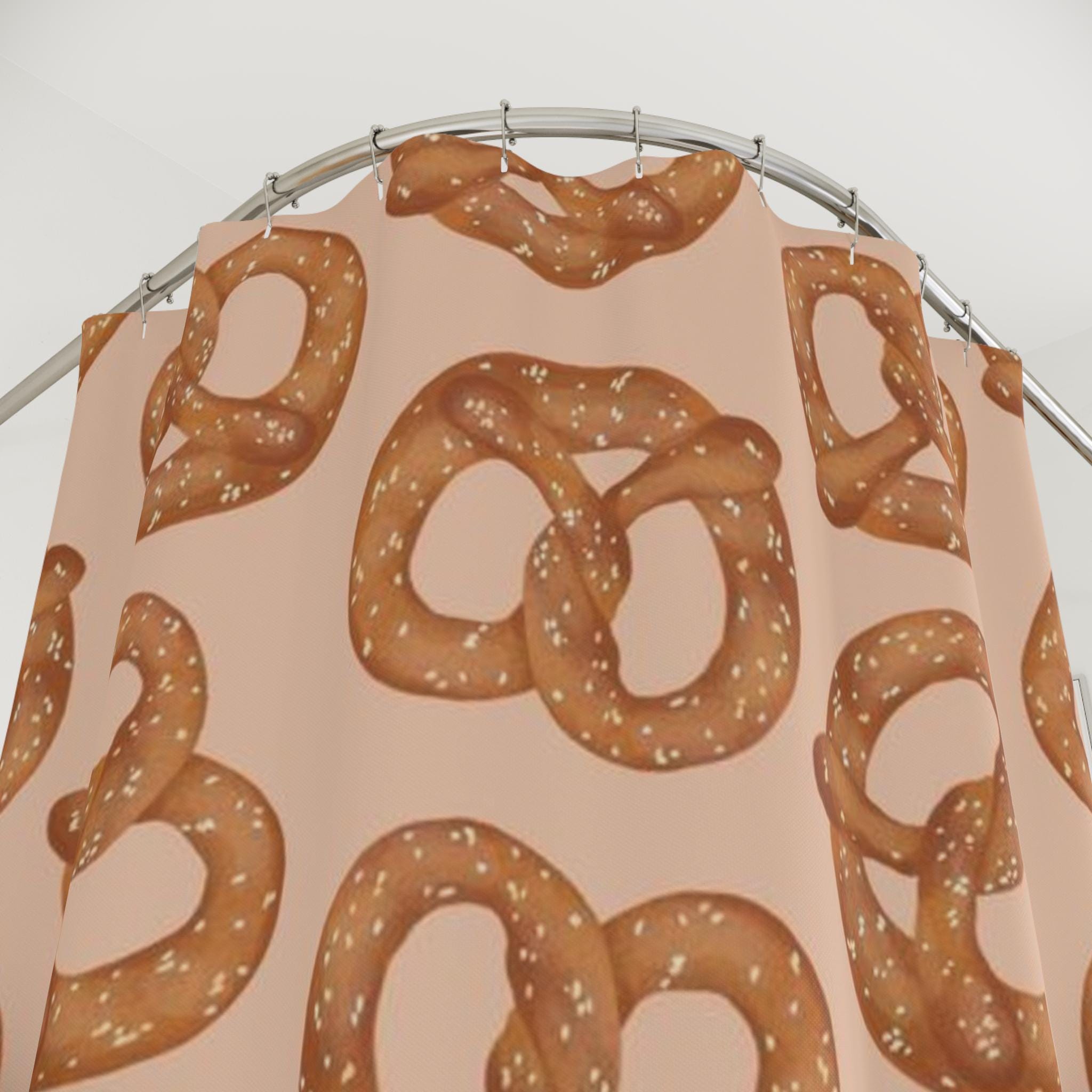 Turn your bathroom into a warm, playful nook with this pretzel-pattern shower curtain. The soft blush background and hand-painted salted pretzels bring a cozy, bakery-inspired vibe that feels both homey and slightly whimsical. Lightweight yet durable polyester lets the colors stay vibrant while drying quickly after each shower. Hang it up and you'll notice how the repeating pretzel motif adds texture and a touch of personality — a subtle conversation starter that makes morning routines feel a little brighter.