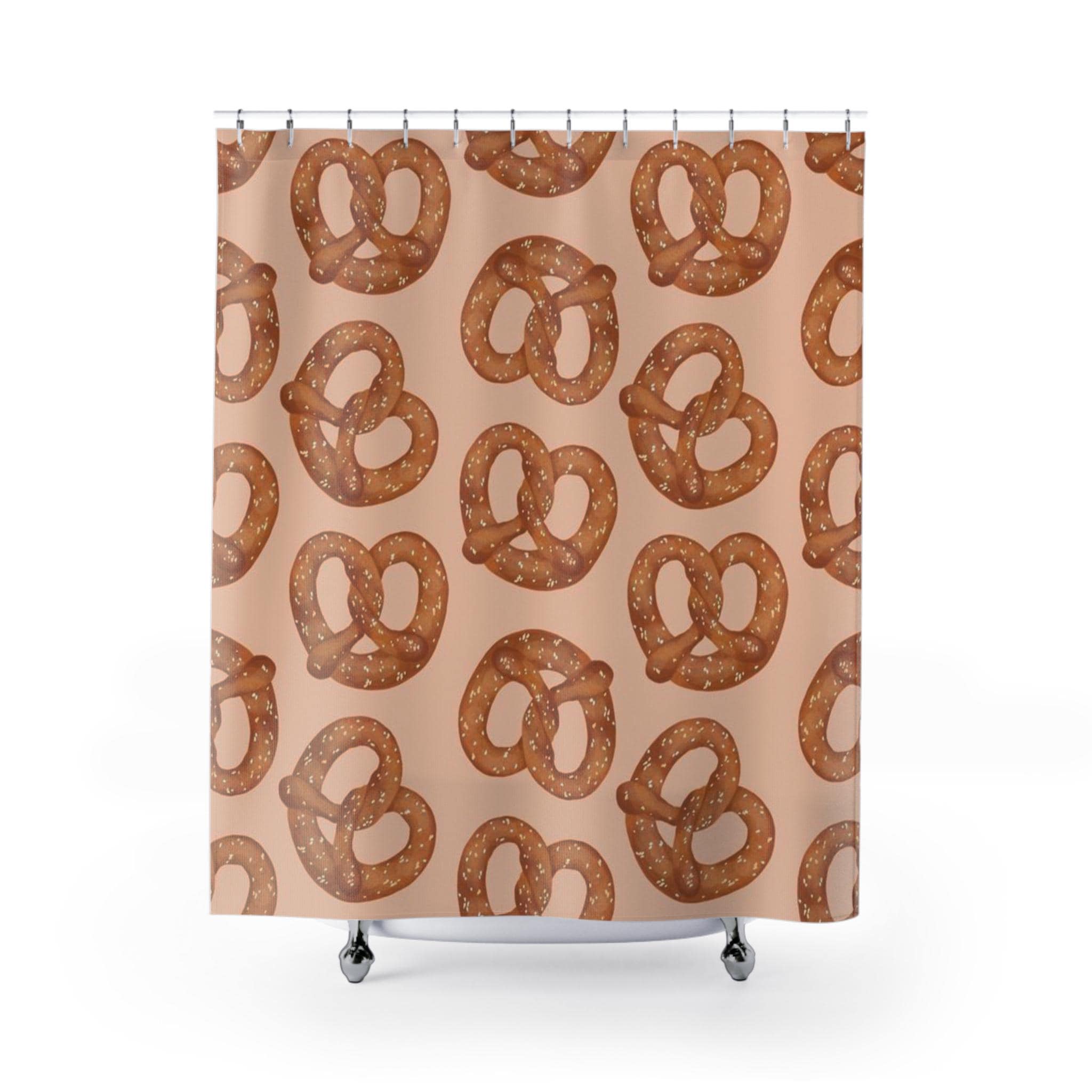 Product features - 100% polyester — strong, shape-retaining, and quick-drying - One-sided print with vibrant, bakery-inspired pretzel motif - 12 top buttonholes for standard shower hooks (hooks not included) - Adult-sized, pre-constructed panel with size variance of +/- 2" - Lightweight and durable for daily bathroom use