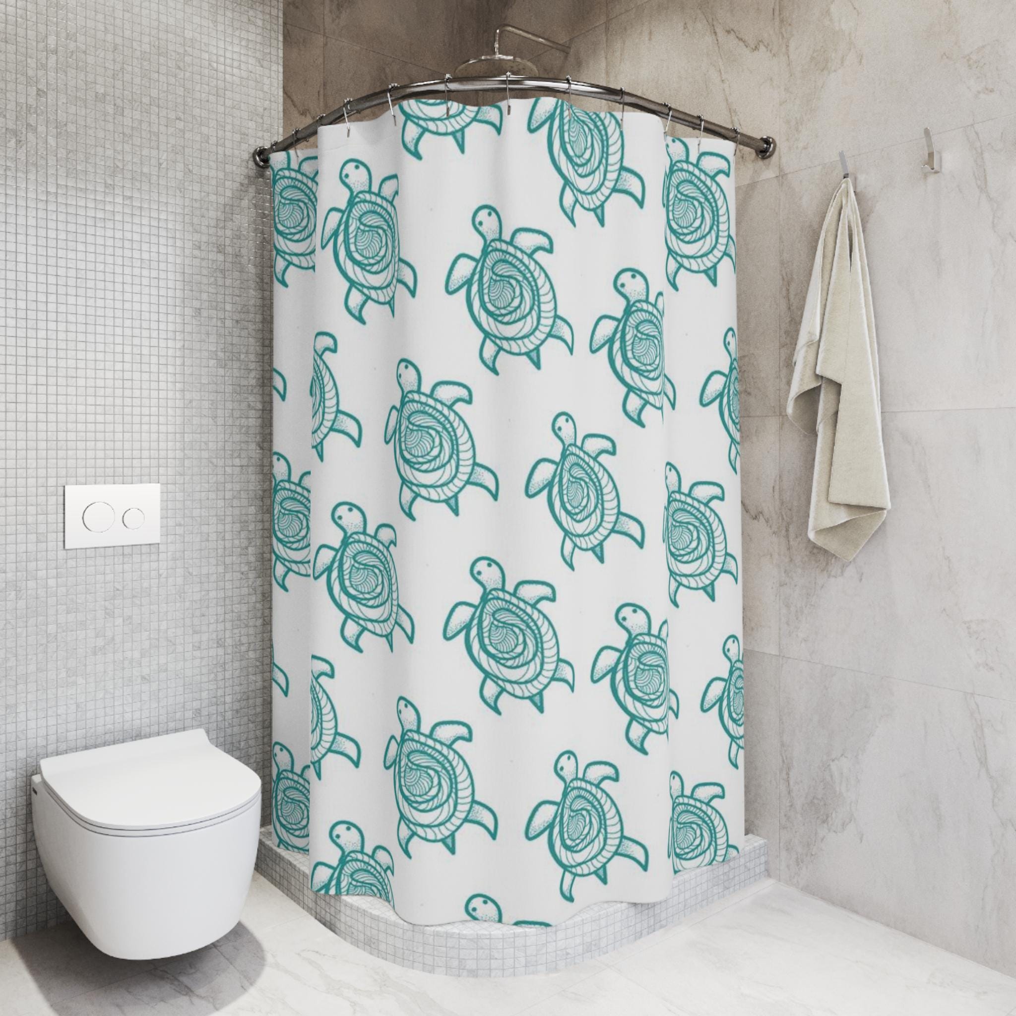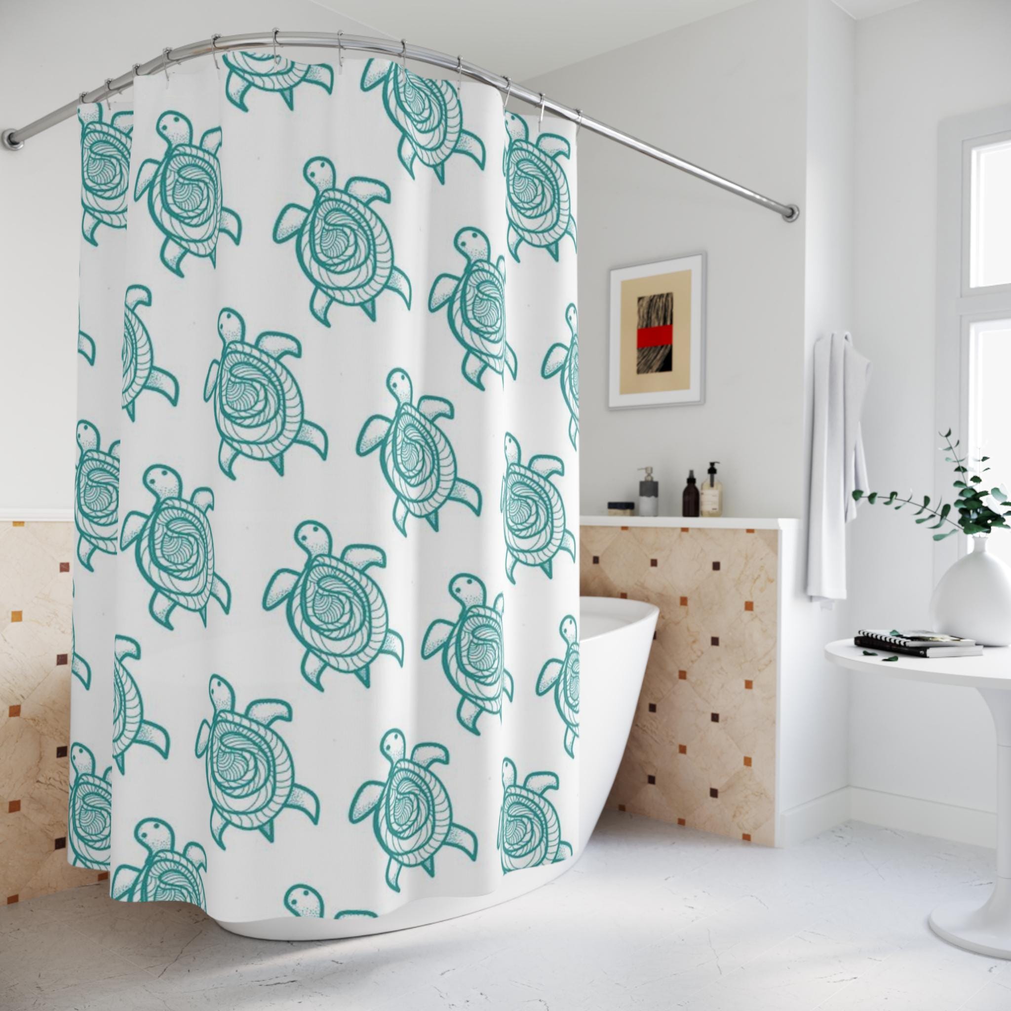 Let the bathroom feel like a quiet coastal morning. This shower curtain shows a hand-drawn sea turtle motif in gentle aqua tones on a clean white field. The repeated turtles float across the fabric with a breezy, organic rhythm — subtle enough to blend with minimalist decor, but charming enough to give the room character. Hang it to bring a calm, seaside energy to daily routines. The quick-drying polyester keeps the pattern crisp and the fabric light, so the print reads beautifully whether the curtain is drawn or folded back on the rod.