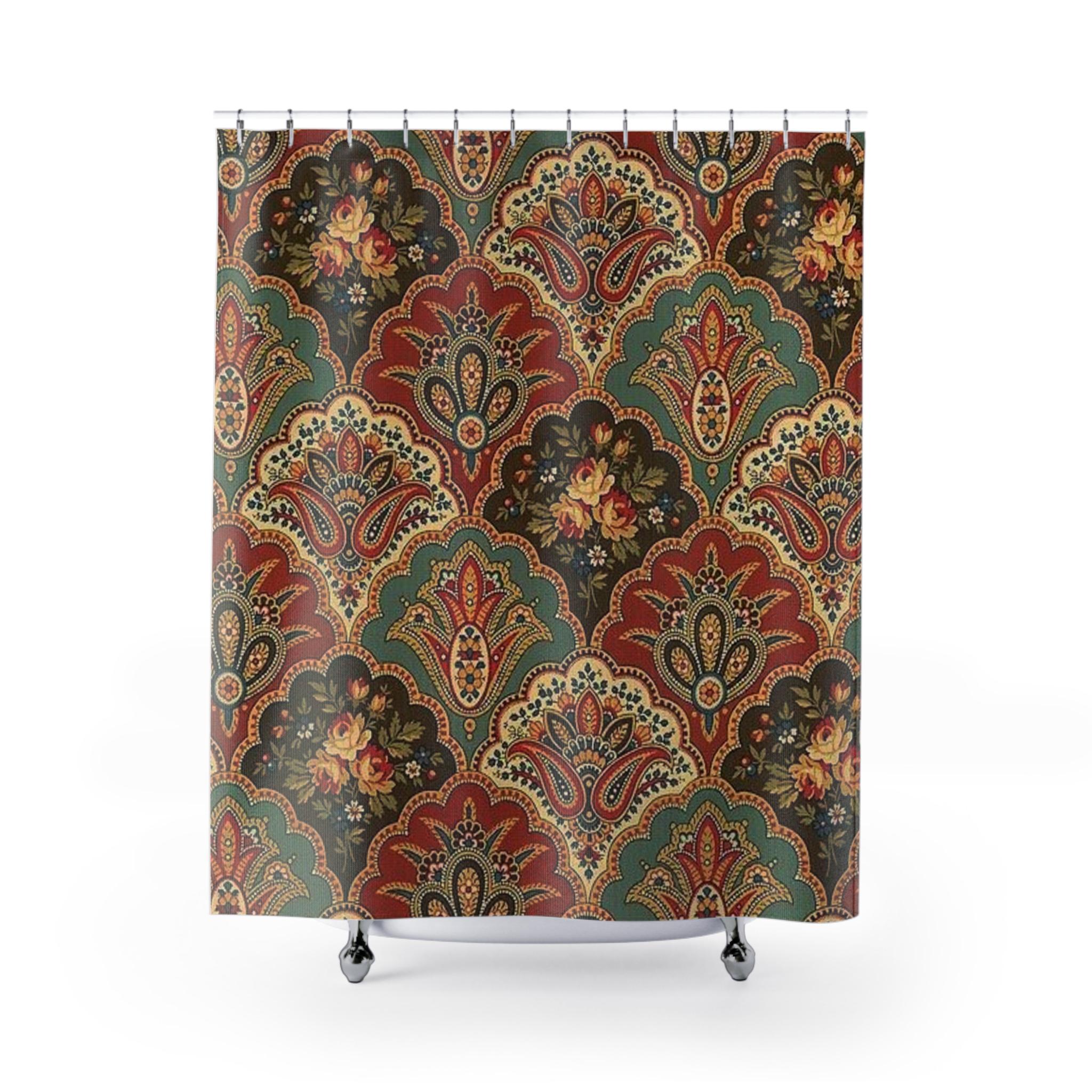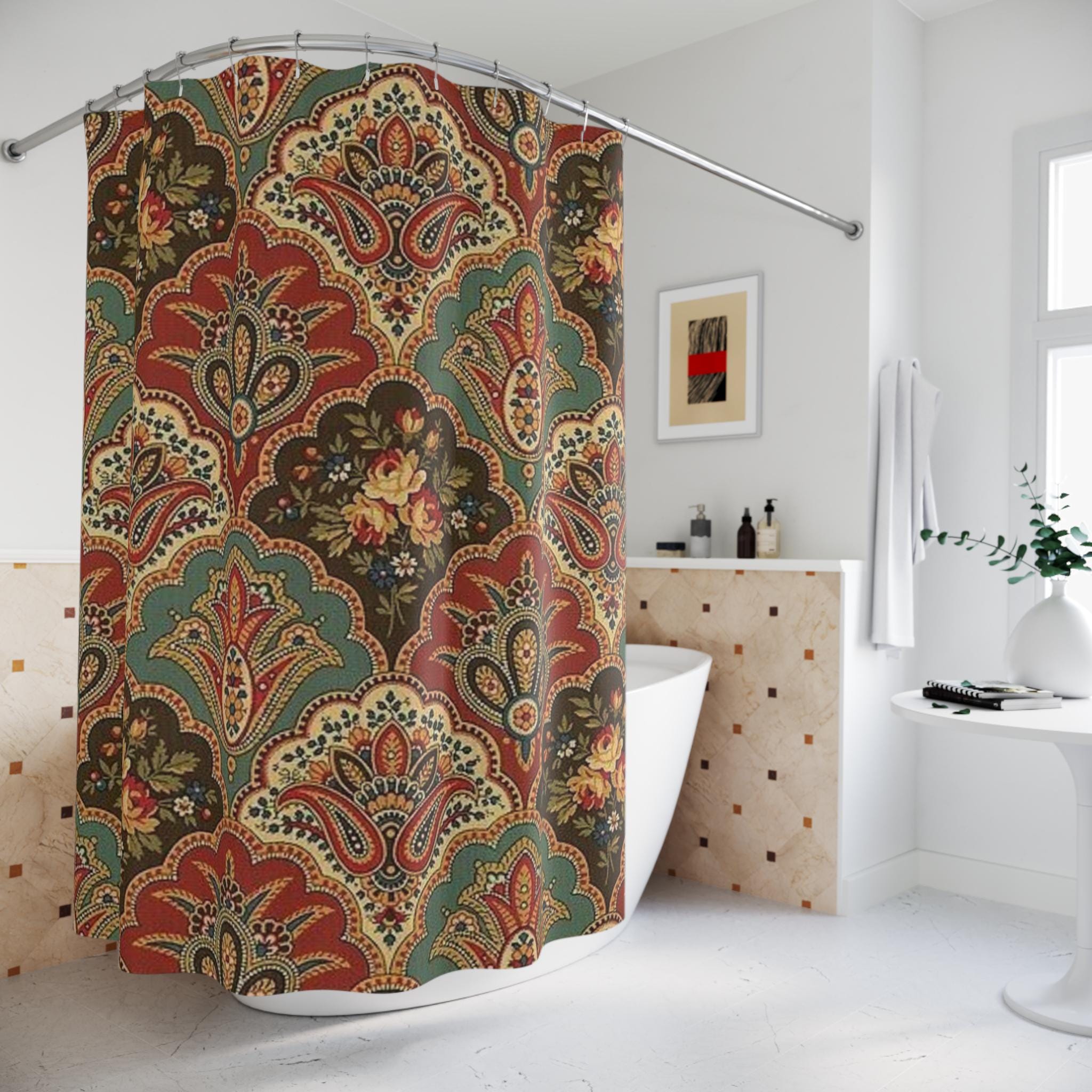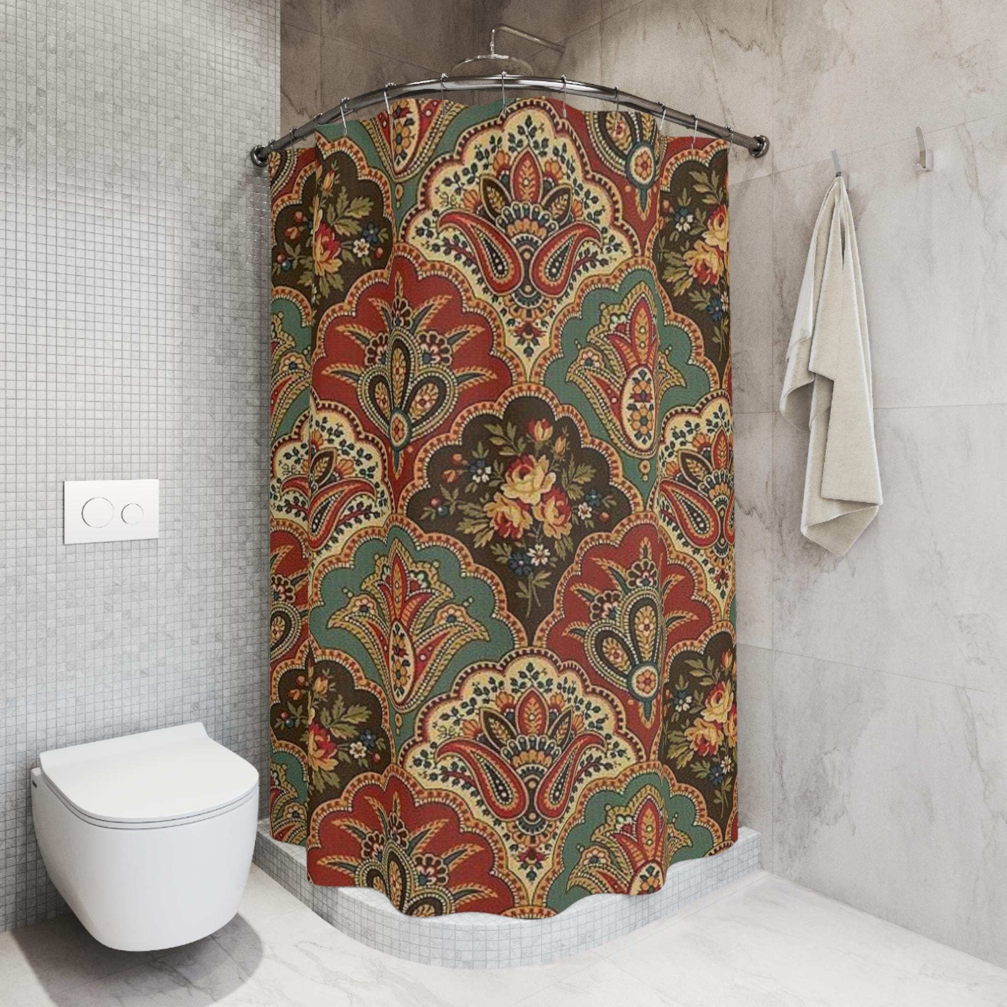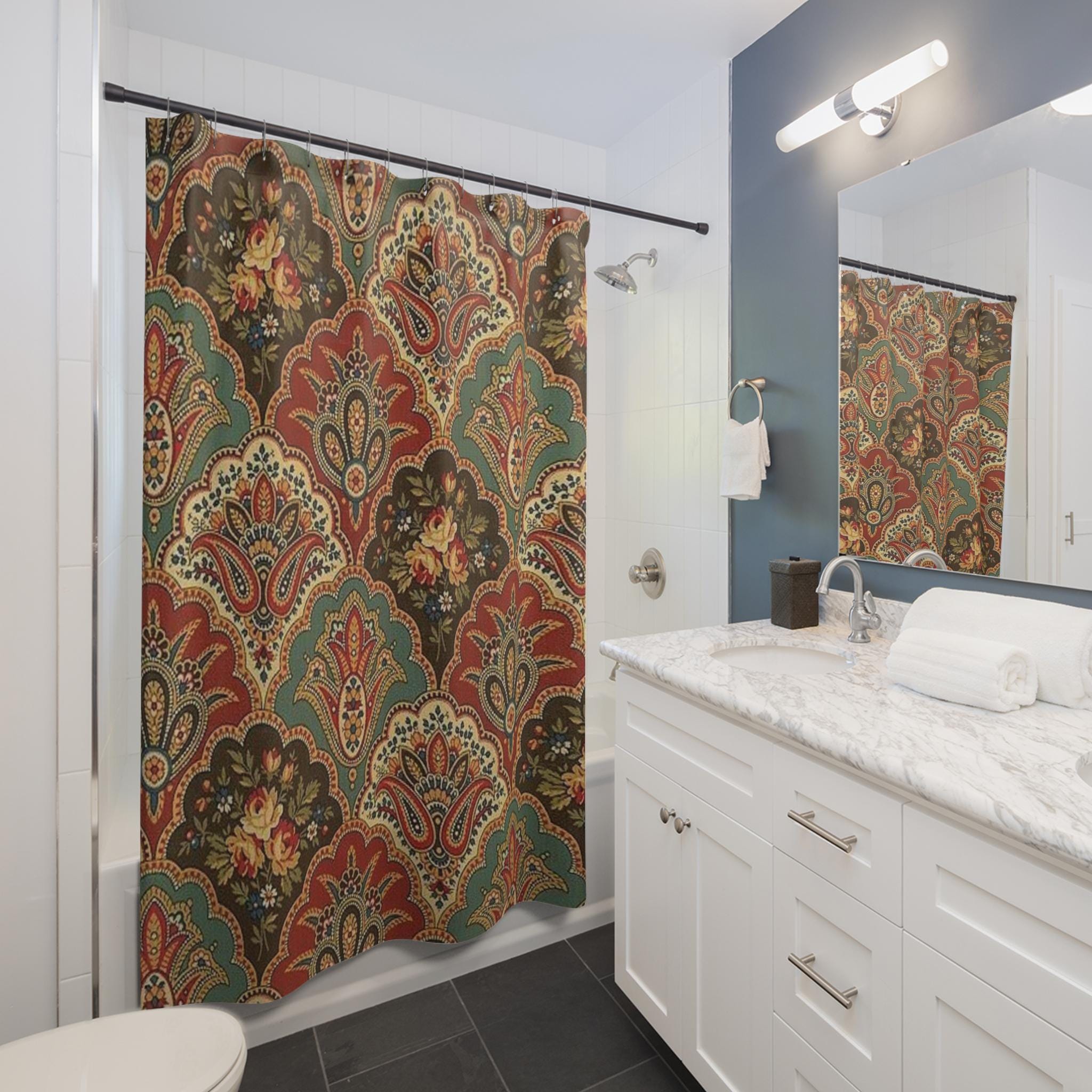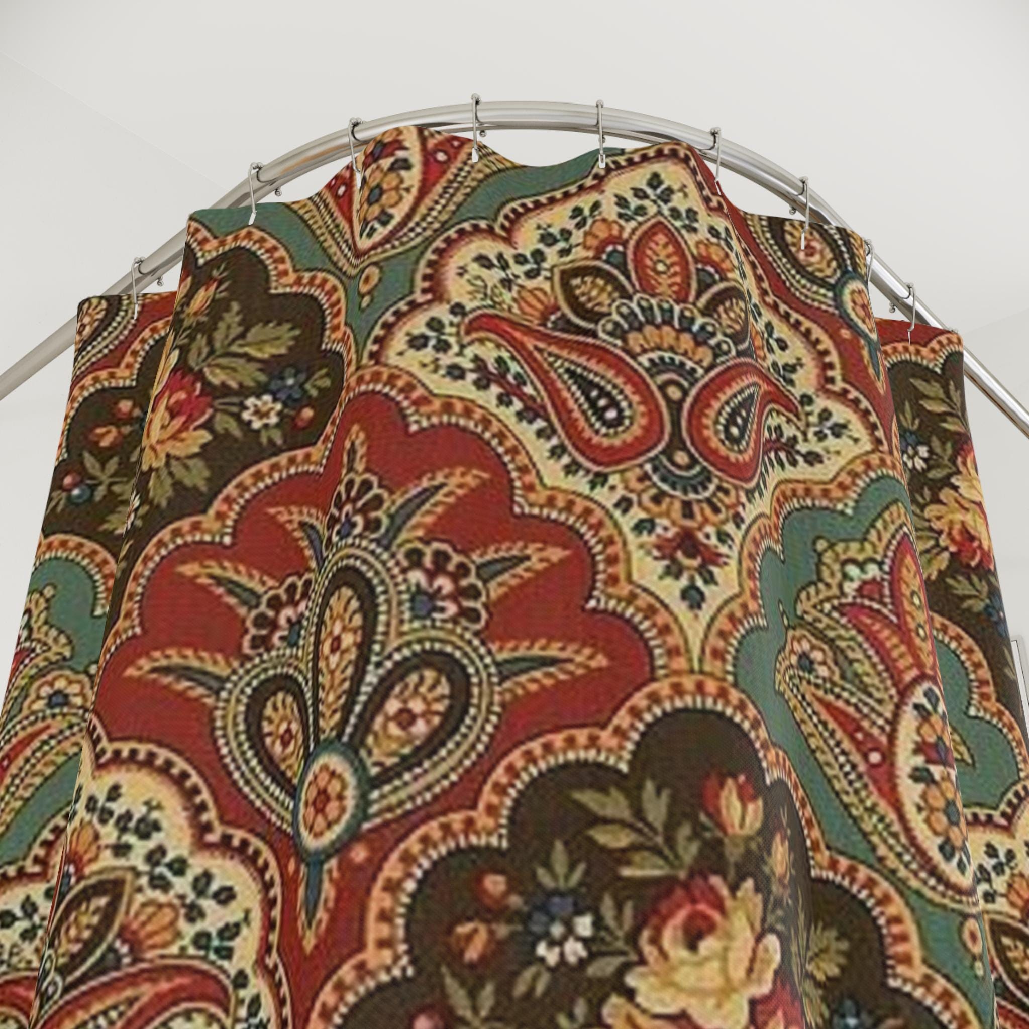 Warm, layered, and quietly ornate — this shower curtain brings a vintage paisley tapestry into the bathroom. Rich rusts, deep olives, and muted golds form a repeating floral motif that reads like an heirloom textile. It hangs with gentle fullness, softening light and adding a cozy, lived-in warmth to morning routines. Use it to anchor a rustic, boho, or cottage-inspired bath where small details and weathered color tell the story. The dense pattern hides water spots and wear, so the curtain keeps looking textured and collected even after daily use.