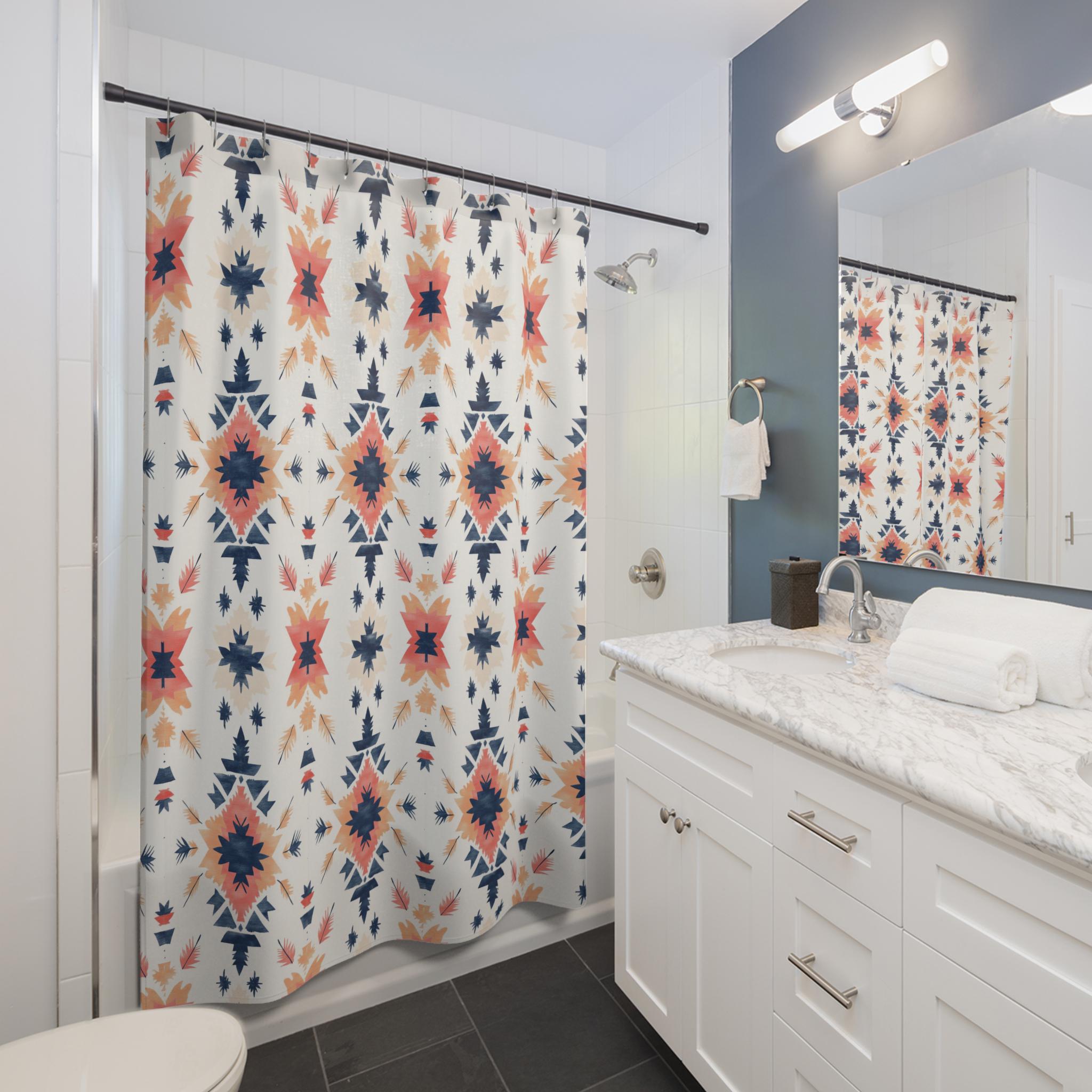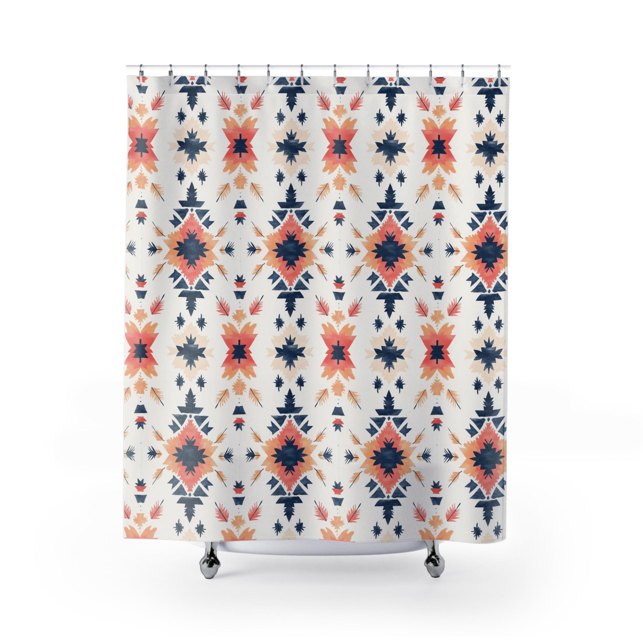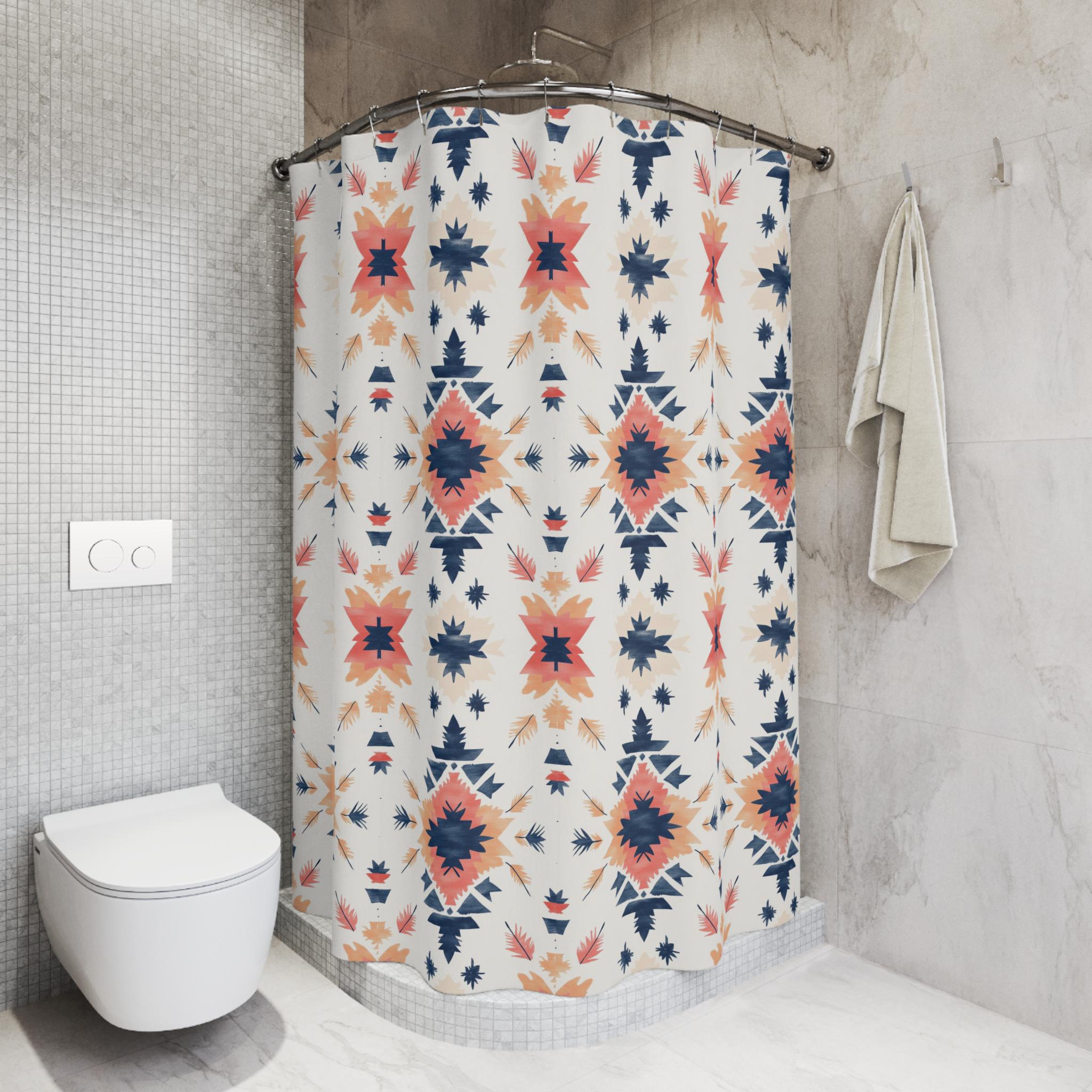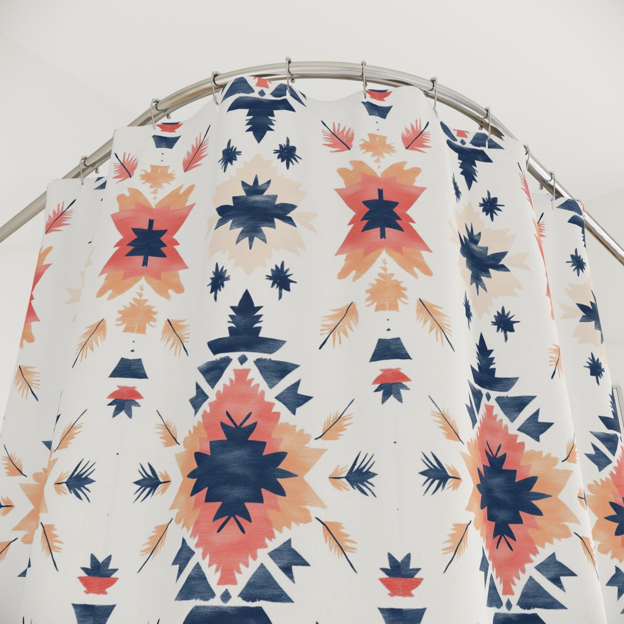 Bring a quiet, artisanal warmth into your bathroom with this printed shower curtain. Soft coral and deep navy shapes repeat in a hand-painted, geometric motif on a clean ivory ground. The result feels like a woven textile translated into water-resistant fabric — calm, collected, and quietly sculptural. It hangs with relaxed folds, softening tile and chrome while adding a touch of craft-forward pattern to daily routines. Use it to anchor a neutral palette or to introduce a subtle pop of color alongside natural wood, woven baskets, and warm metal finishes.