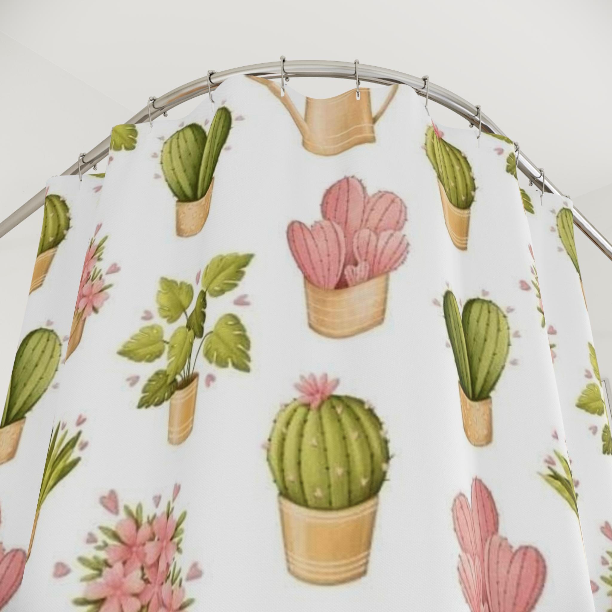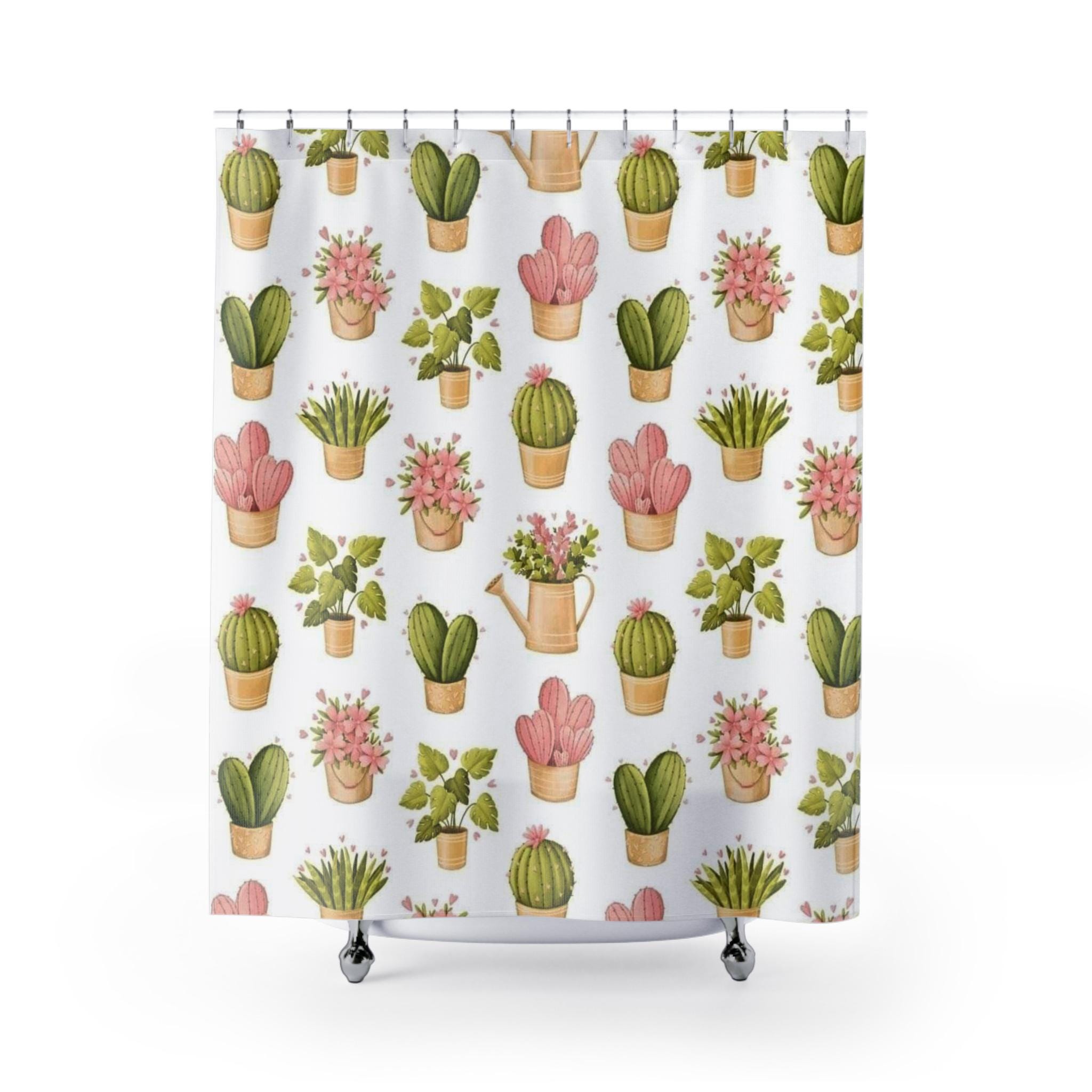 Product features - 100% polyester fabric — durable, shape-retaining, quick-drying - One-sided watercolor print of potted succulents and cacti - Twelve top buttonholes for standard shower hooks (hooks not included) - Pre-constructed item with size variance of +/- 2" - Adult use; lightweight and easy to hang