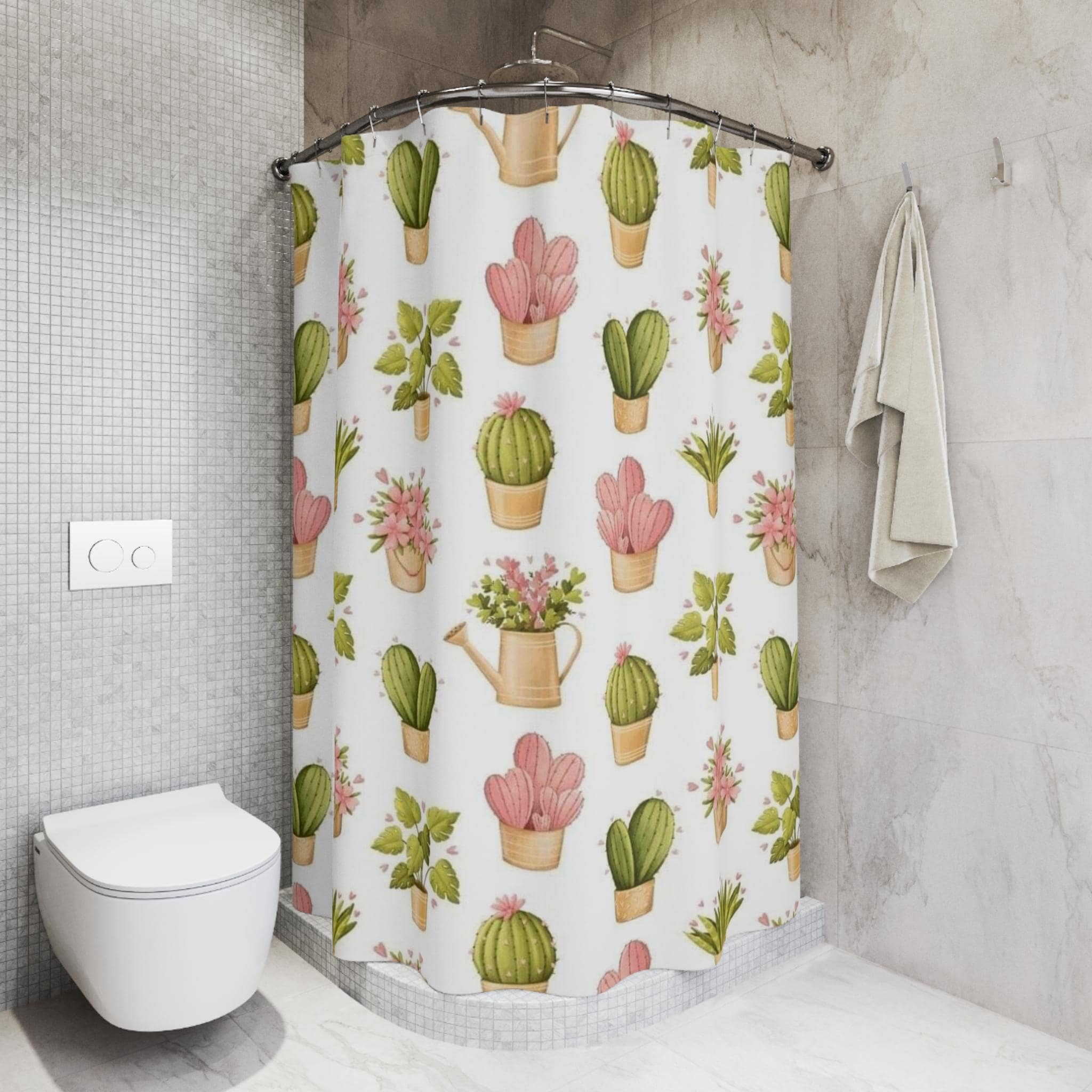 Bright, breezy, and quietly joyful — this shower curtain brings a little indoor garden to your bathroom. Watercolor-style pots, succulents, and cuddly cacti float across a soft white background, creating a calm, botanical scene that feels fresh every morning. The lightweight polyester hangs smoothly and dries fast, so the pattern stays crisp through daily use. It slips onto standard hooks with 12 reinforced buttonholes, and its one-sided print pops against neutral tiles or a painted accent wall. Place it in a small apartment bathroom, a sun-drained guest room, or a cottage-style ensuite to add gentle color and a handcrafted touch to daily routines.