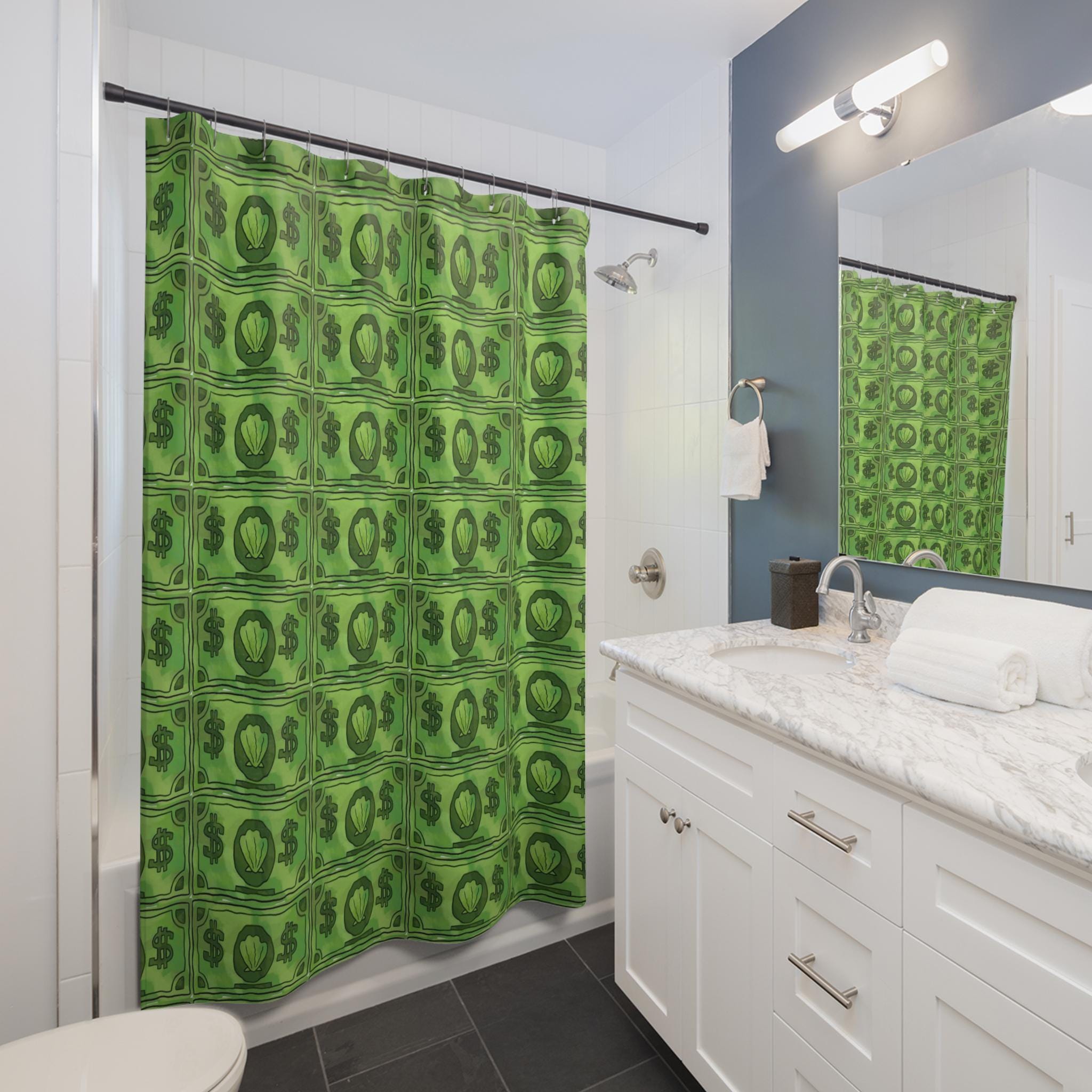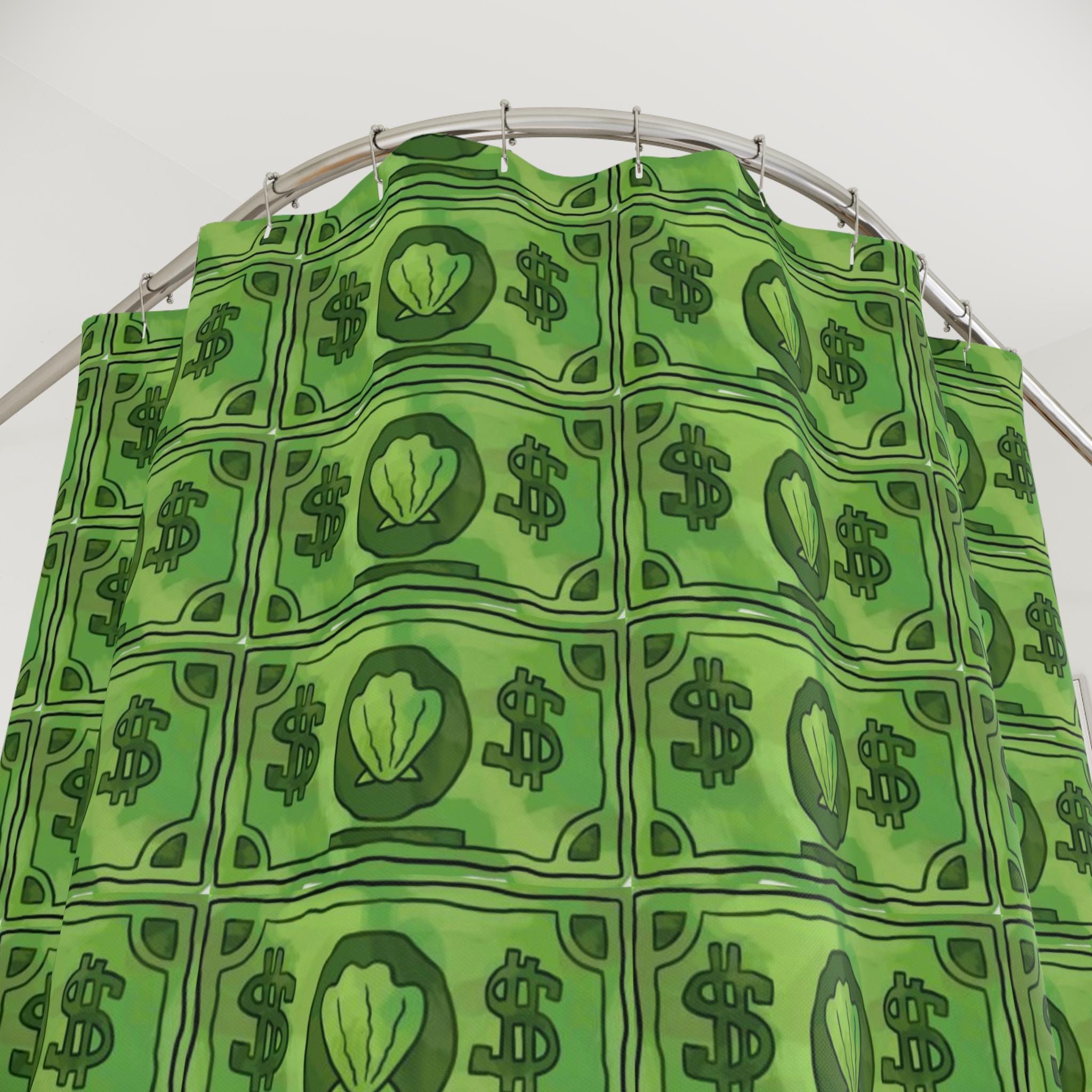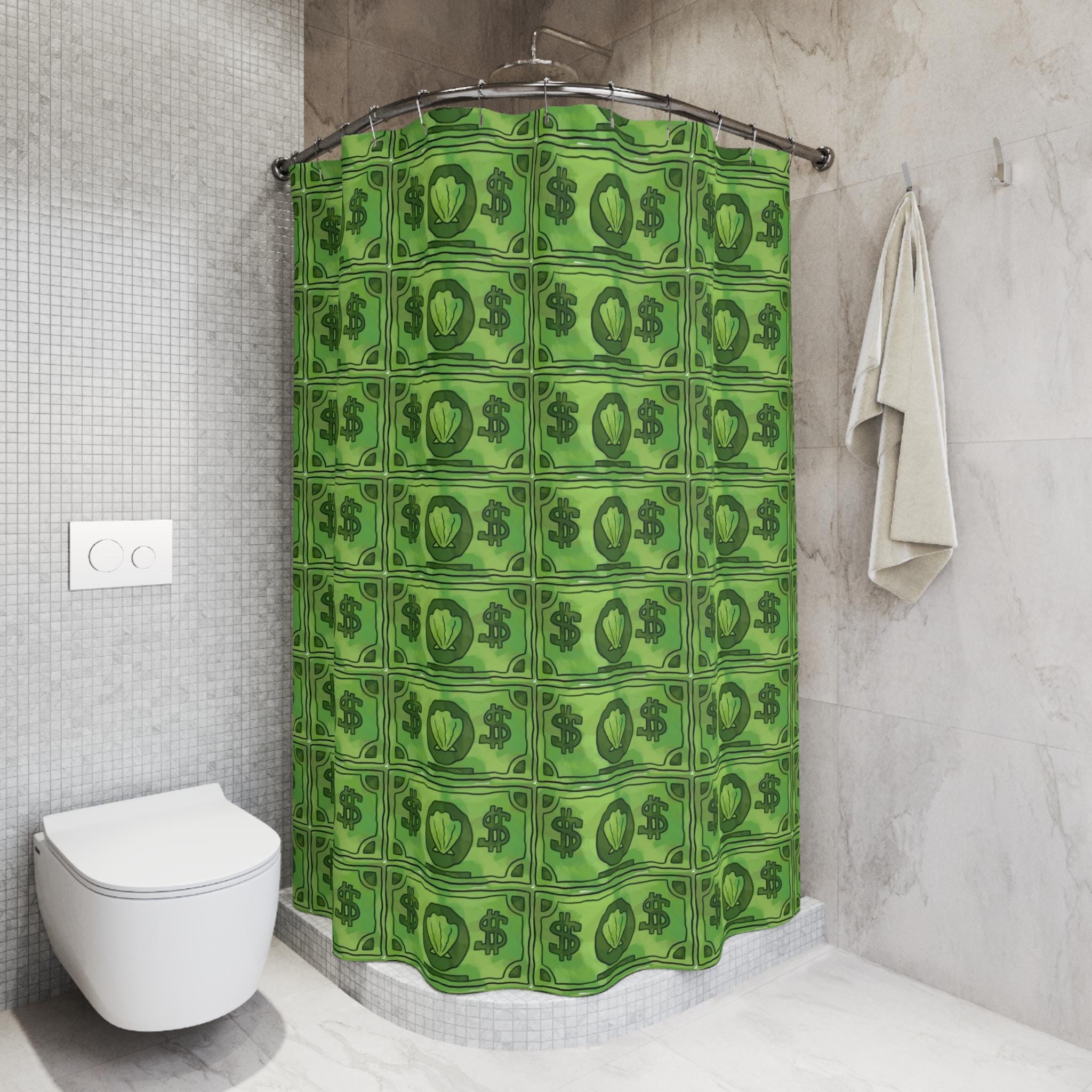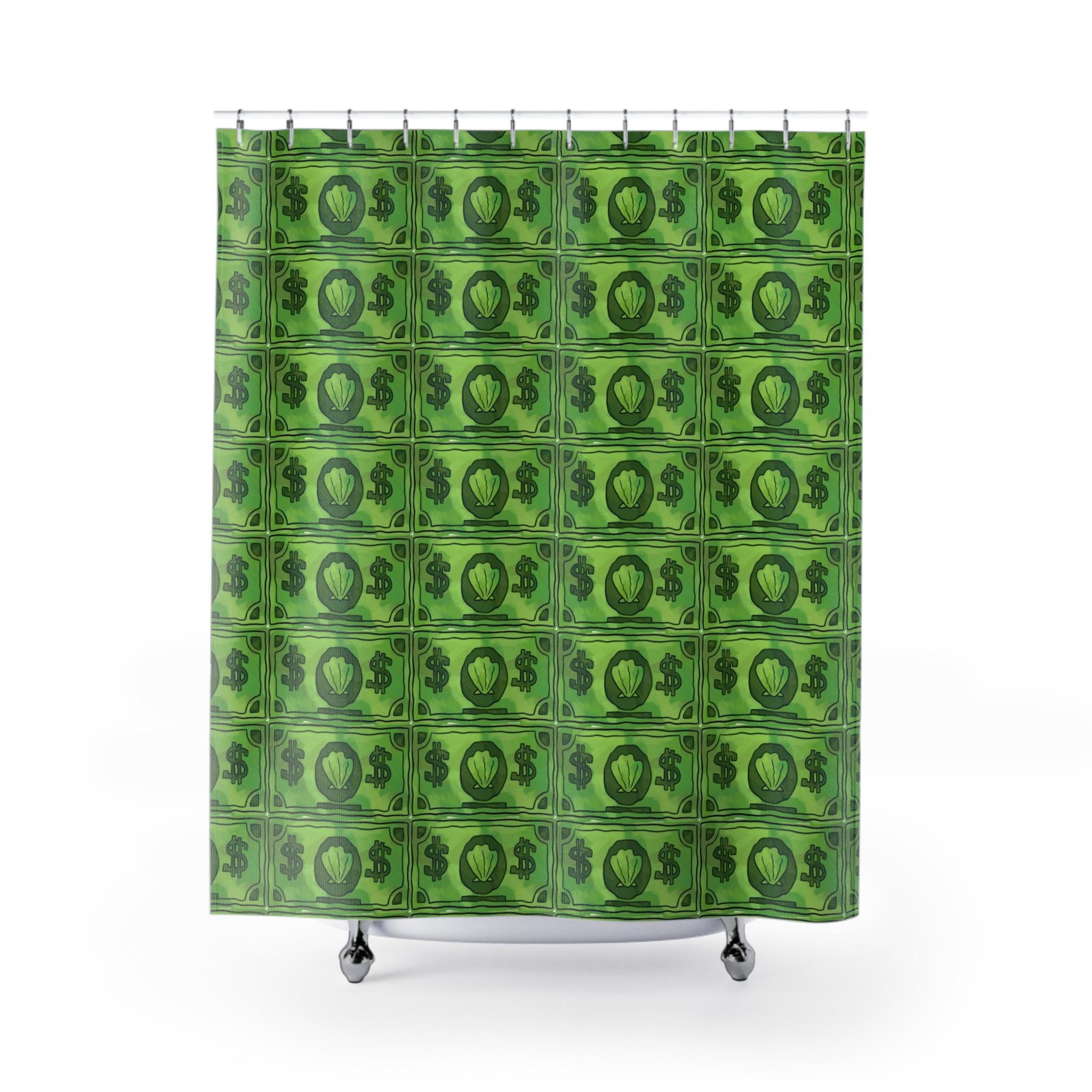 Product features - 100% polyester — strong, shape-retaining, quick-dry fabric - One-sided print with vivid green repeating money pattern - 12 buttonholes at the top for standard shower hooks - Hooks not included — fits most standard rods - Pre-built sizing; small variance possible (+/- 2")