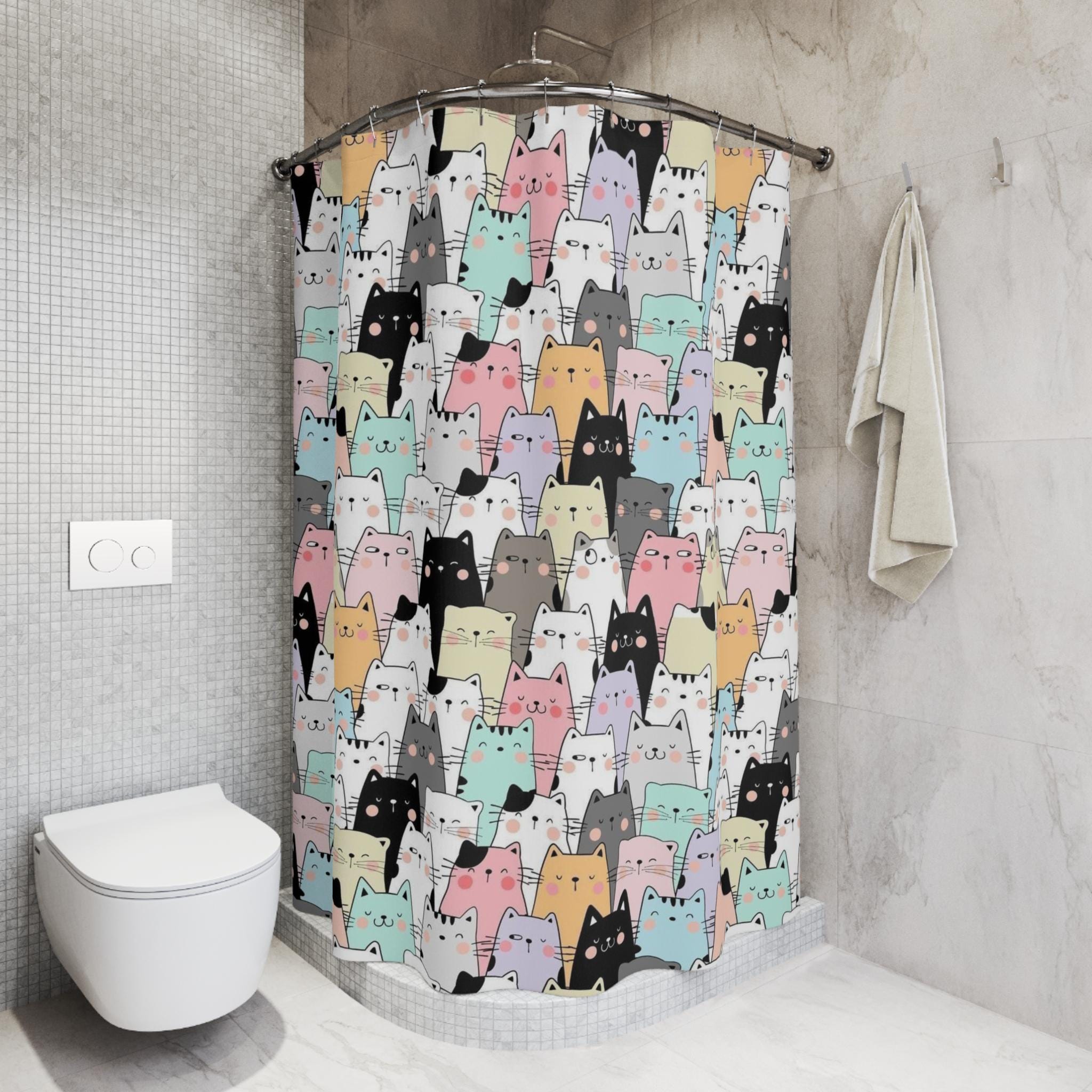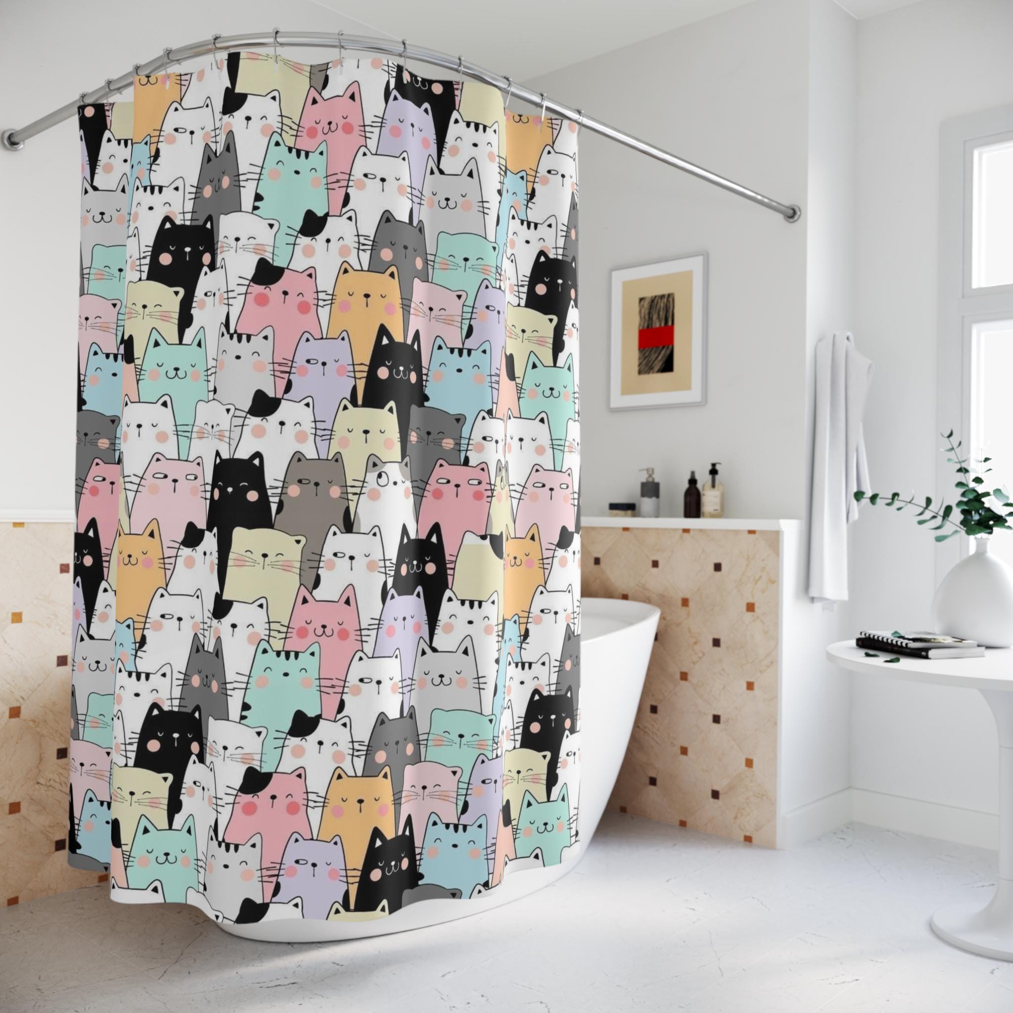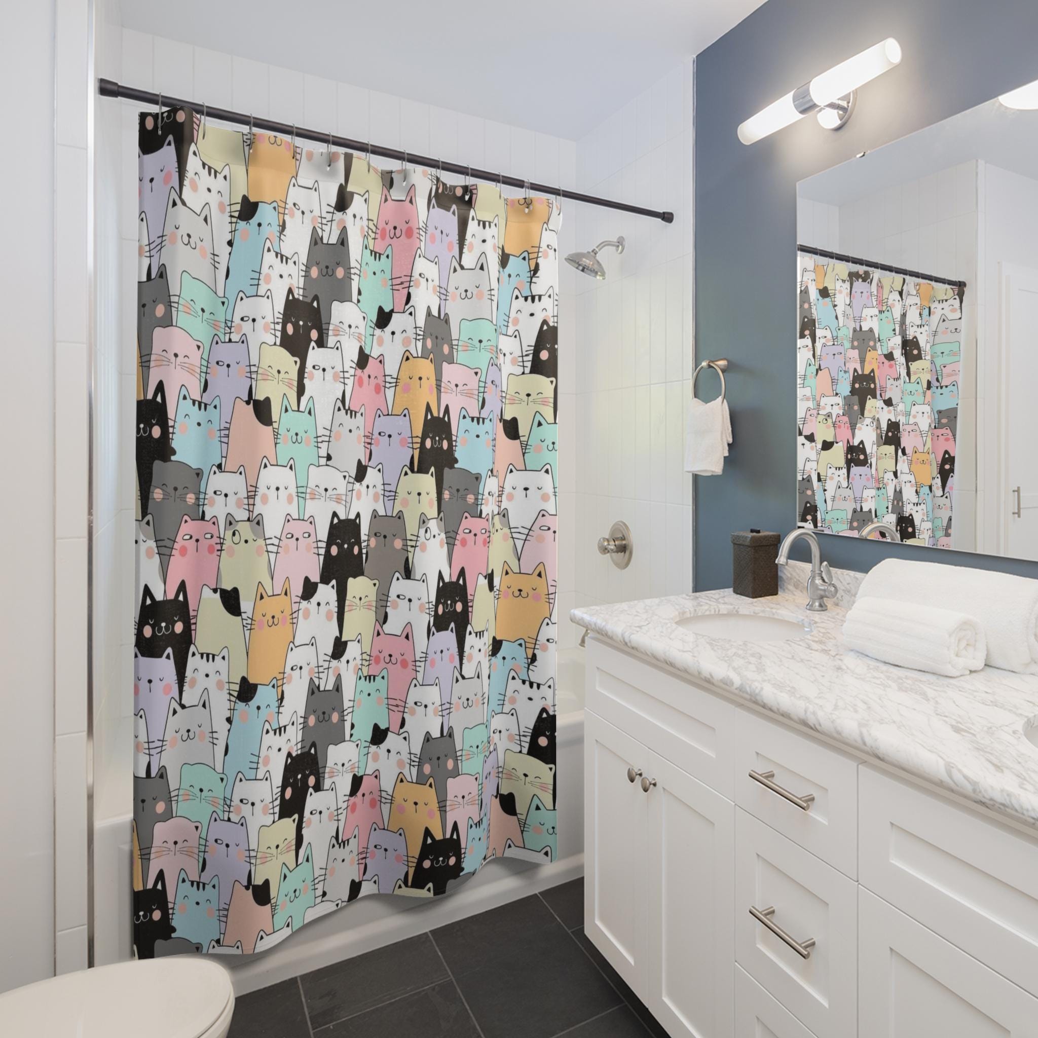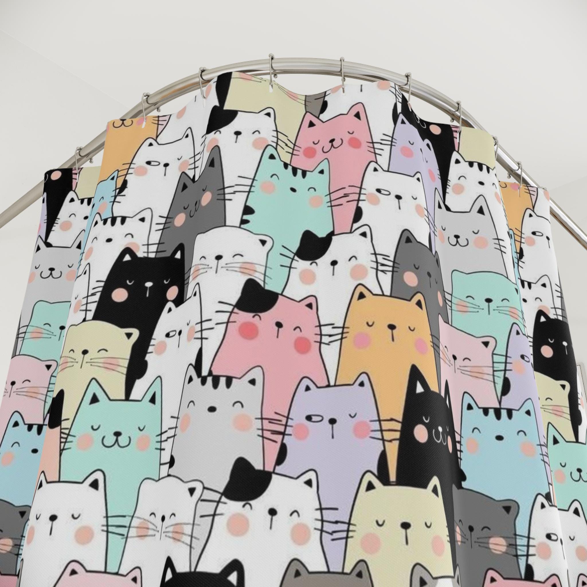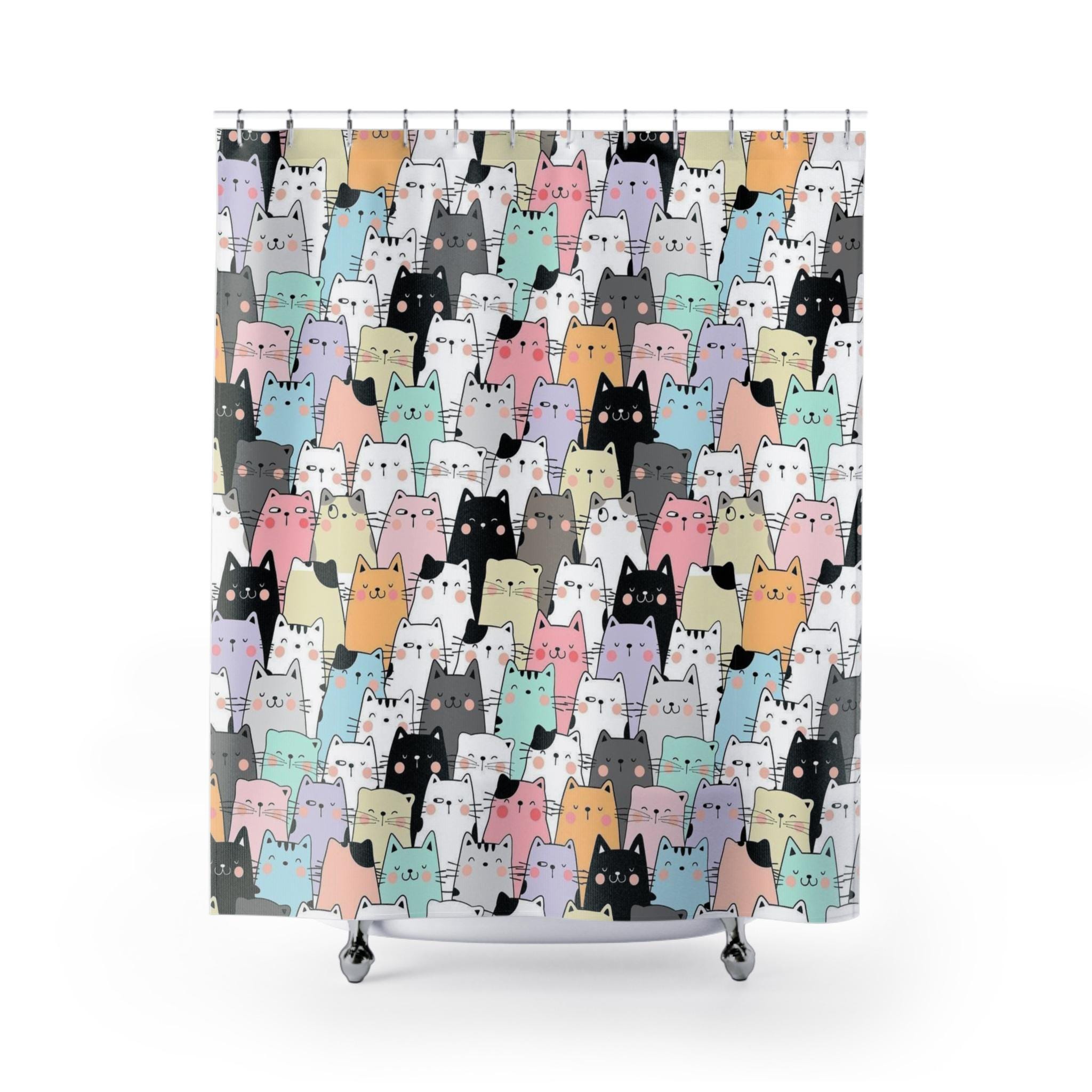 A cheerful, cozy shower curtain that fills the bathroom with playful energy. Rows of soft, pastel cats in mint, blush, mustard and charcoal peek out across the fabric, bringing a warm, quirky touch to everyday routines. The lightweight polyester drapes neatly and dries quickly, while the single-sided print keeps the vibrant pattern focused where it shows most. This curtain turns a quick shower into a small, uplifting moment — whether you're easing into the day or unwinding at night — and blends easily with modern, cottage, or whimsical decor.