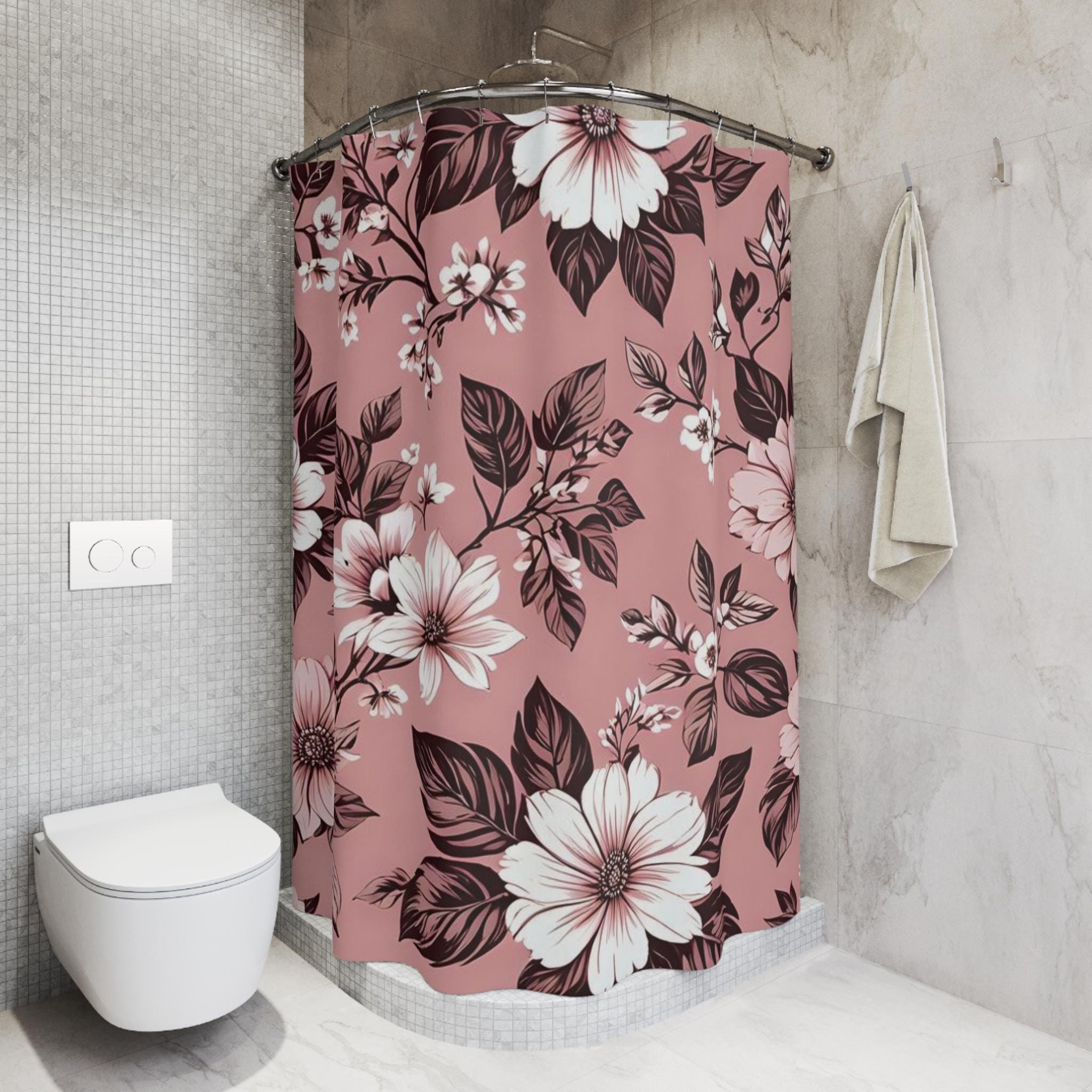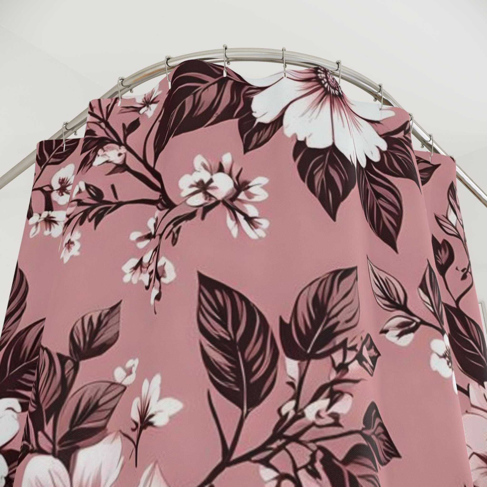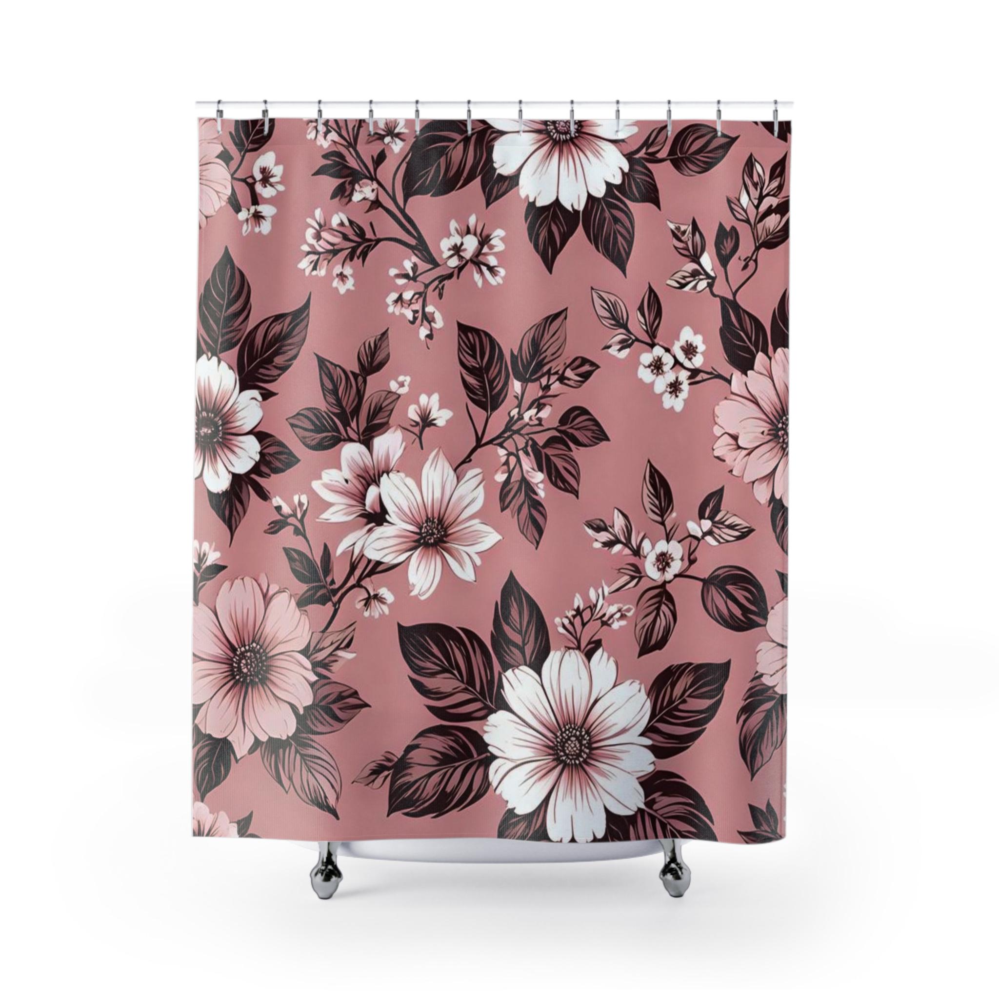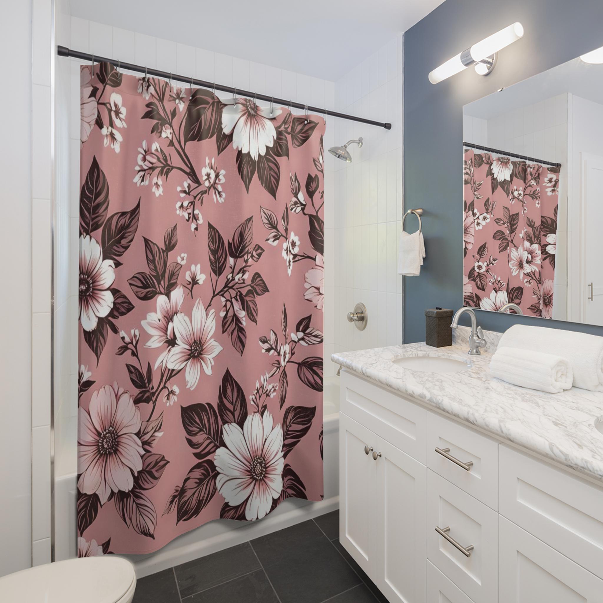 Soft, painterly blooms drift across a warm rose background, turning a simple bathroom into a quiet, vintage-inspired retreat. The oversized floral print feels hand-rendered — petals and leaves layered in muted whites and deep chocolate tones that pop against the dusty rose. Lightweight polyester lets the design hang with gentle movement, catching light and shadow as you move through the room. It reads like a worn botanical print found at a flea market: nostalgic, calm, and quietly elegant. Hang it on a curved rod to give the patterned room to breathe, or pair with brass fixtures and matte tiles for a soft, romantic bath setup.