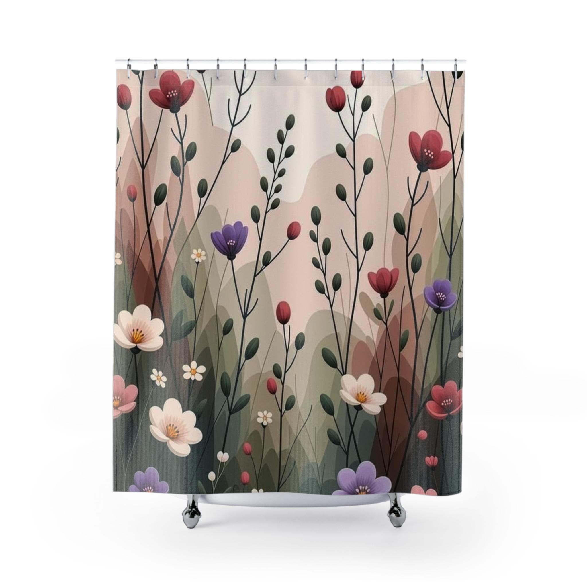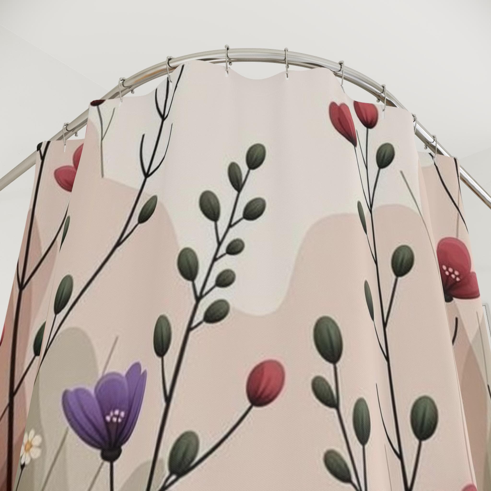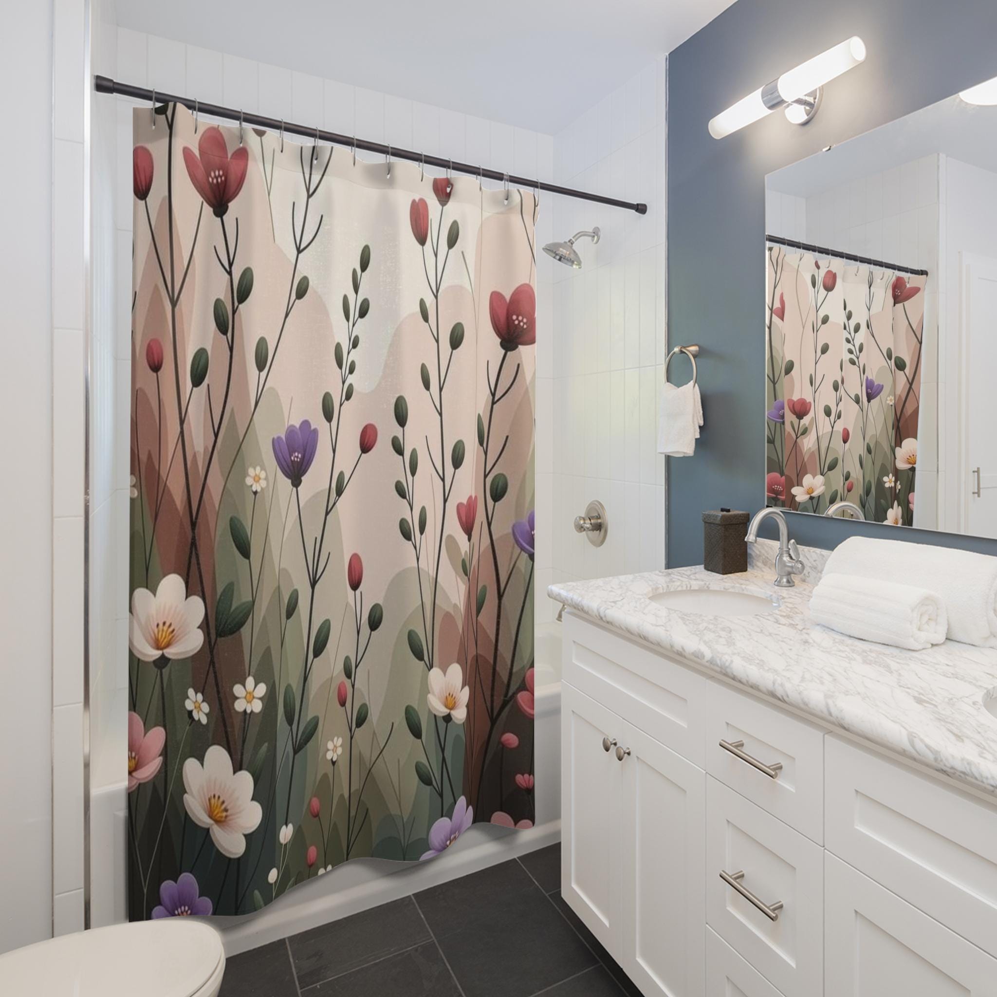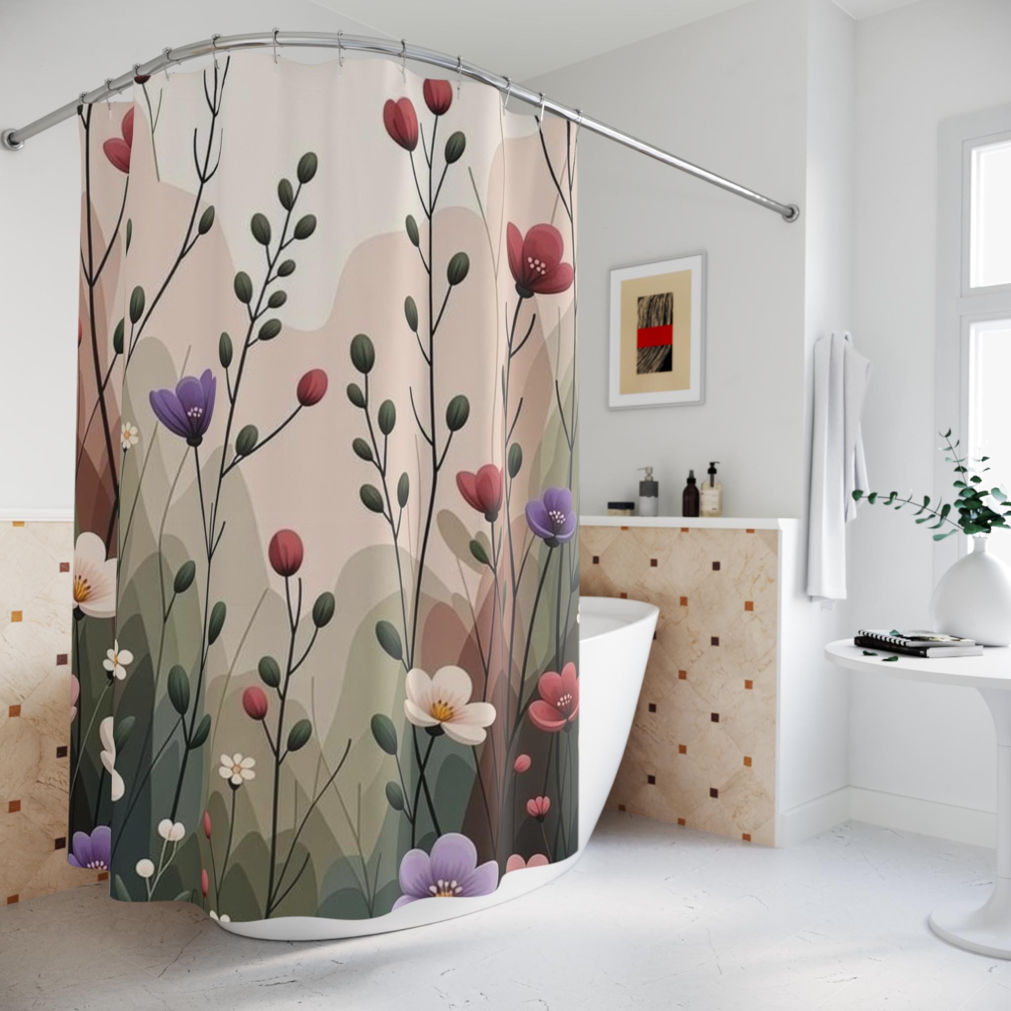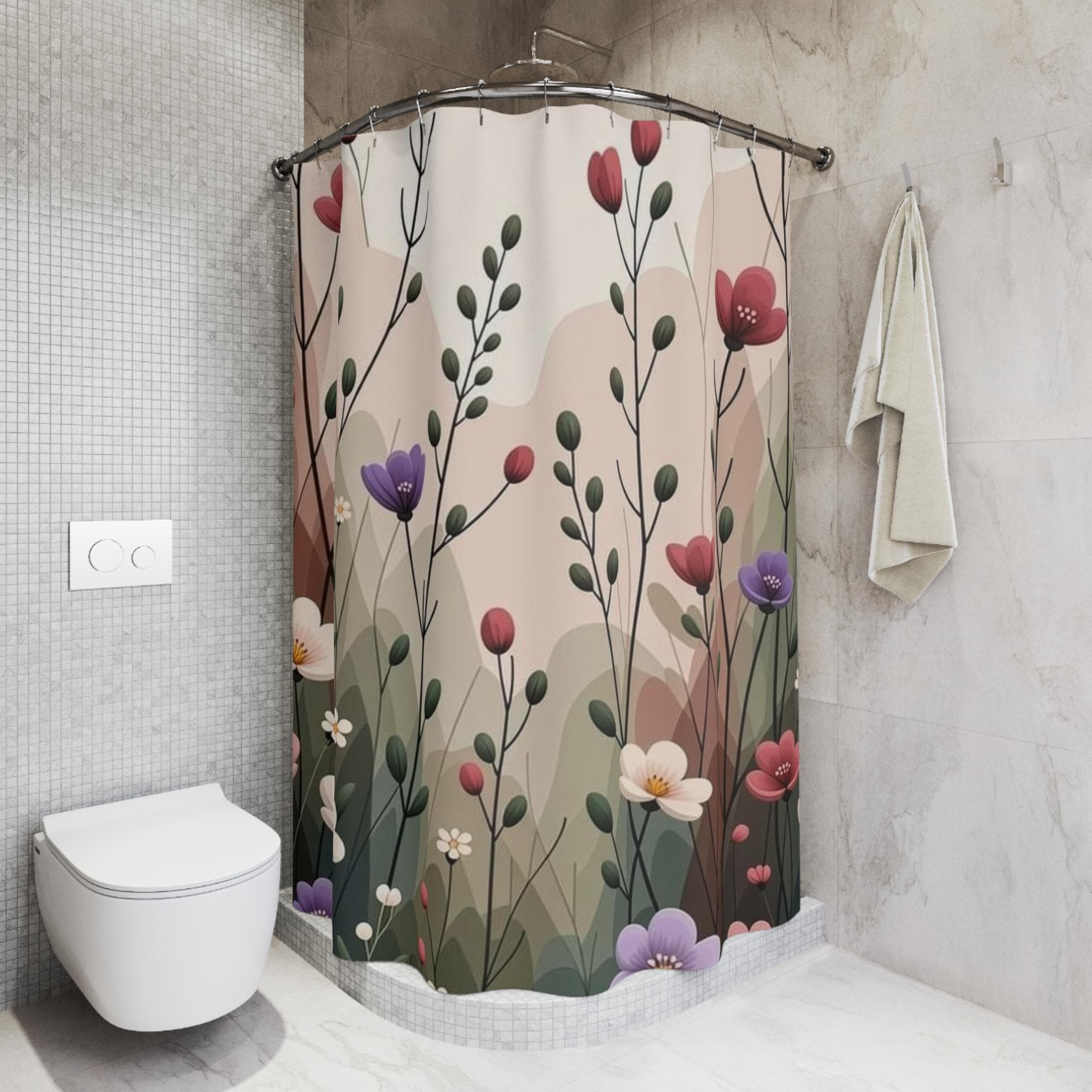 Soft, painterly wildflowers bloom across a muted, sandy backdrop. This polyester shower curtain brings a gentle, botanical calm to your bathroom — delicate stems and tiny blossoms that feel hand-painted, not loud. Hang it where you want mornings to slow down: it softens bright tile, complements natural wood and matte fixtures, and adds a quiet, garden-like pause to everyday routines. Lightweight and quick-drying, the single-sided print keeps the artwork vivid on the room-facing side while remaining practical for daily use. The top has twelve reinforced buttonholes for standard hooks, so installation is simple (hooks sold separately).