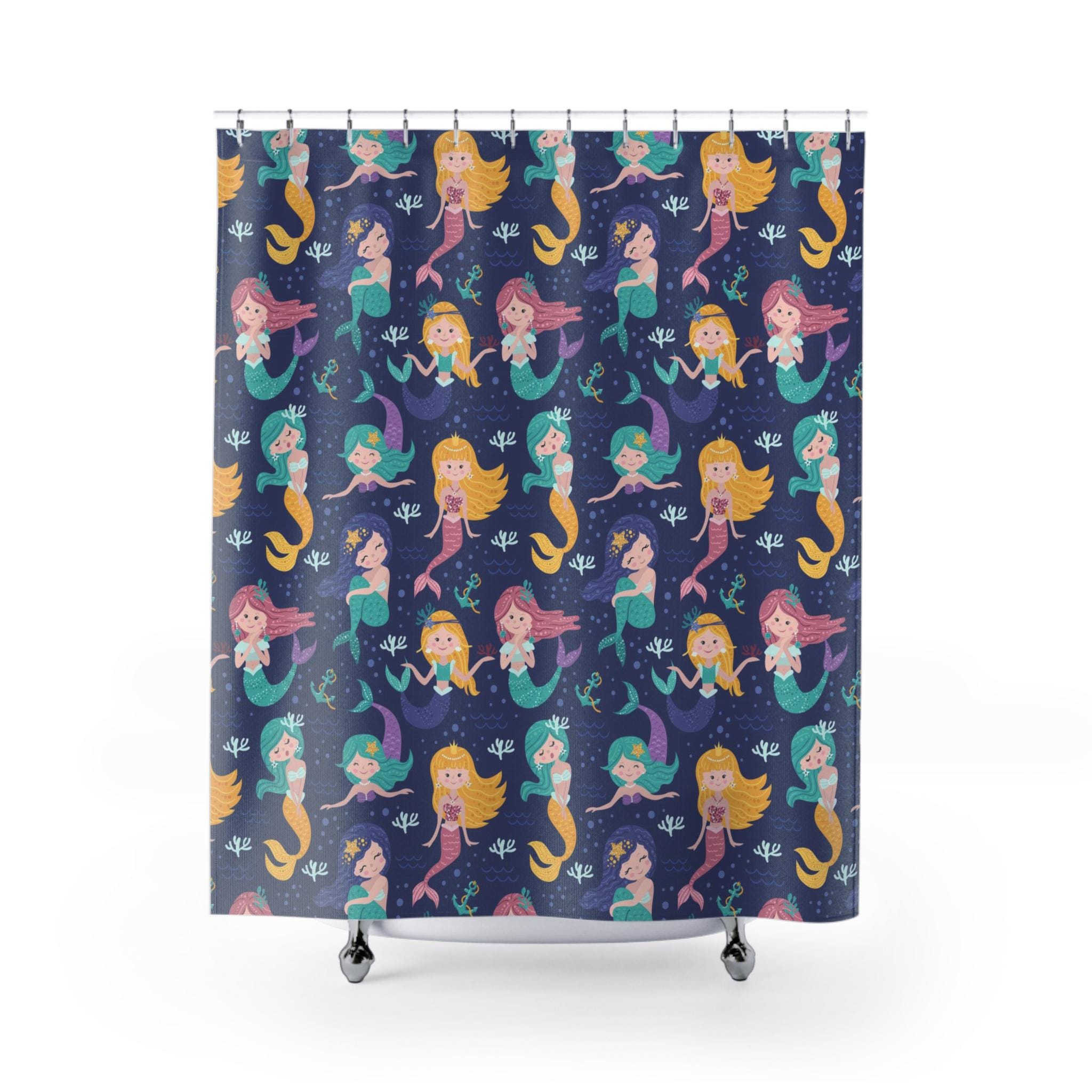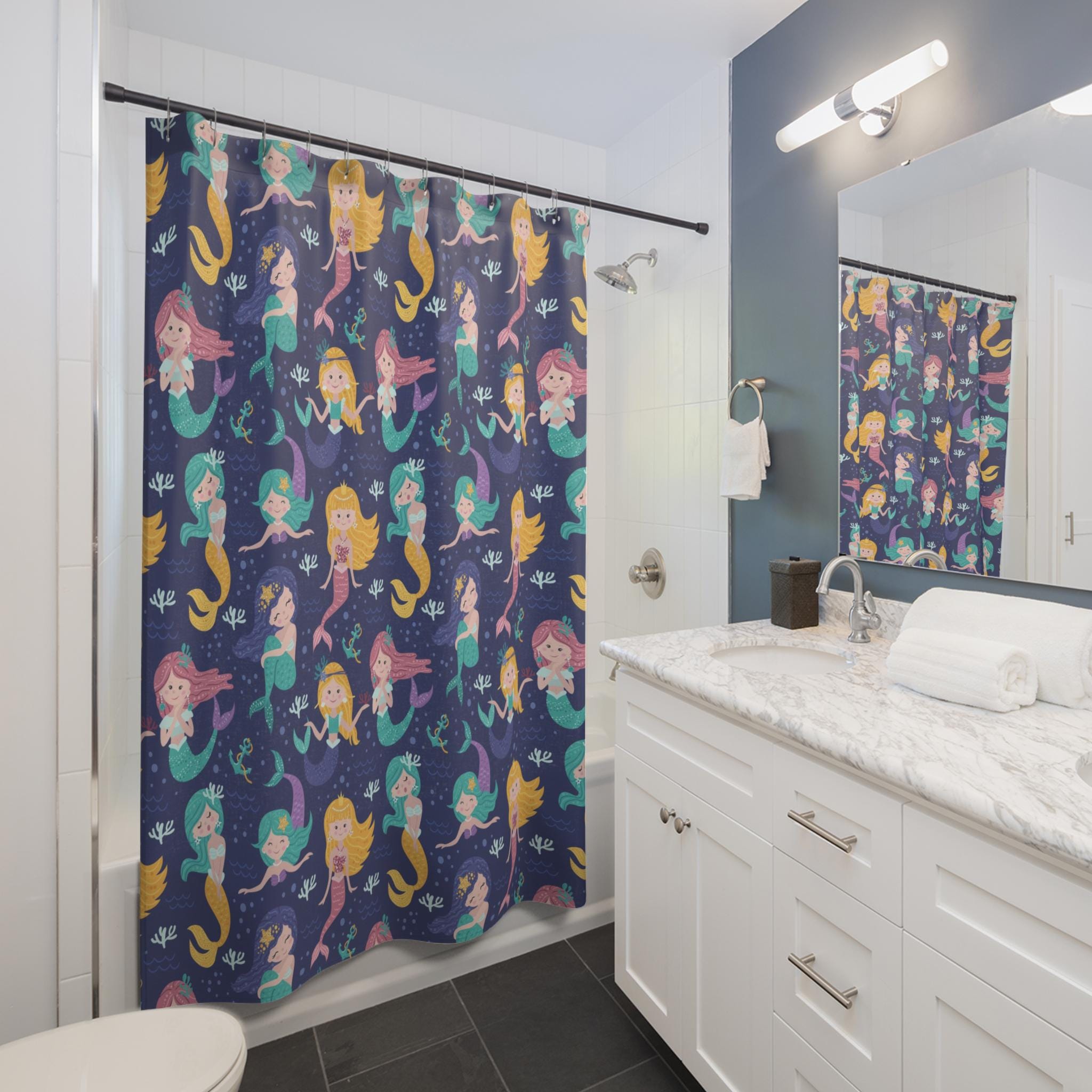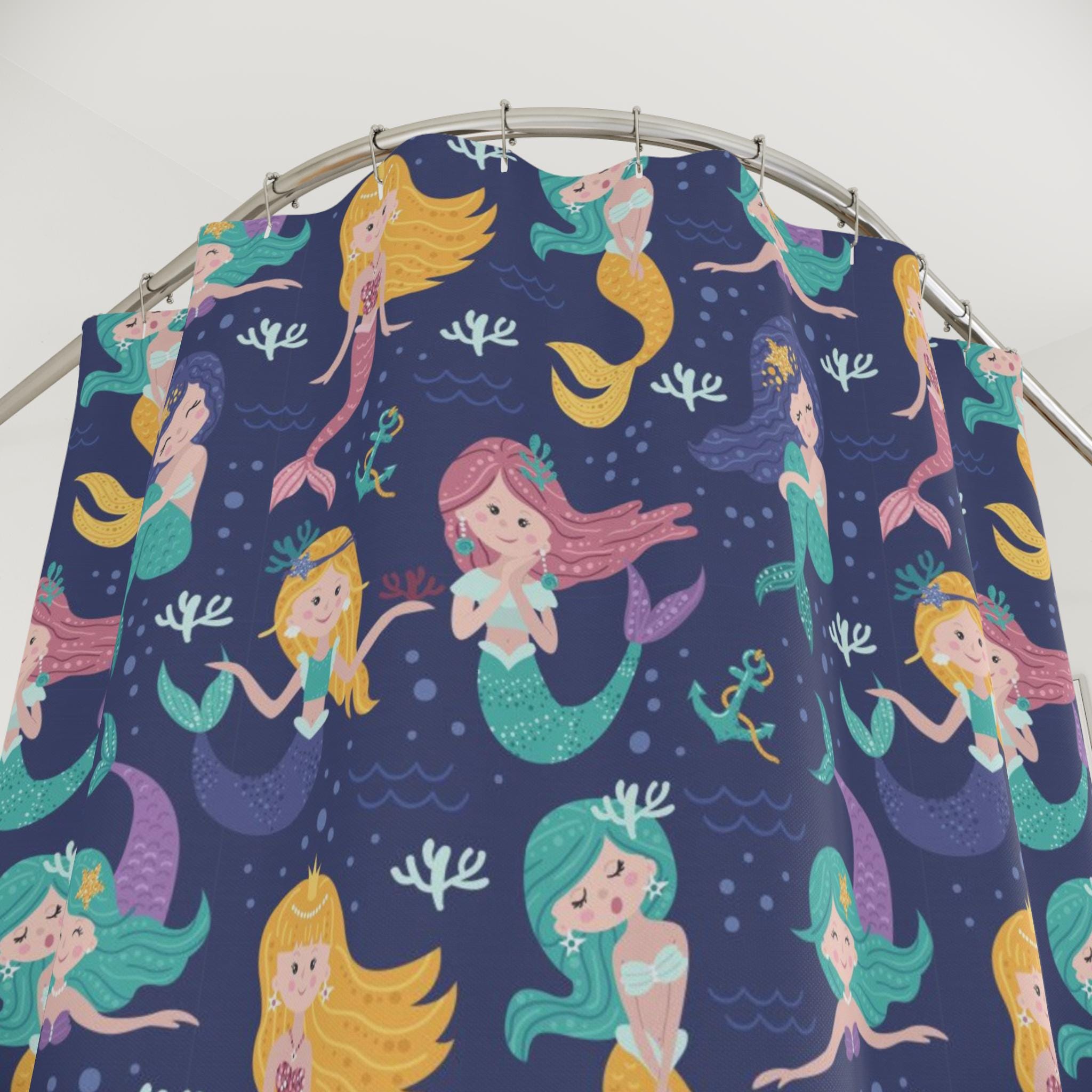 Bring a splash of ocean whimsy to your bathroom with this playful mermaid shower curtain. Soft yet durable polyester holds a one-sided, colorful repeat of smiling mermaids, swaying tails, and tiny anchors against a deep-sea navy background. The cheerful pattern turns everyday routines into a little seaside escape — imagine warm, gentle light, the hush of water, and a child's delighted gasp at the familiar, friendly faces bobbing across the fabric. Tailored for grown-up bathrooms that welcome a touch of youthful charm, it layers easily with coastal towels and natural textures to create a cozy, storybook bath space for bath nights, sleepovers, or adding character to a guest bathroom.