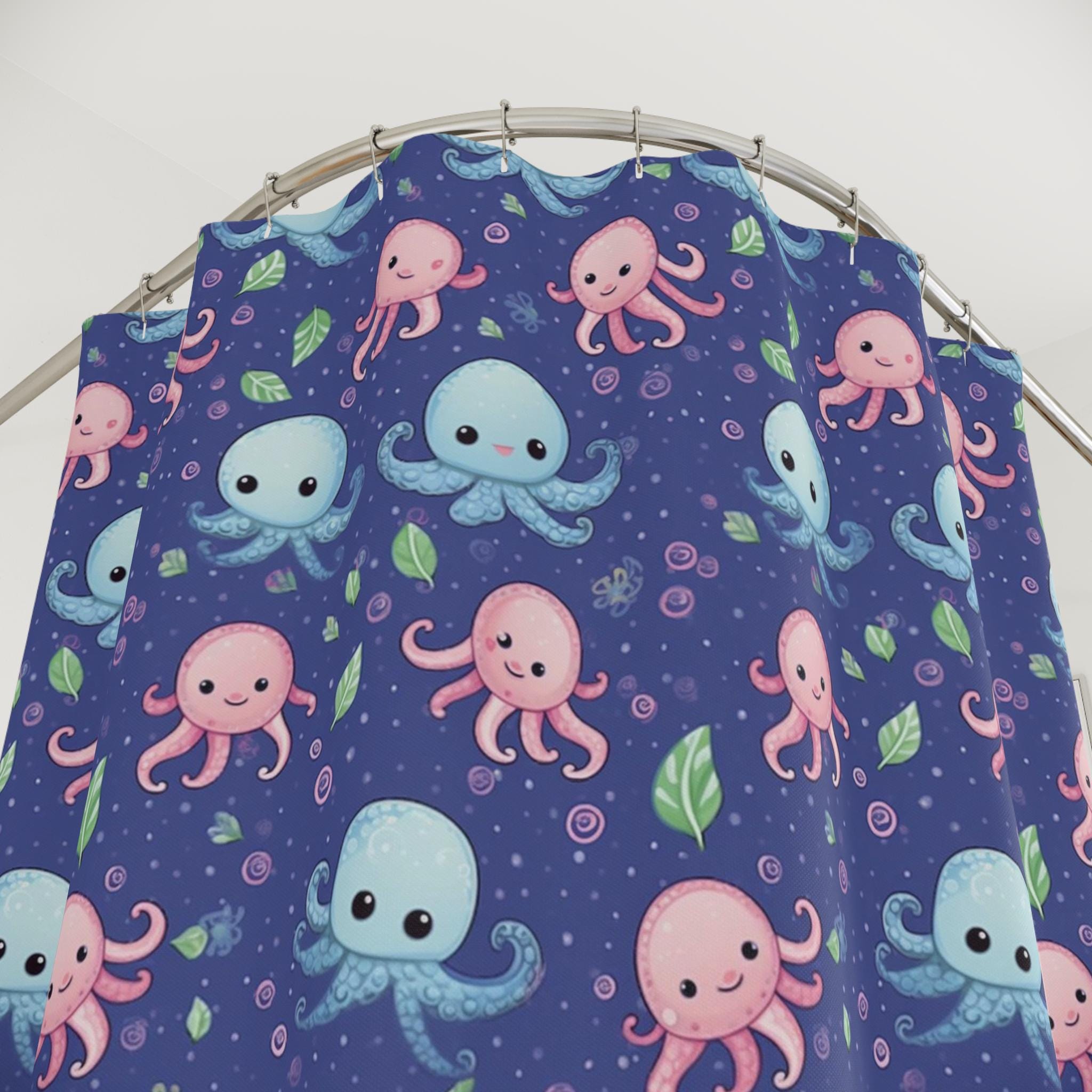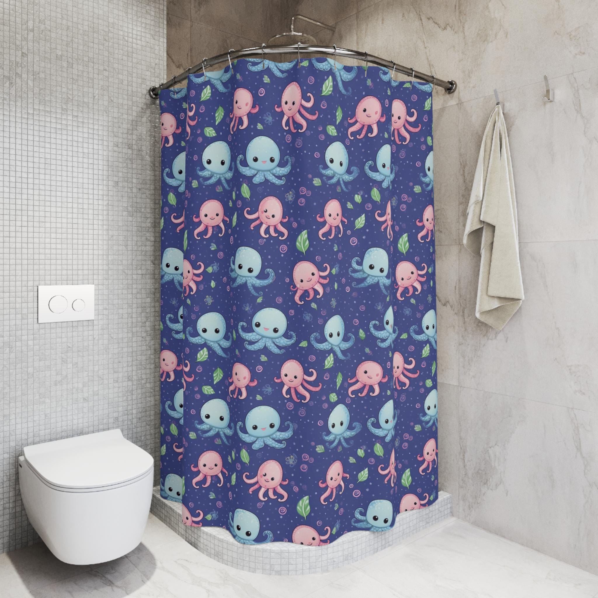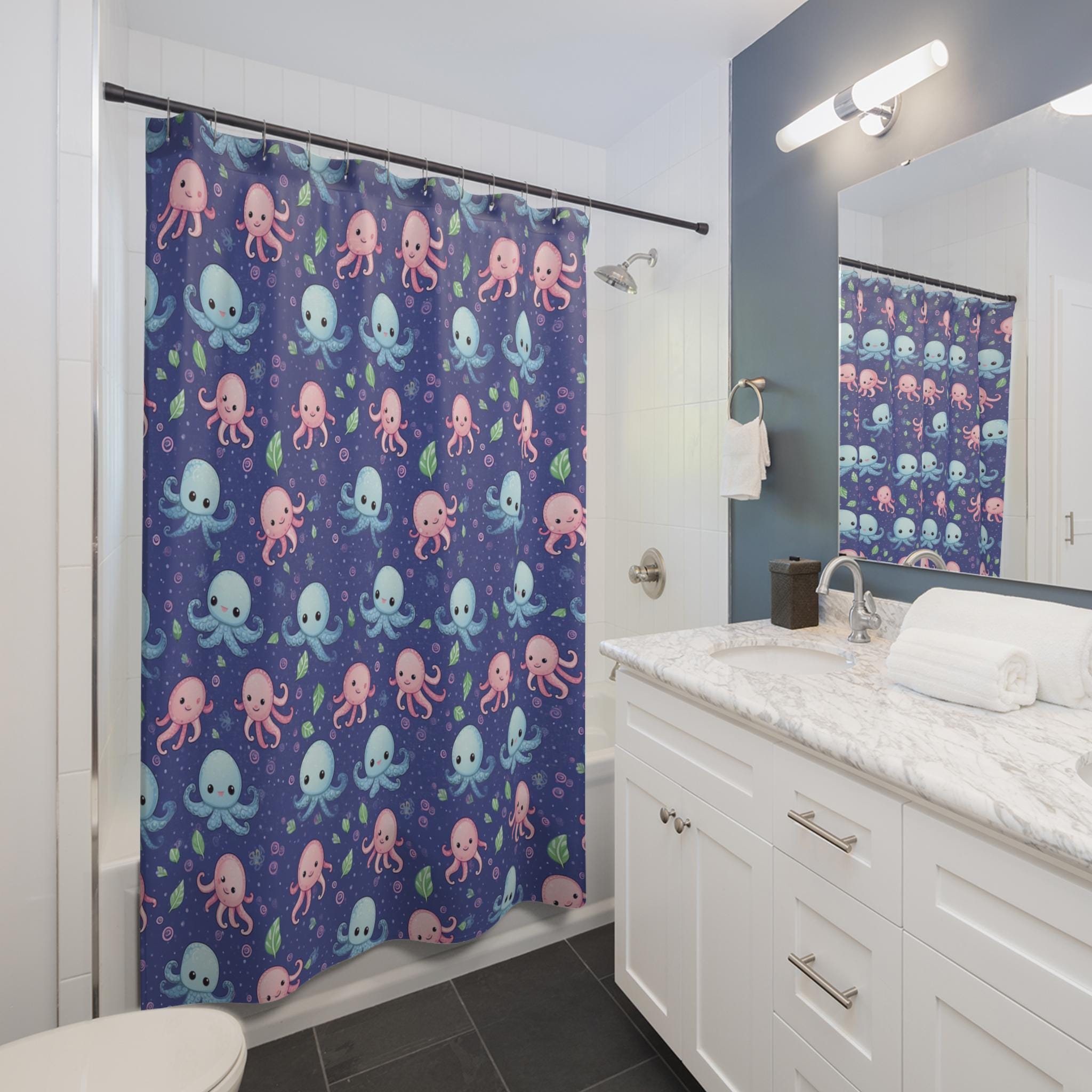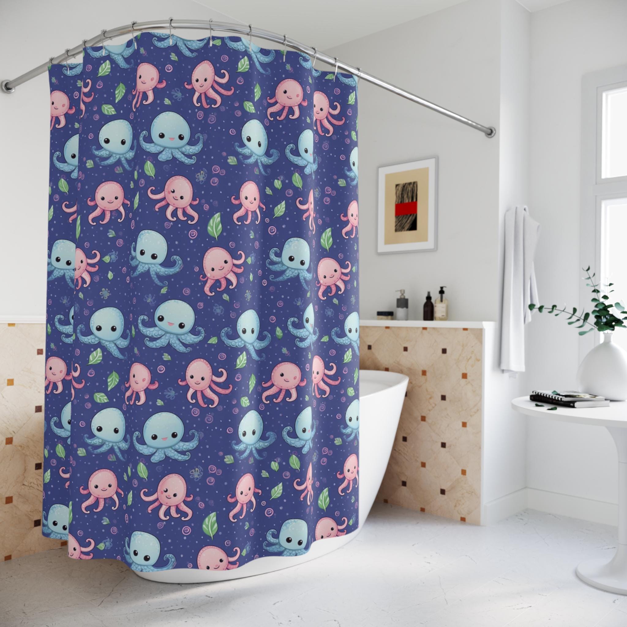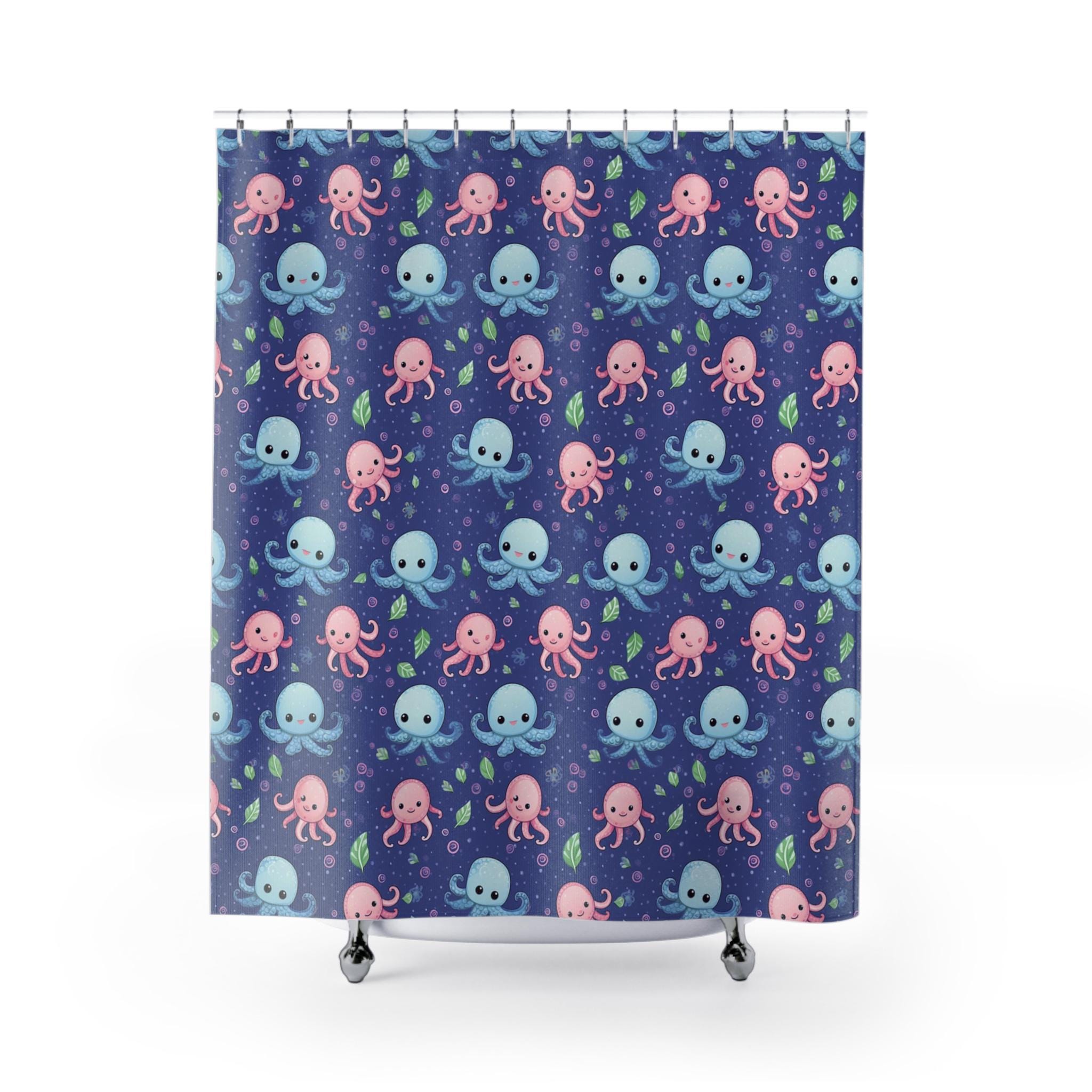 Turn daily routines into tiny moments of joy with this playful octopus shower curtain. Soft, smiling octopus characters float across a deep navy background dotted with bubbles and sea leaves, bringing a whimsical undersea atmosphere to your bathroom. The one-sided print pops with gentle pastels against the rich backdrop, creating a calming yet cheerful vibe that suits cozy apartments, kid-friendly baths, or anyone who loves charming marine motifs. Durable polyester resists wrinkles and dries quickly, so the design stays vibrant through regular use. Easy to hang with standard hooks (not included) and built to fit most tubs, this curtain adds a touch of seaside delight to mornings and evenings alike.