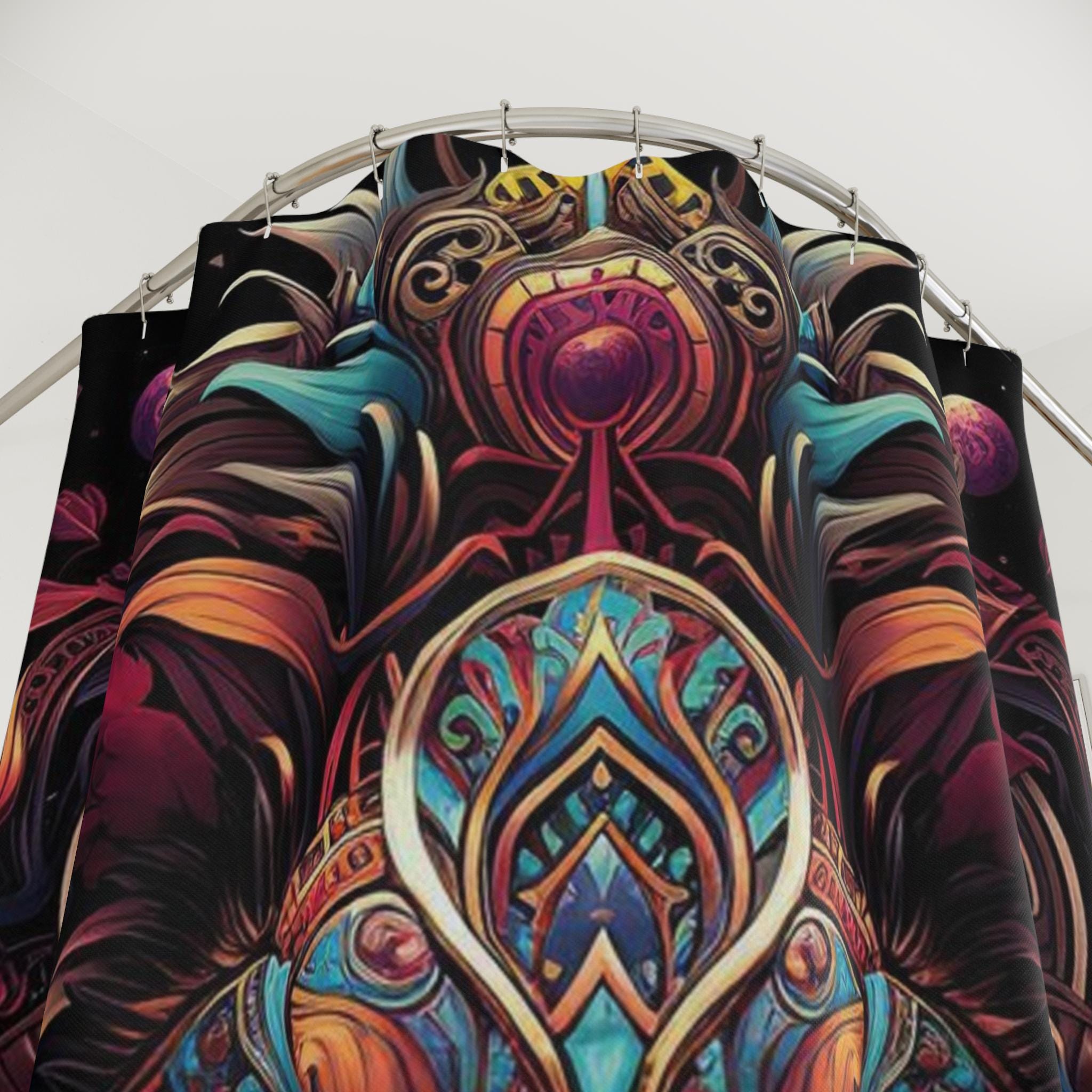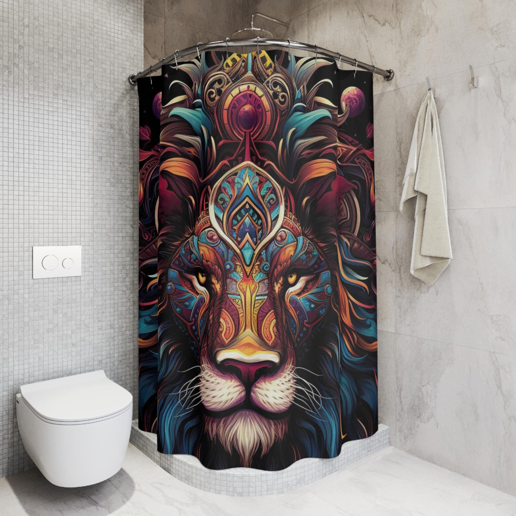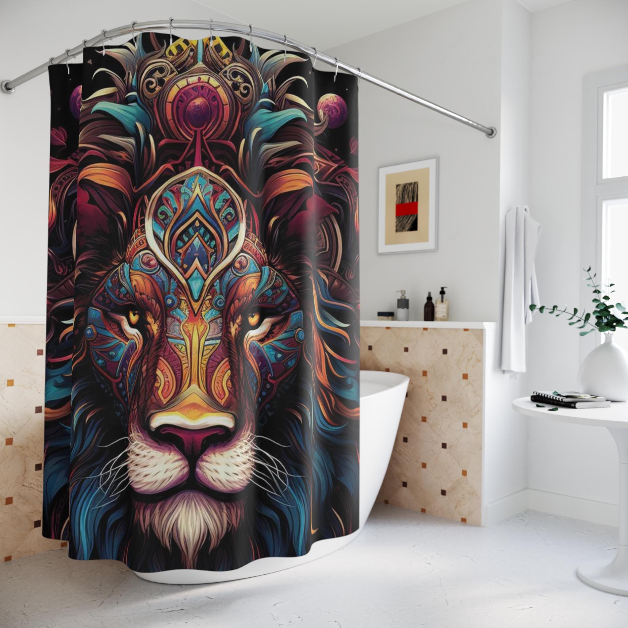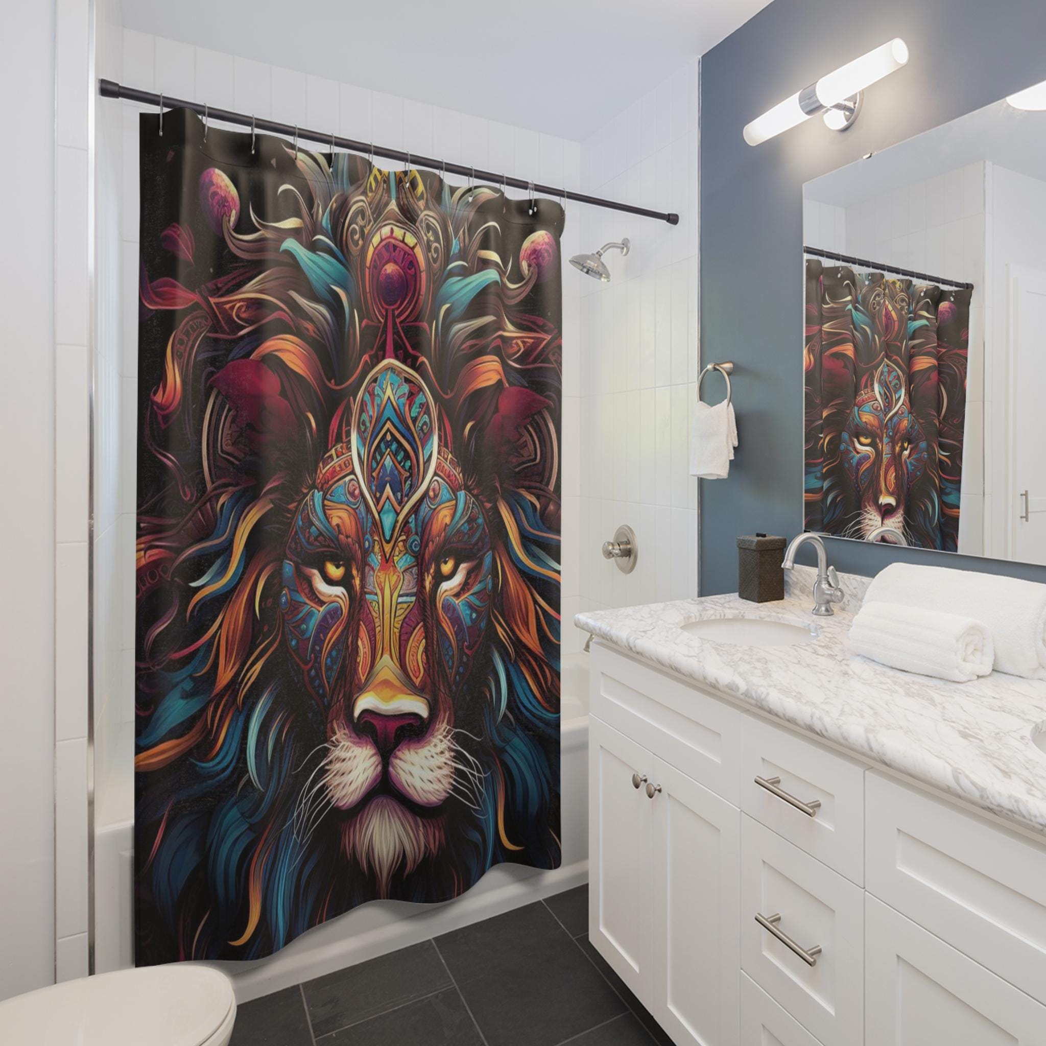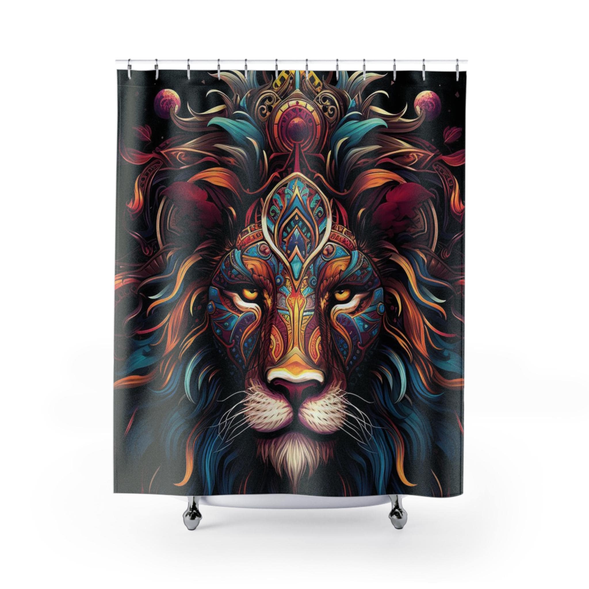 A vibrant shower curtain that brings bold, artistic energy into the bathroom. A richly colored, stylized lion face anchors the design, its ornate mane flowing in jewel-toned swirls of teal, amethyst, and copper. The one-sided print captures fine detail and contrast, creating depth and a slightly mystical atmosphere. Durable 100% polyester fabric resists wrinkling and drying quickly, so the curtain stays vivid and fresh through daily use. With 12 reinforced buttonholes up top for easy hanging, this curtain fits into curated, creative spaces where statement art meets everyday function.