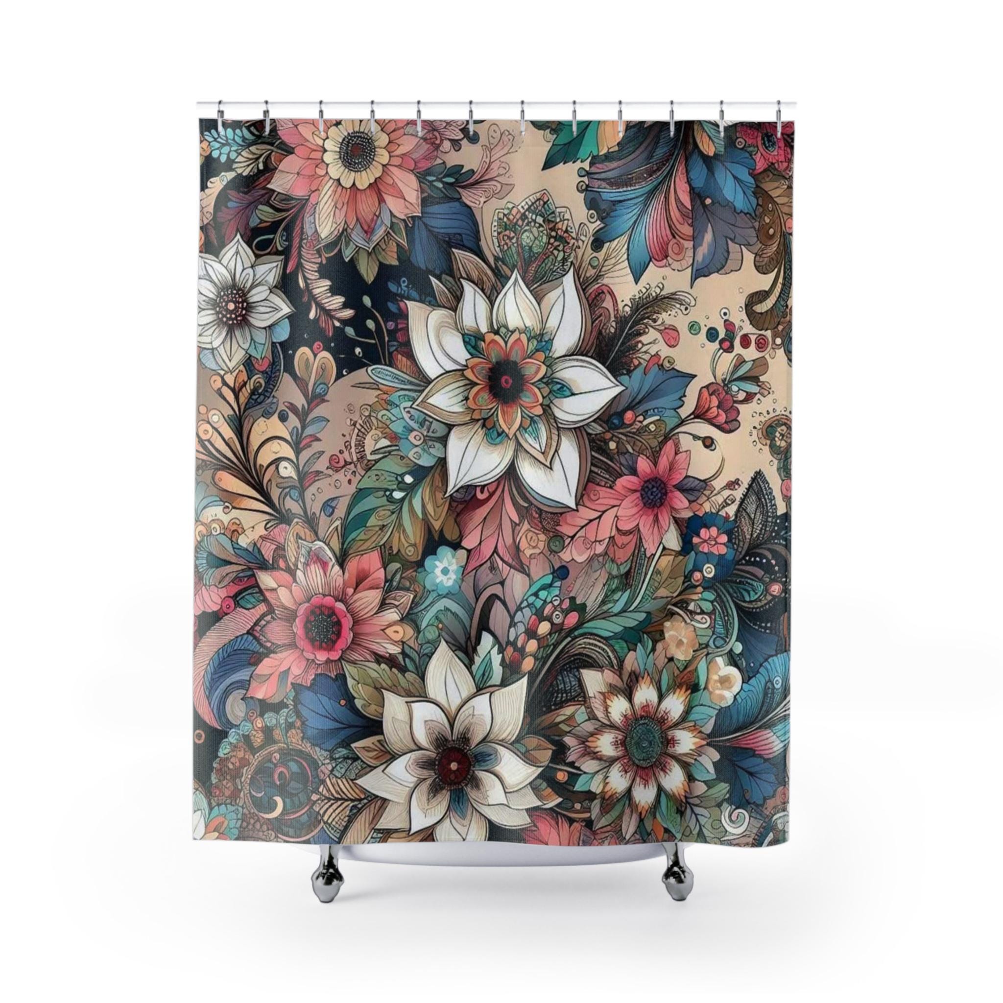 Wrap your bathroom in a lush, painterly garden that feels both vintage and vibrant. This polyester shower curtain showcases layered blooms, ornate leaves, and rich jewel-toned accents that bring depth and warmth to the space. The single-side print keeps the pattern crisp and detailed, while the durable fabric hangs smoothly and dries quickly after showers. Hang it on standard hooks (not included) to transform daily routines into a quiet, floral escape that complements eclectic, bohemian, or cottage-inspired interiors.