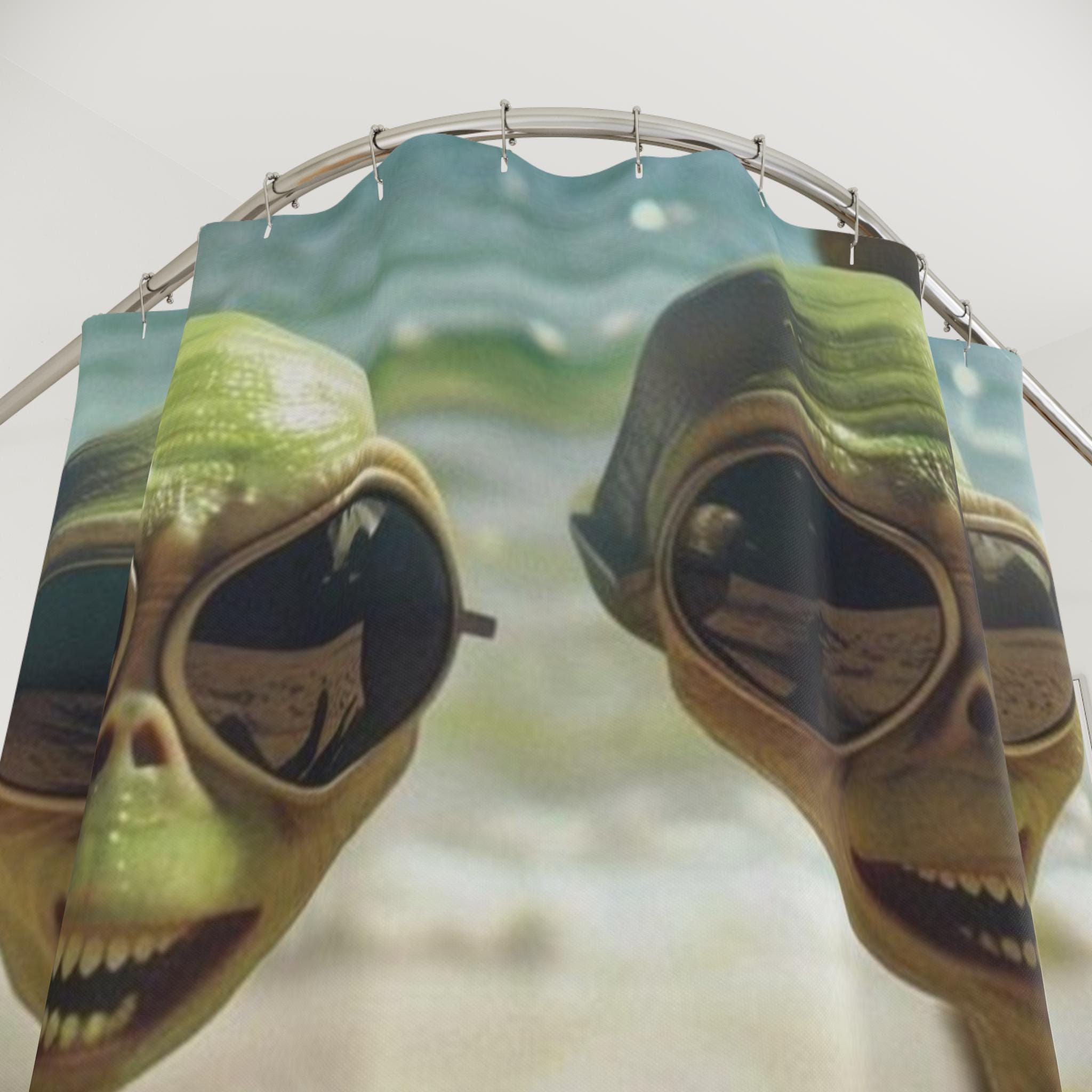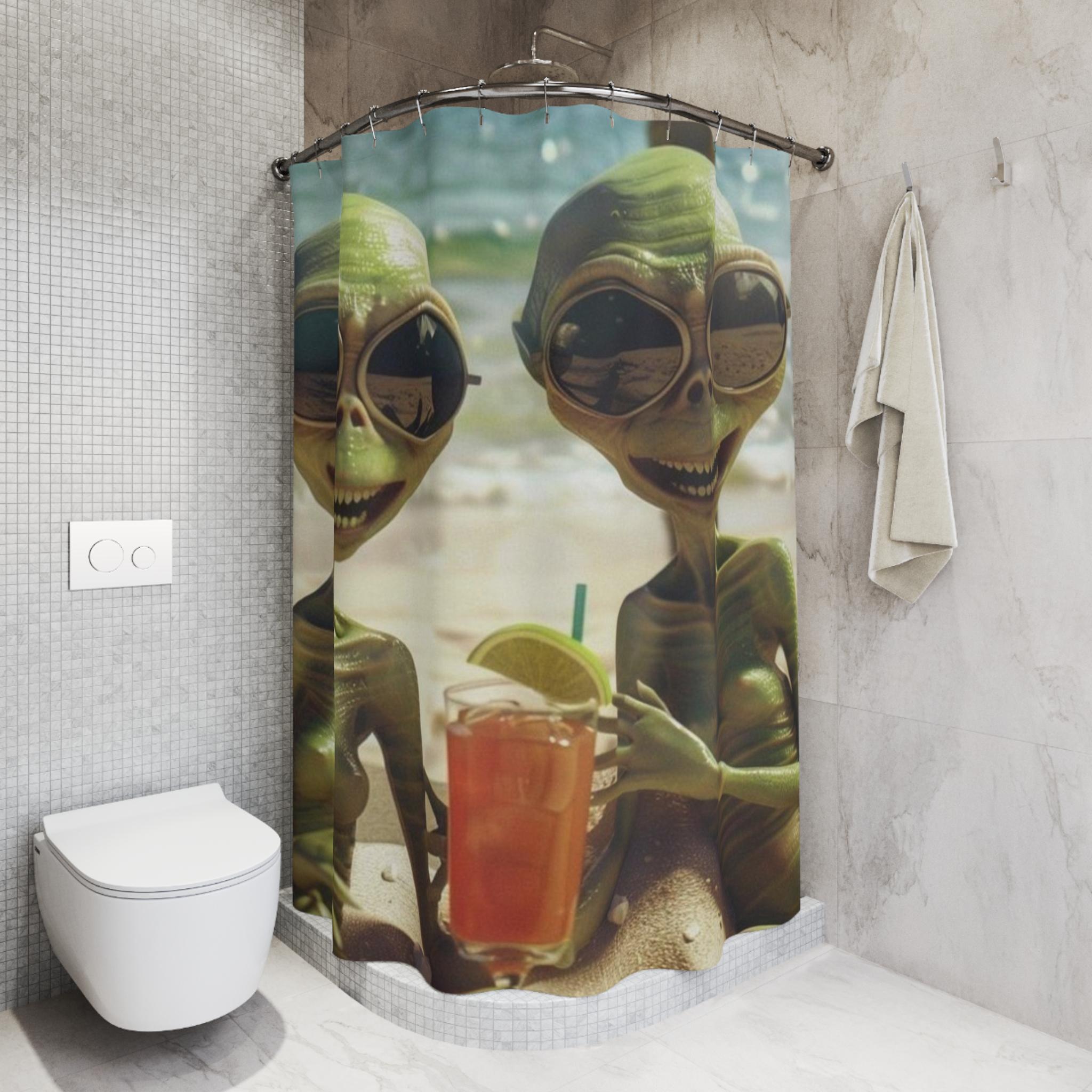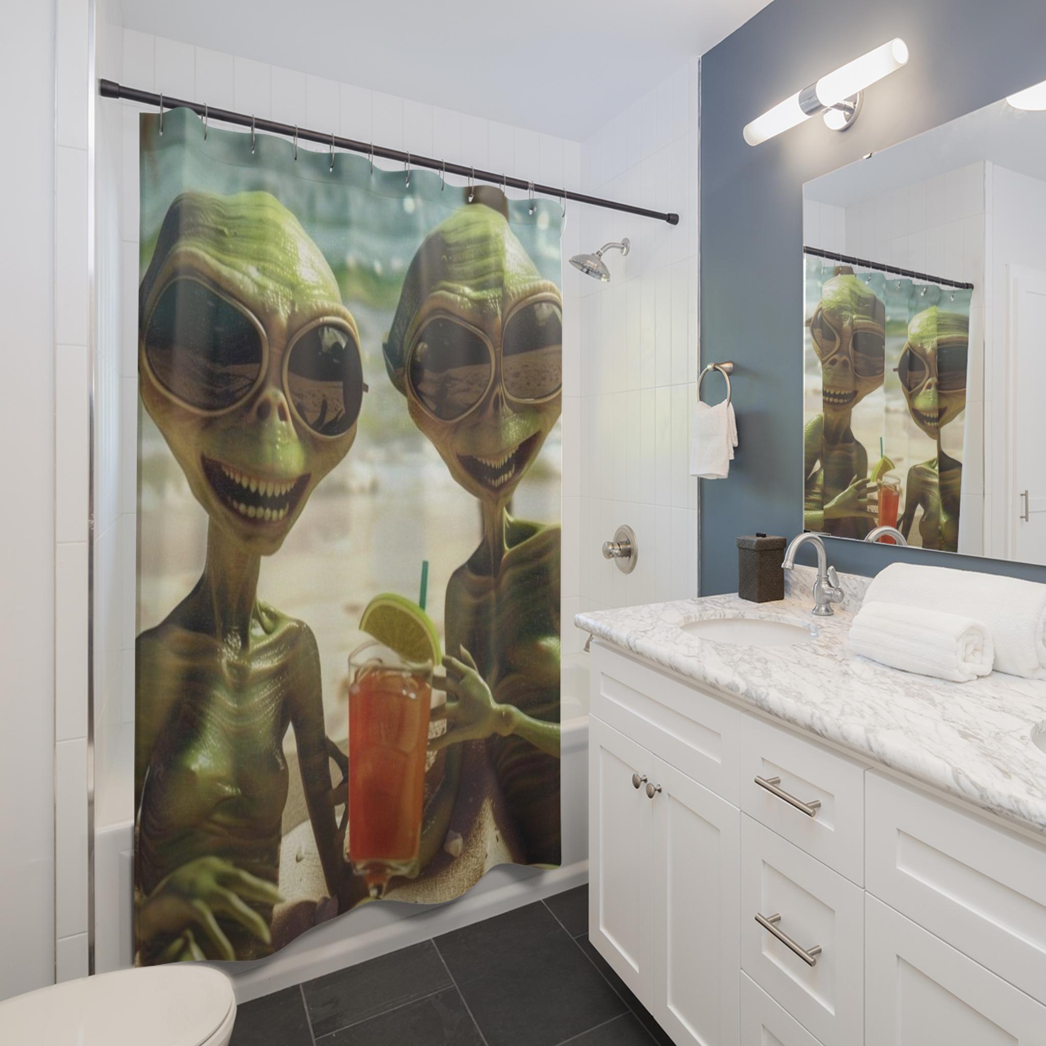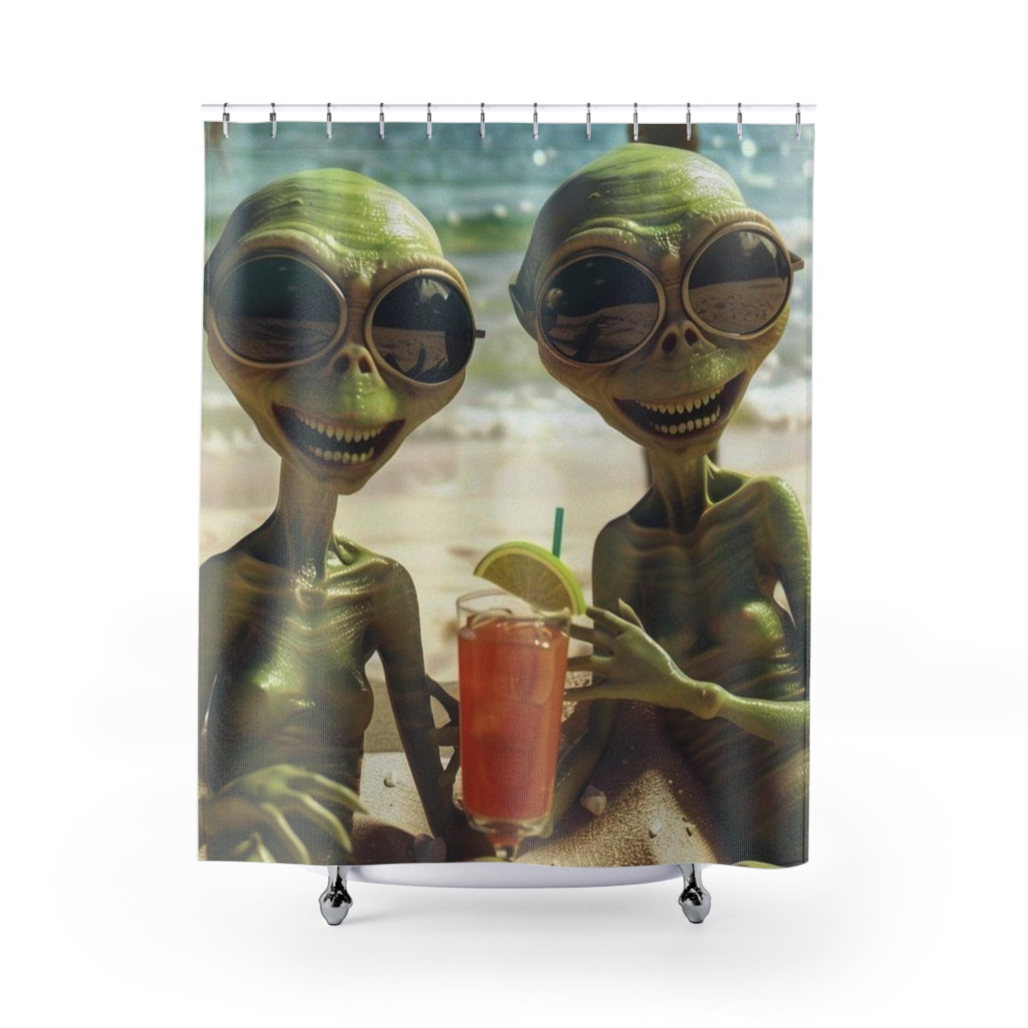 Two sun-soaked aliens laugh together on the shoreline, one holding a bright, icy drink. This shower curtain turns an ordinary bathroom into a playful escape—warm sand and sunny waves meeting a dash of extraterrestrial whimsy. The vibrant, one-sided print keeps colors lively, while fast-drying polyester stays resilient in steamy bathrooms. Hang it on your curved or straight rod and let mornings start with a smile and a little cosmic mischief.