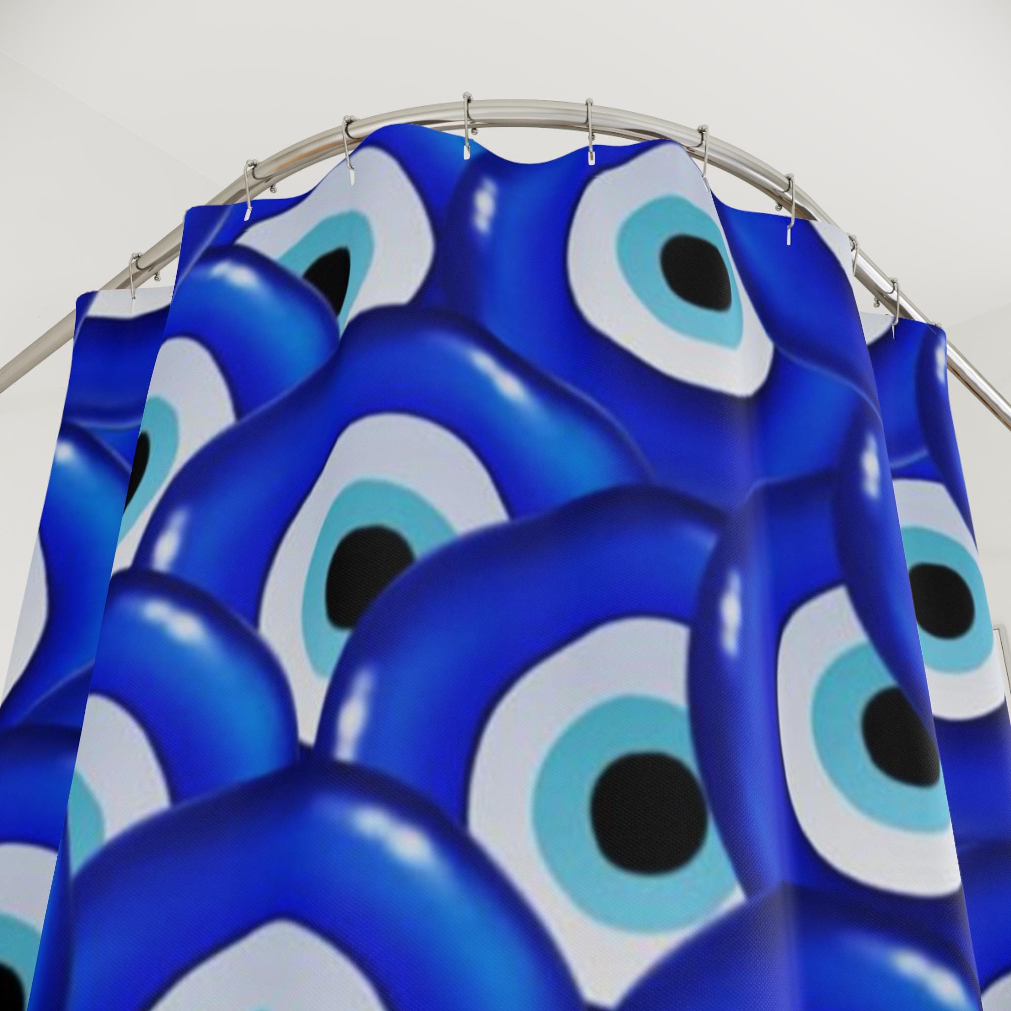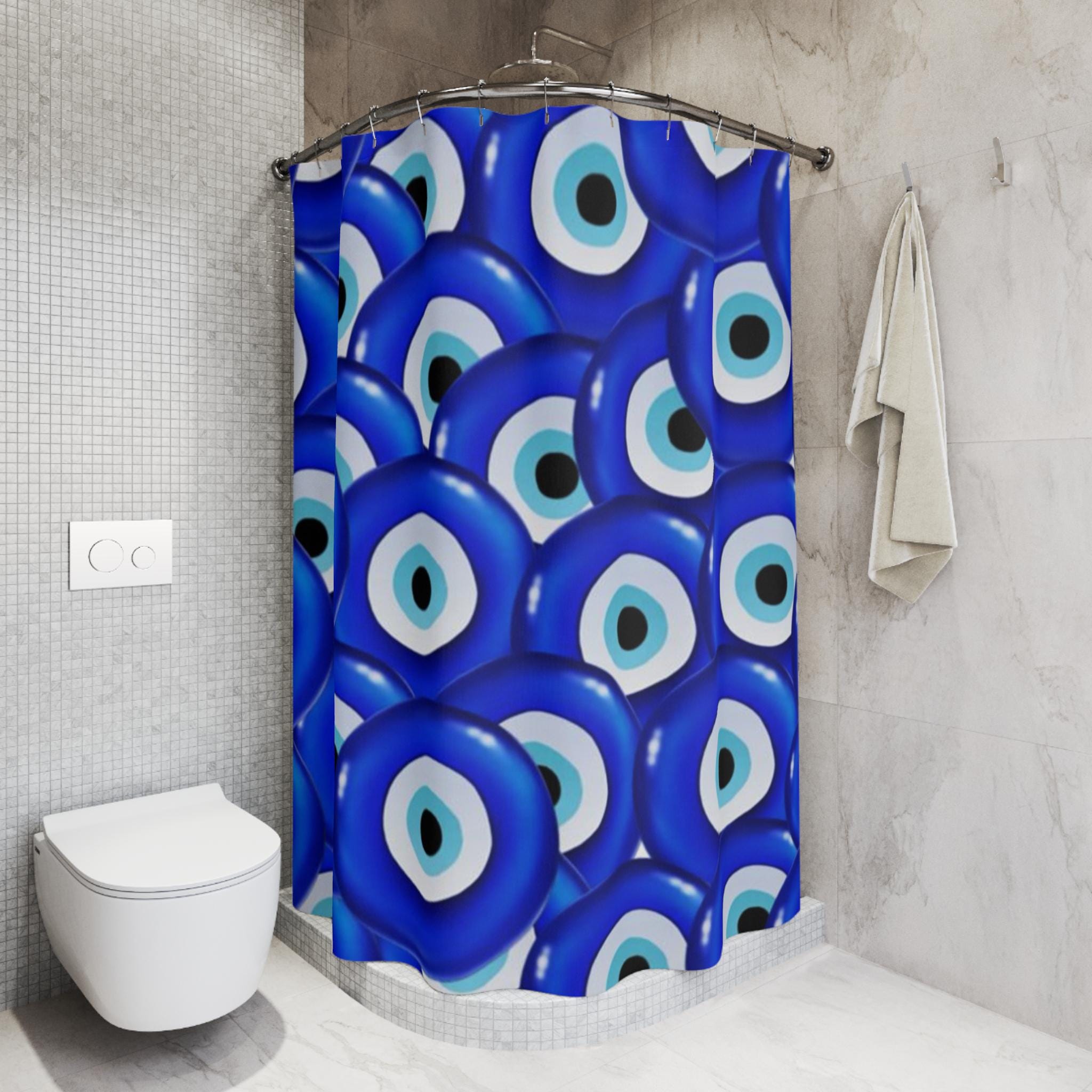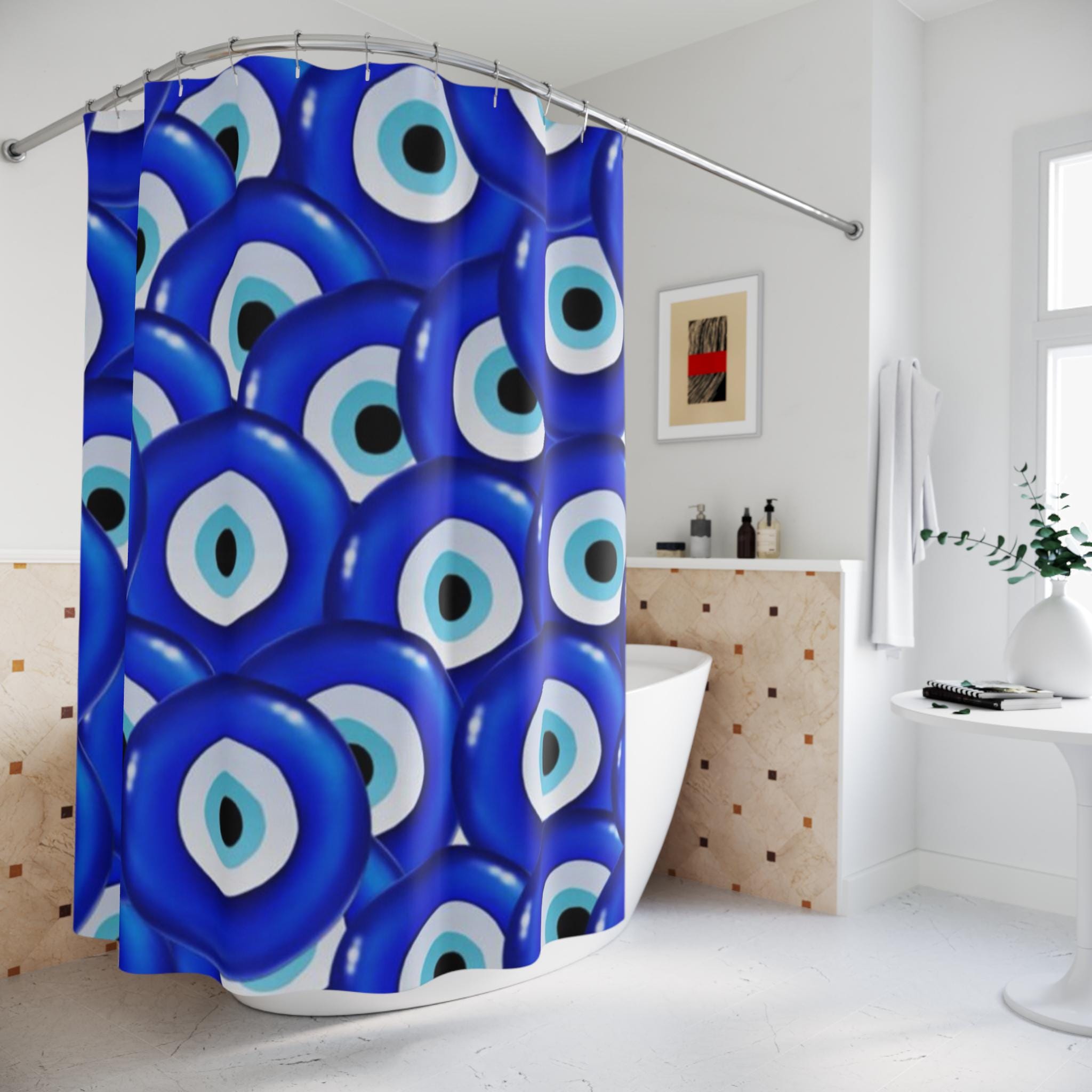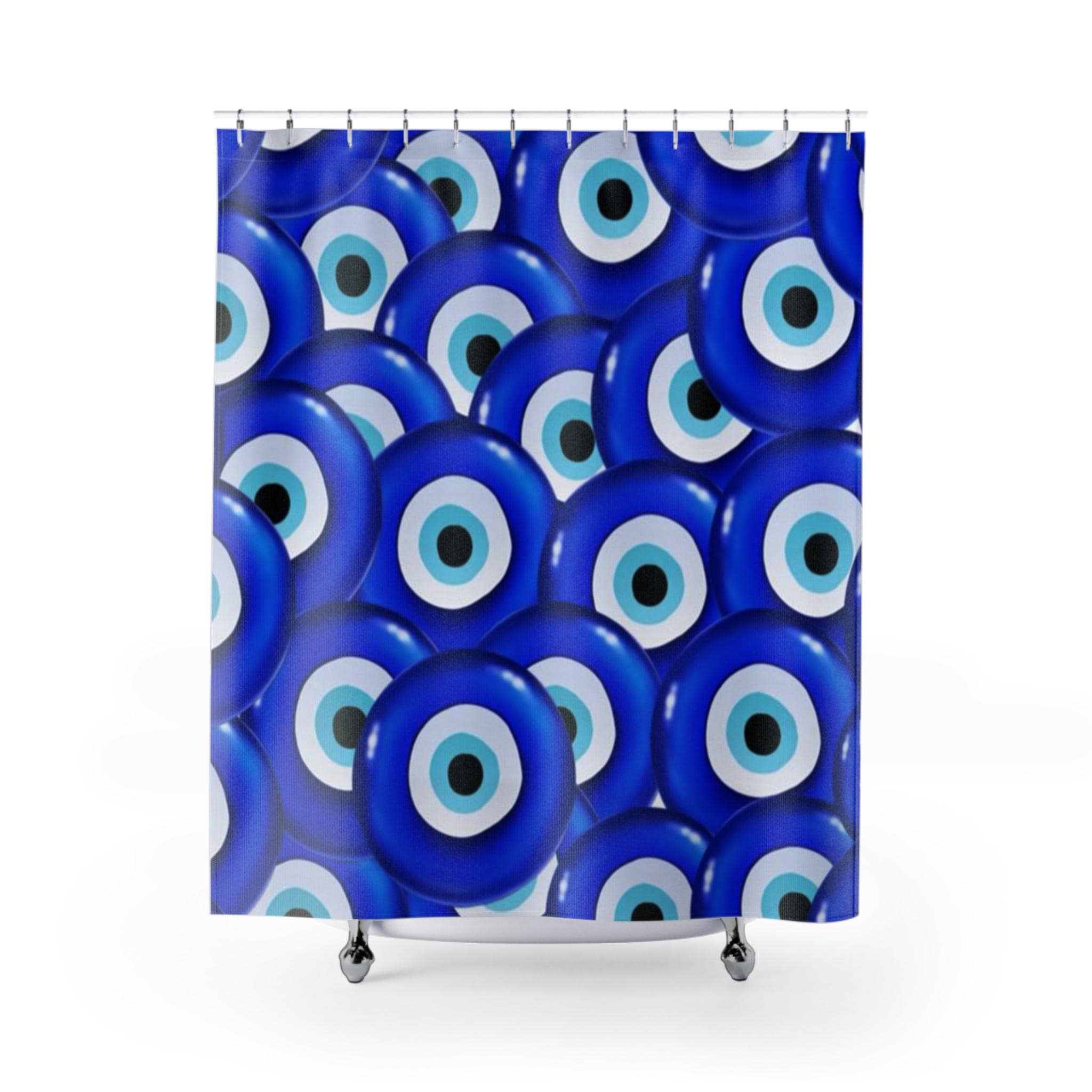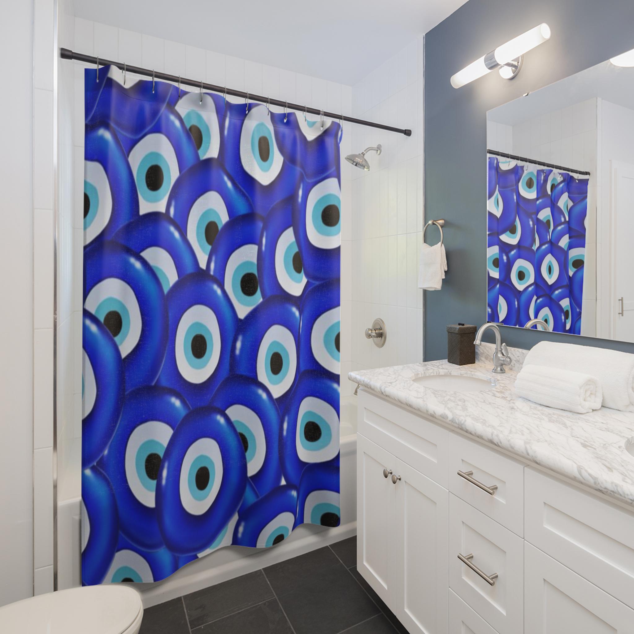 Bring a bold, protective vibe into your bathroom with this eye-catching shower curtain. Deep cobalt blues and layered concentric circles recall the talismanic “evil eye” motif, creating a rhythmic, almost meditative pattern that feels both cultural and contemporary. The one-sided print sits on durable, quick-drying polyester that holds vibrant color and resists wrinkling, so the pattern remains striking through daily use. Twelve reinforced buttonholes make hanging simple with standard hooks (not included). It dresses up a plain tub, anchors a tiled space, and adds a confident, symbolic accent for anyone who loves statement decor with meaning.