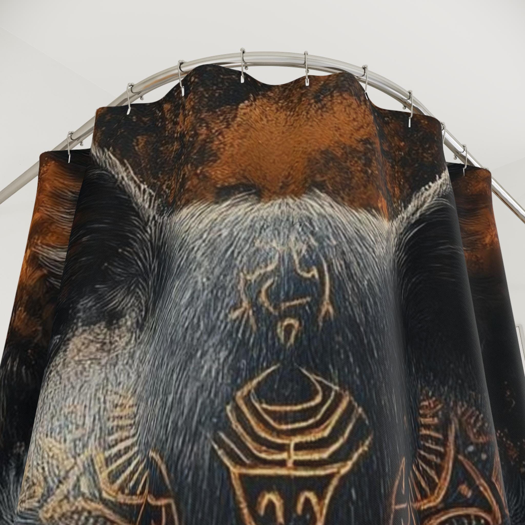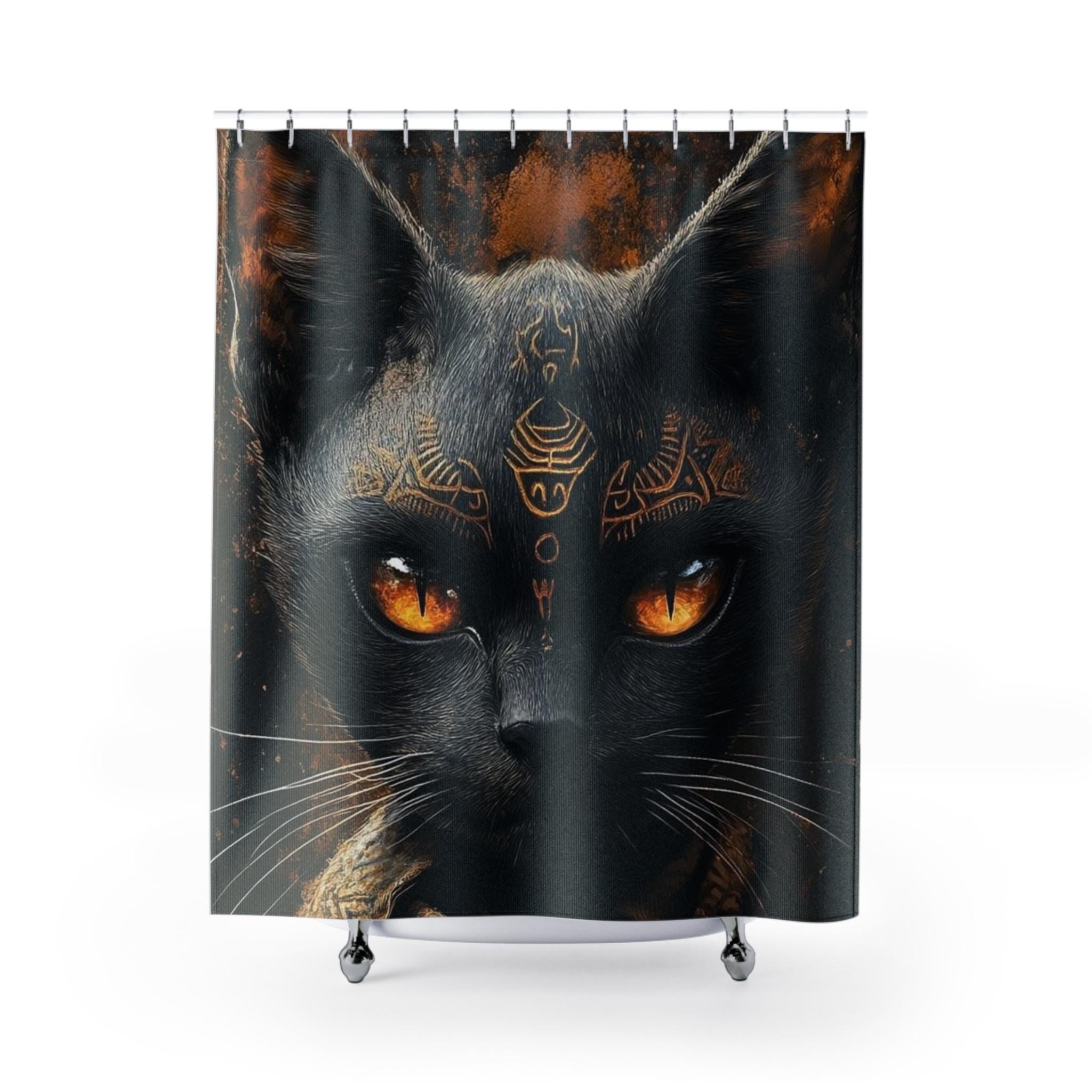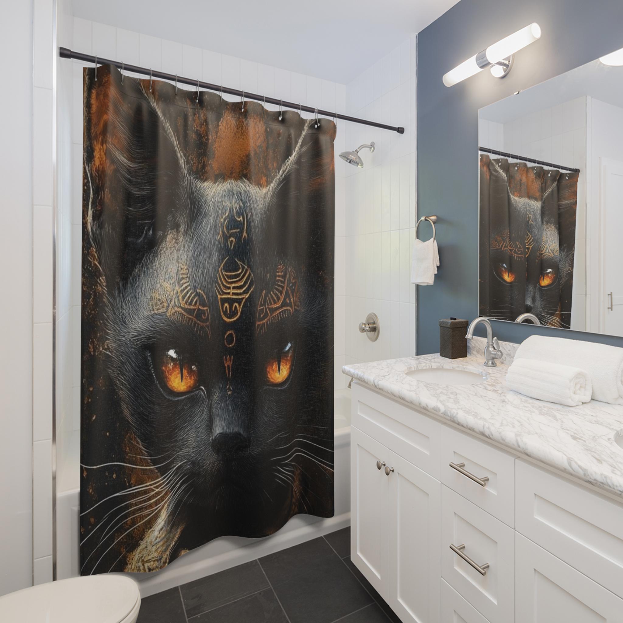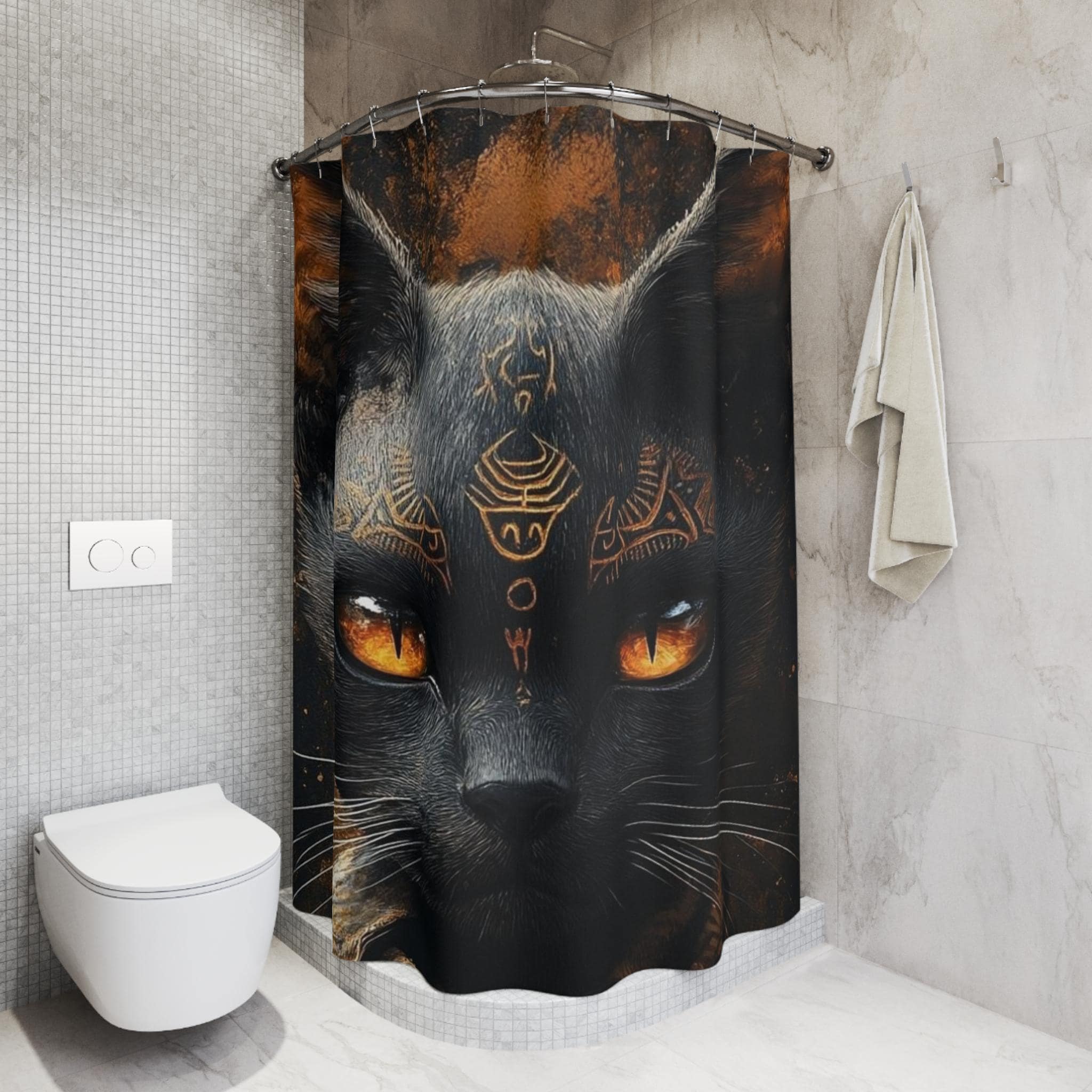 This shower curtain brings a touch of midnight mystery into your bathroom. Deep charcoal fur and molten-amber eyes stare out from the fabric, framed by subtle, rune-like markings that suggest old stories and quiet power. The one-sided print keeps the image striking and bold on the room-facing side while remaining practical and easy to pair with dark or warm-toned decor. Hang it where morning routines meet moments of calm — the design invites a pause, a breath, and a tiny ritual of wonder before the day begins or as evening unwinds.