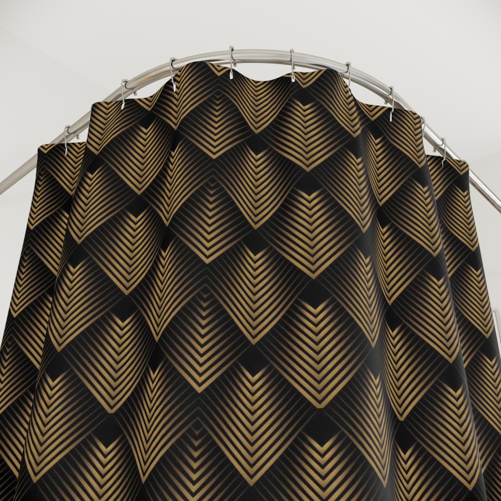Transform your bathroom into a quietly dramatic space with this textured geometric shower curtain. The layered diamond pattern in warm bronze and deep charcoal creates a sense of depth and movement, like soft light falling across woven metal. It hangs with neat, evenly spaced top buttonholes and drapes in smooth folds that keep the pattern bold and steady. For someone who favors moody, sophisticated interiors, this curtain brings a contemplative, gallery-like atmosphere to everyday routines — a small, steady ritual that elevates the room.