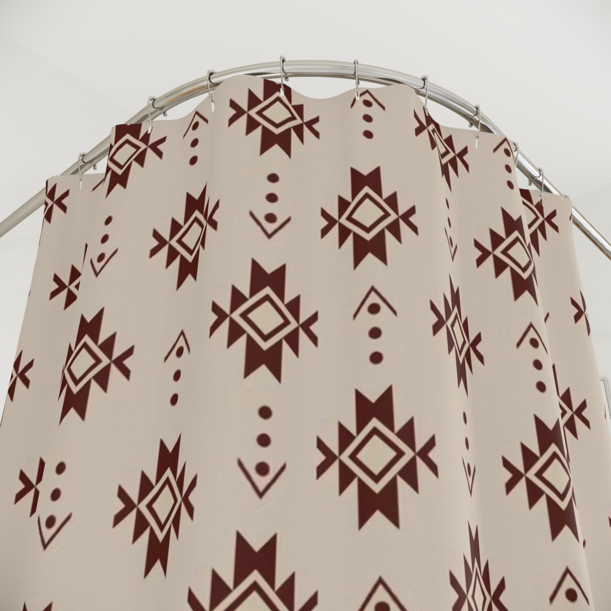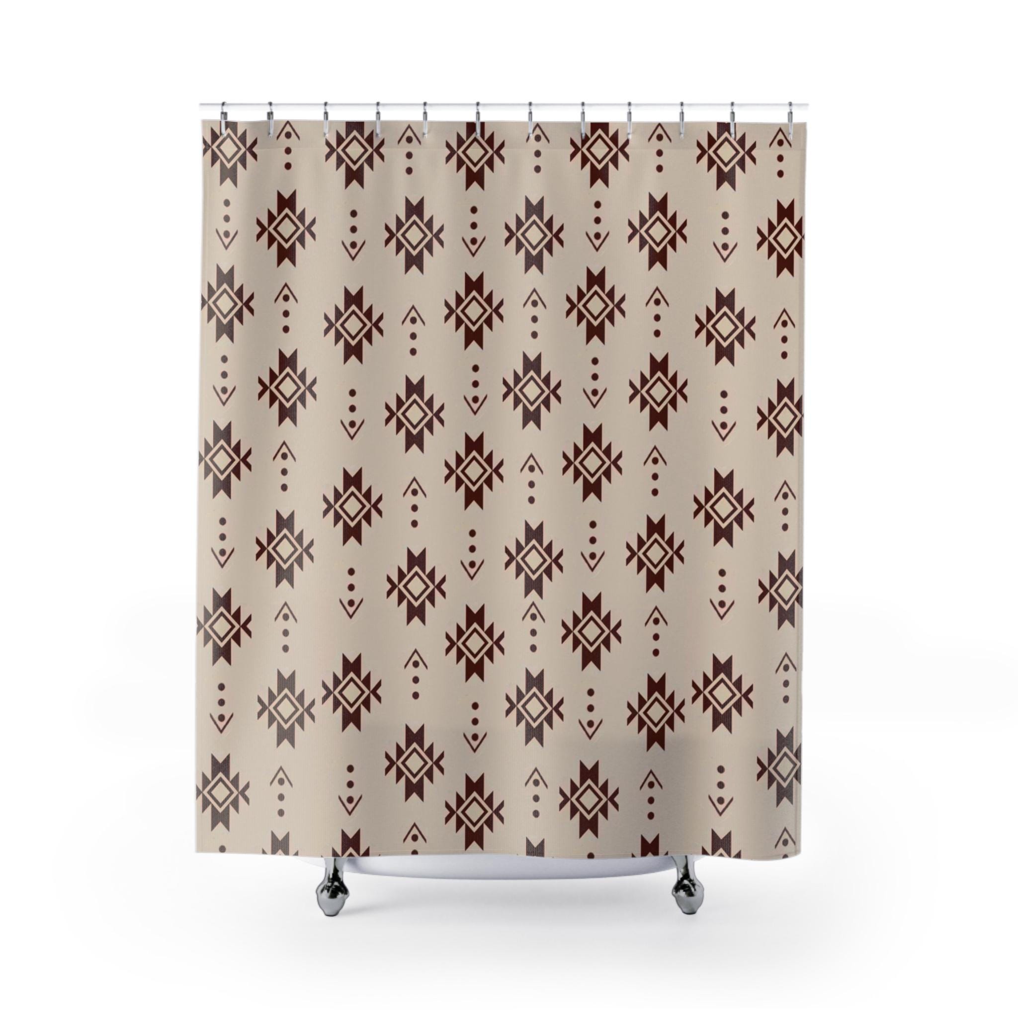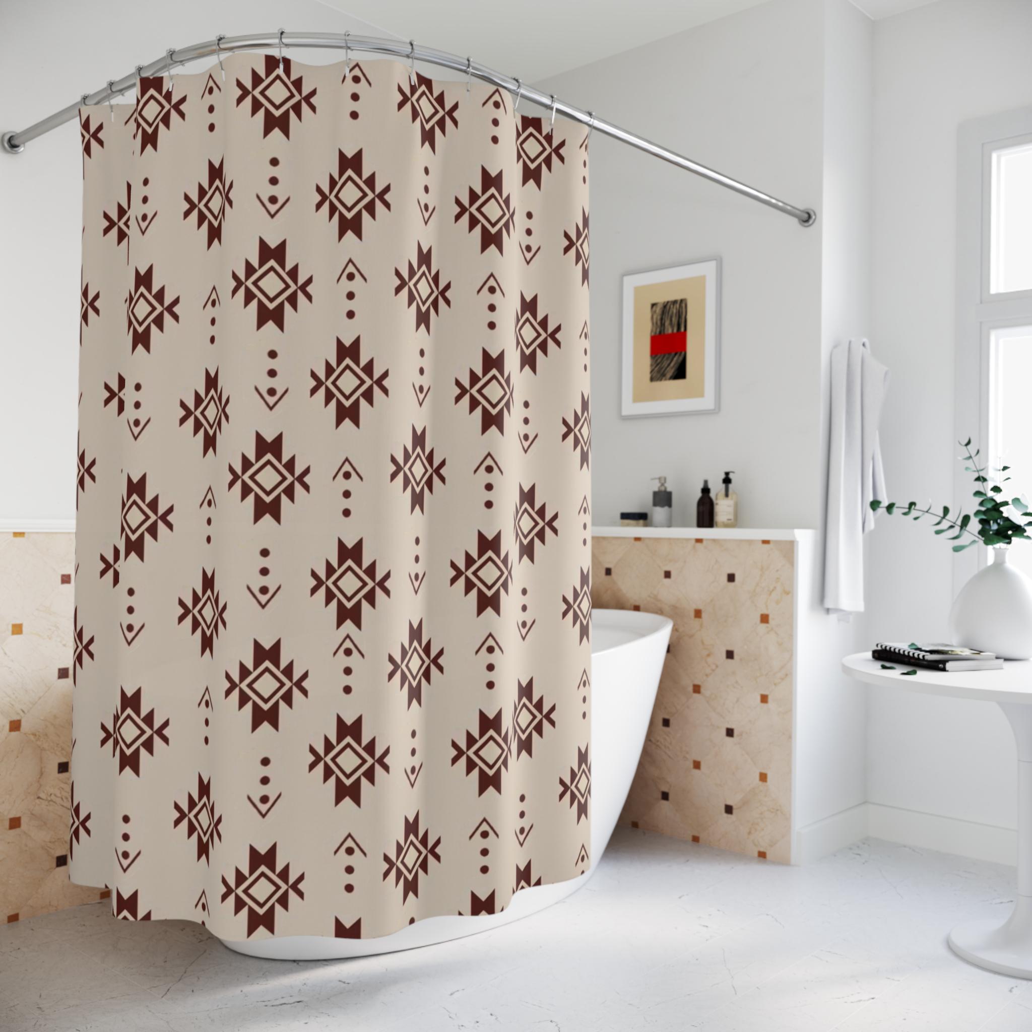 Bring warm, earthy pattern and quiet geometry into your bathroom with this durable polyester shower curtain. The repeating tribal-inspired motifs—rich chocolate shapes on a soft beige ground—create a calm, grounded atmosphere that fits both modern rustic and boho spaces. Heavy-duty polyester holds its shape and sheds moisture, so the print stays vivid while the fabric dries quickly. The curtain hangs from 12 top buttonholes (hooks not included) and adds a tactile layer of pattern that softens tile and metal finishes. It’s the kind of piece that makes a morning routine feel intentional and an evening wind-down feel collected and cozy.