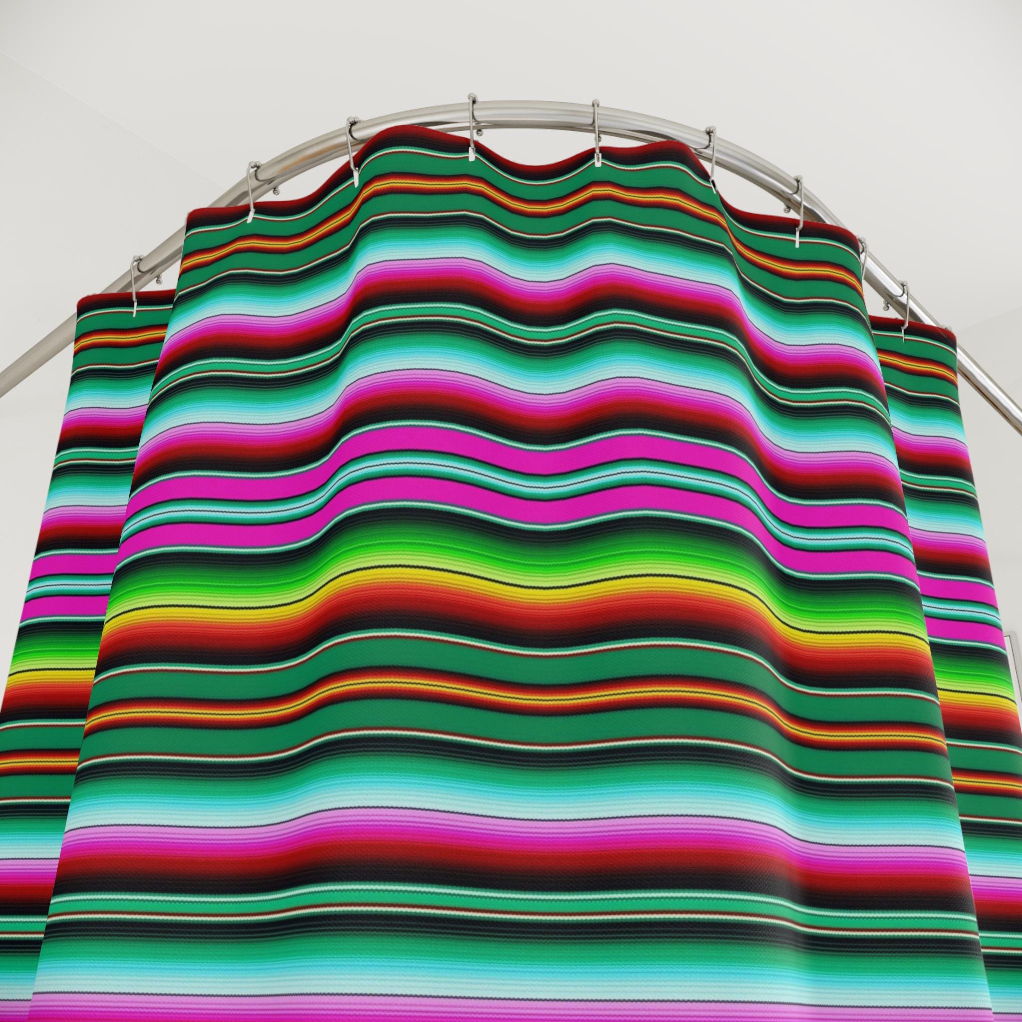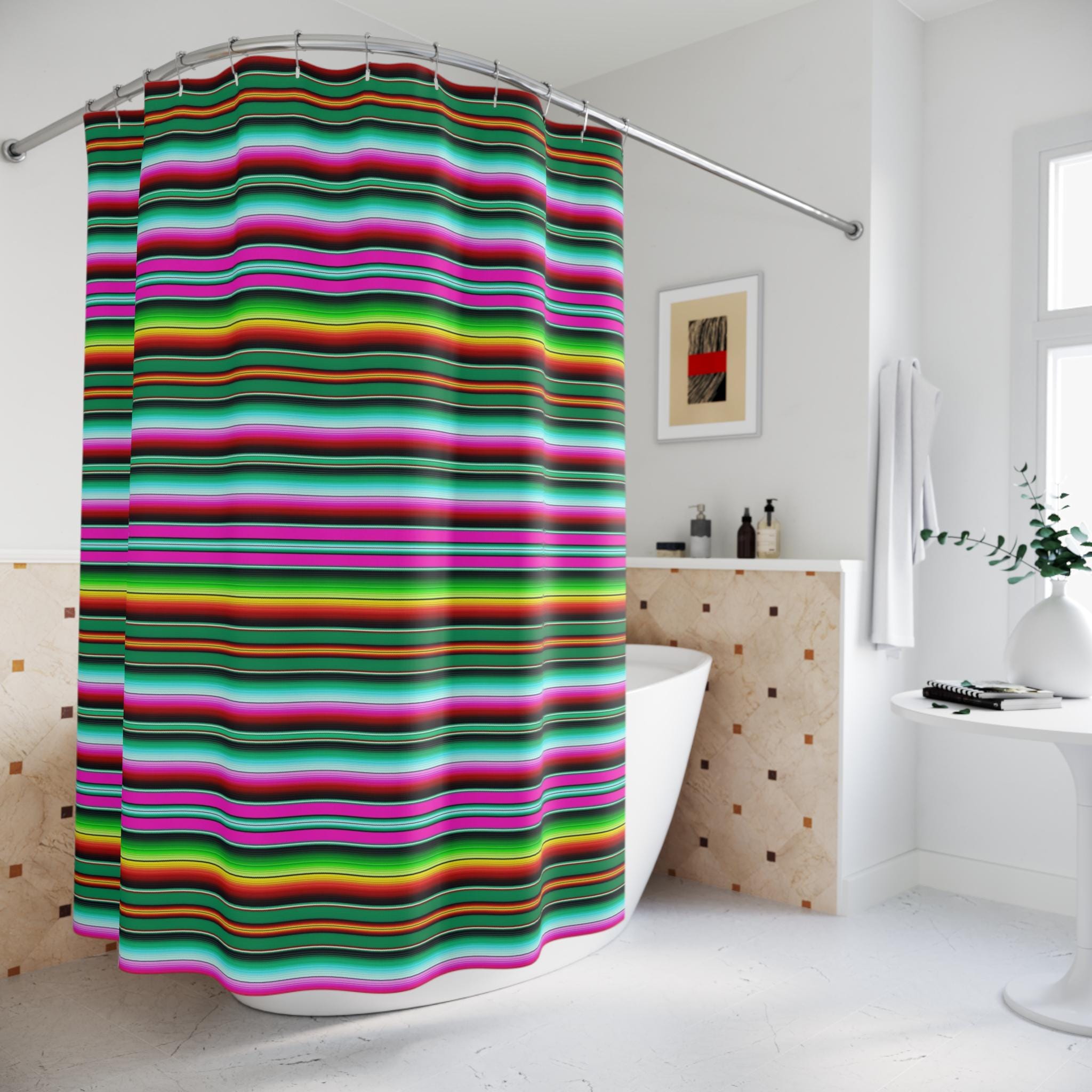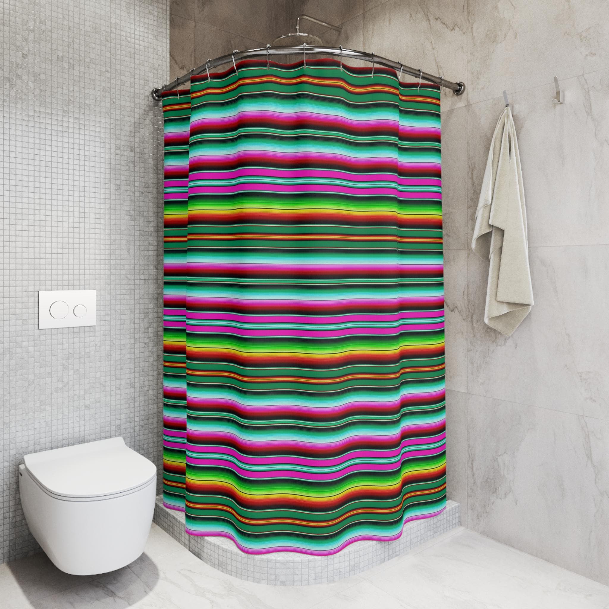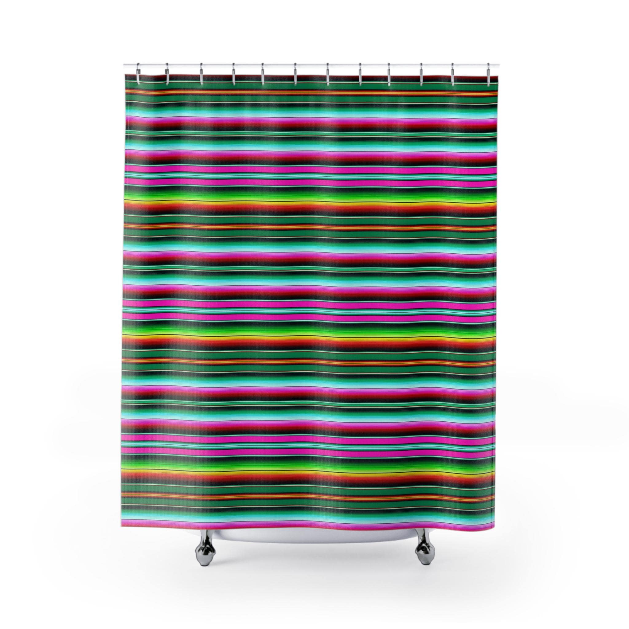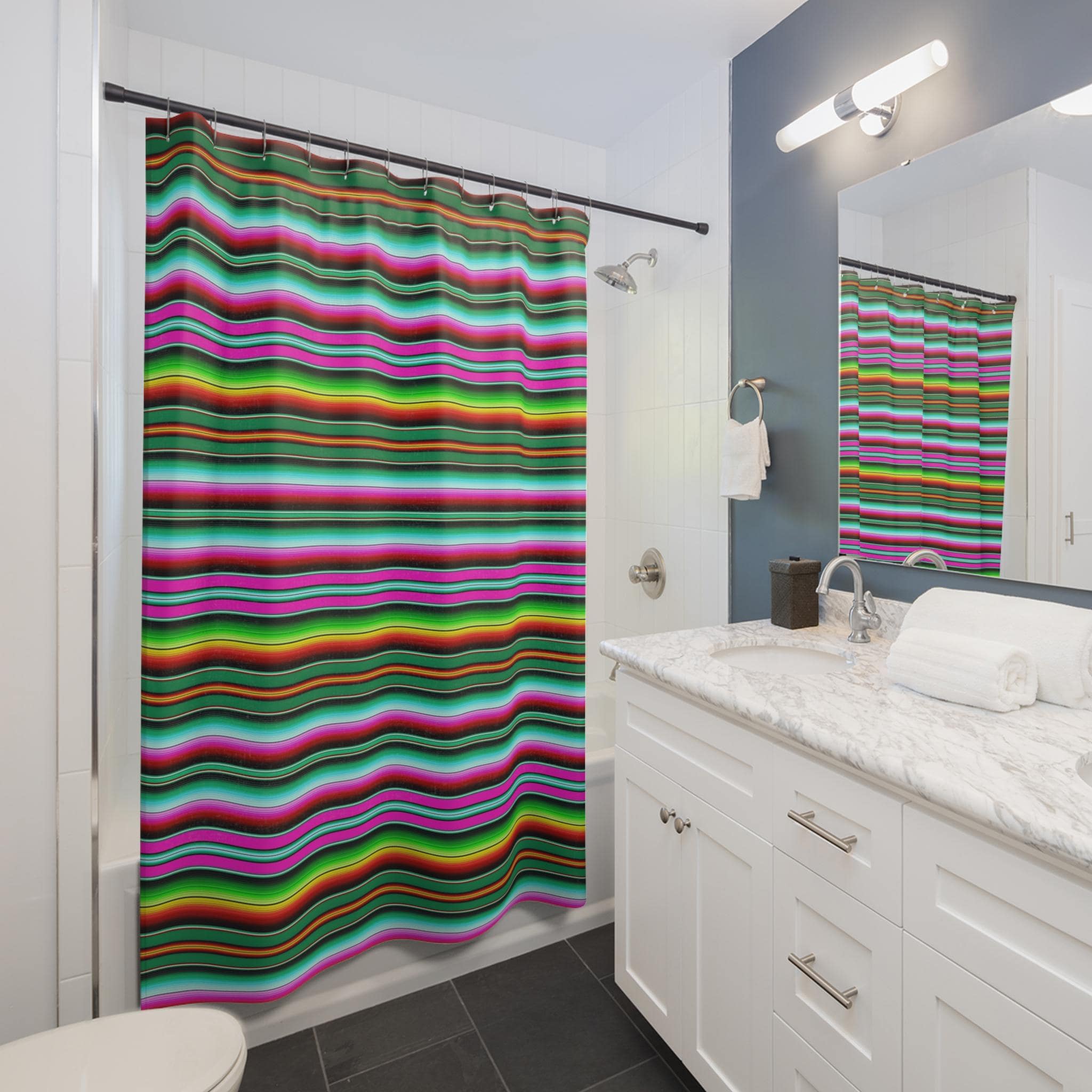 Bring a burst of color and rhythmic motion into your bathroom with this vibrant striped shower curtain. Bright bands of teal, magenta, lime, and cocoa ripple across a durable polyester surface, creating an energetic, almost musical backdrop. The one-sided print reads like a modern take on woven textiles — lively and warm — while the quick-drying fabric keeps maintenance easy. Hang it on any standard rod and let those fluid stripes transform a morning routine into a small joyful moment.