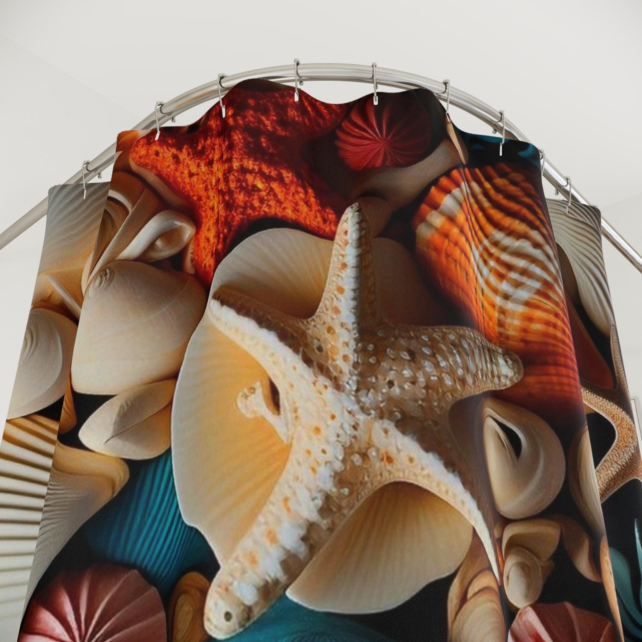 Product features - Durable 100% polyester fabric that holds color and resists wrinkling - One-sided, high-resolution print showing shells and starfish - Twelve reinforced buttonholes for standard shower hooks (hooks not included) - Quick-drying, shape-retaining material suitable for daily bathroom use - Pre-constructed size with possible variance of ±2"; adult use