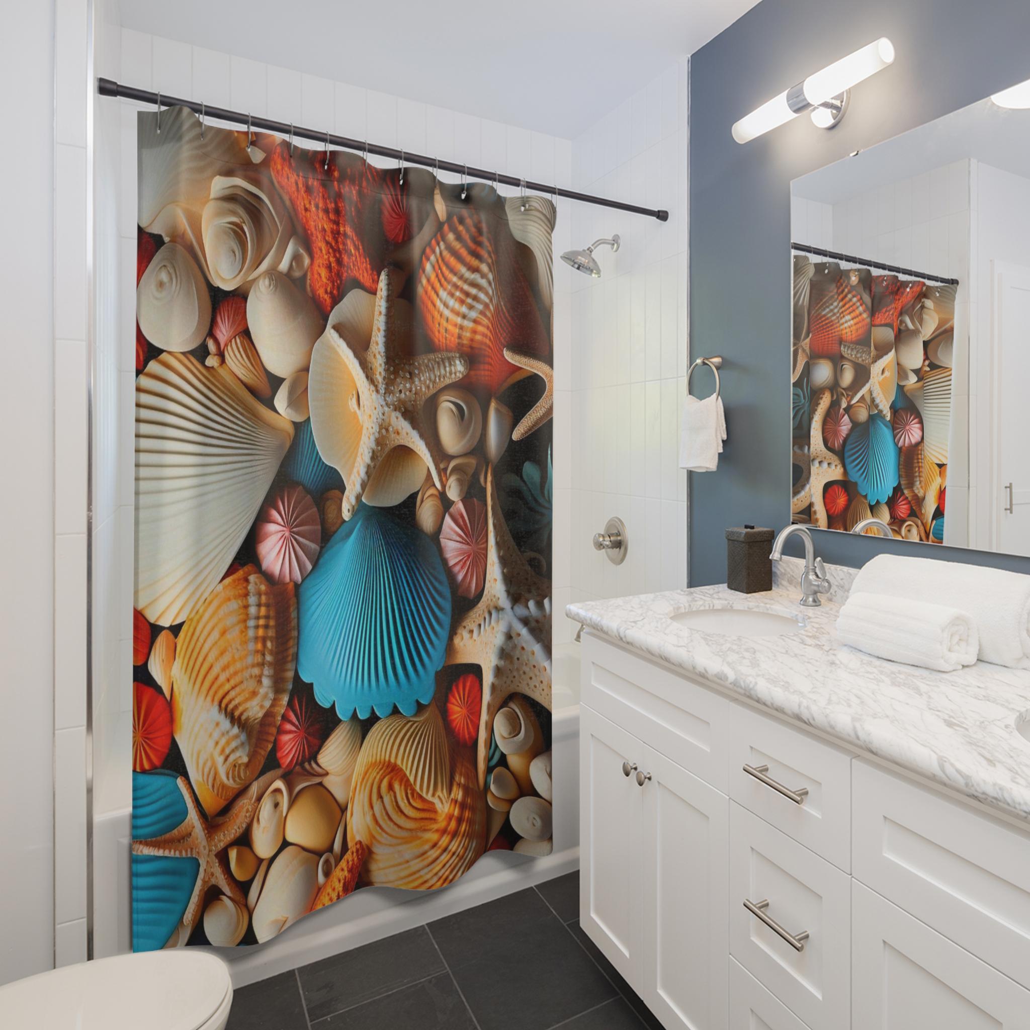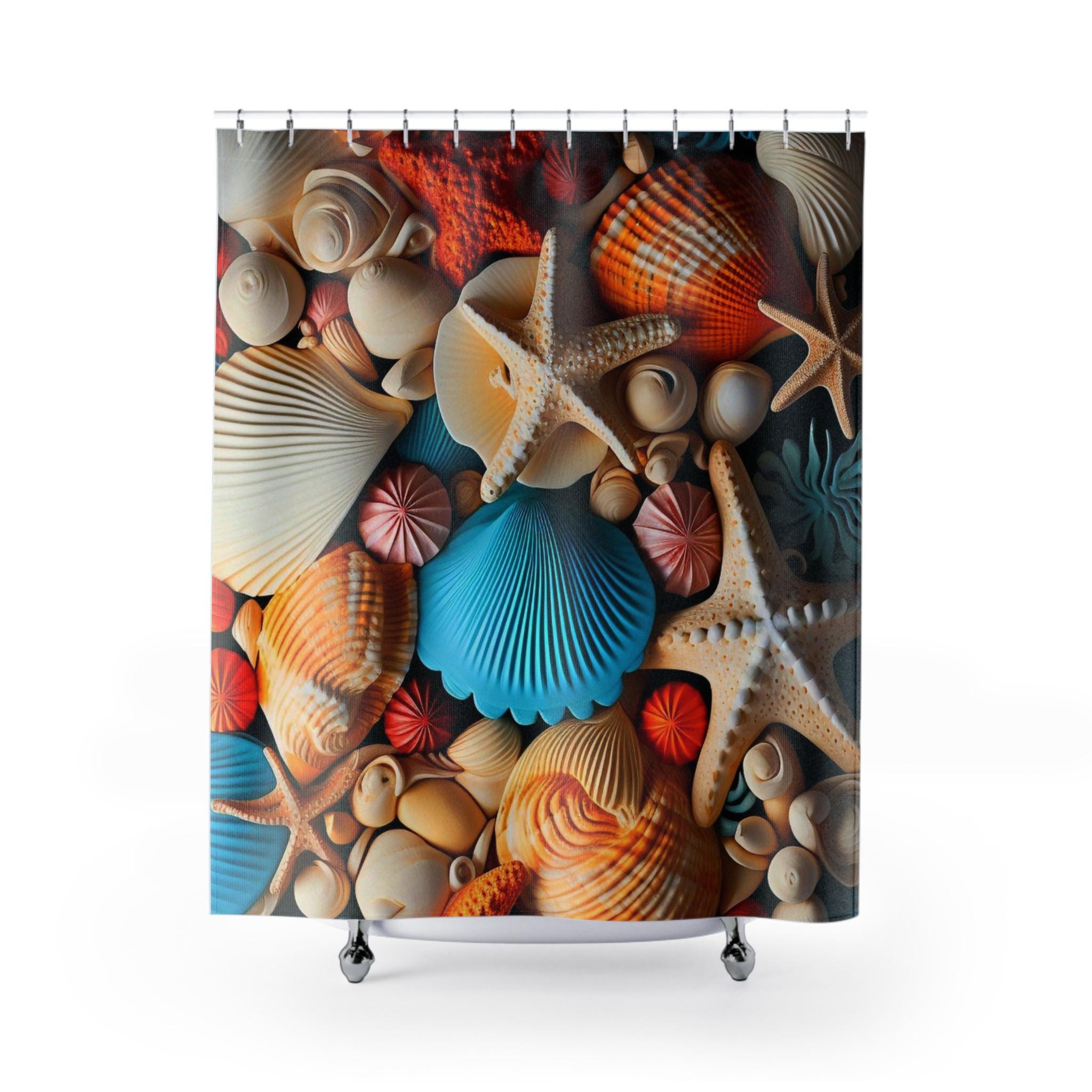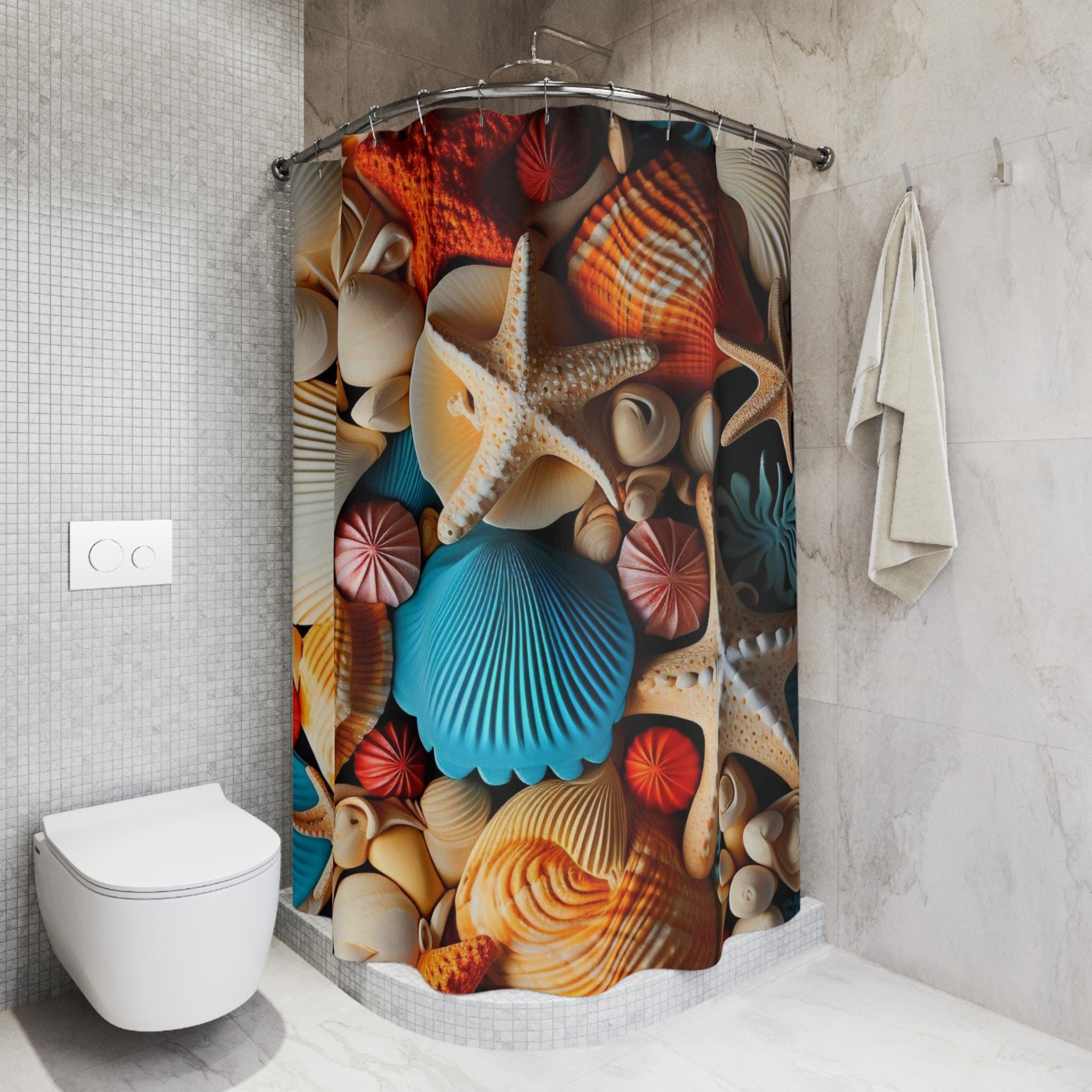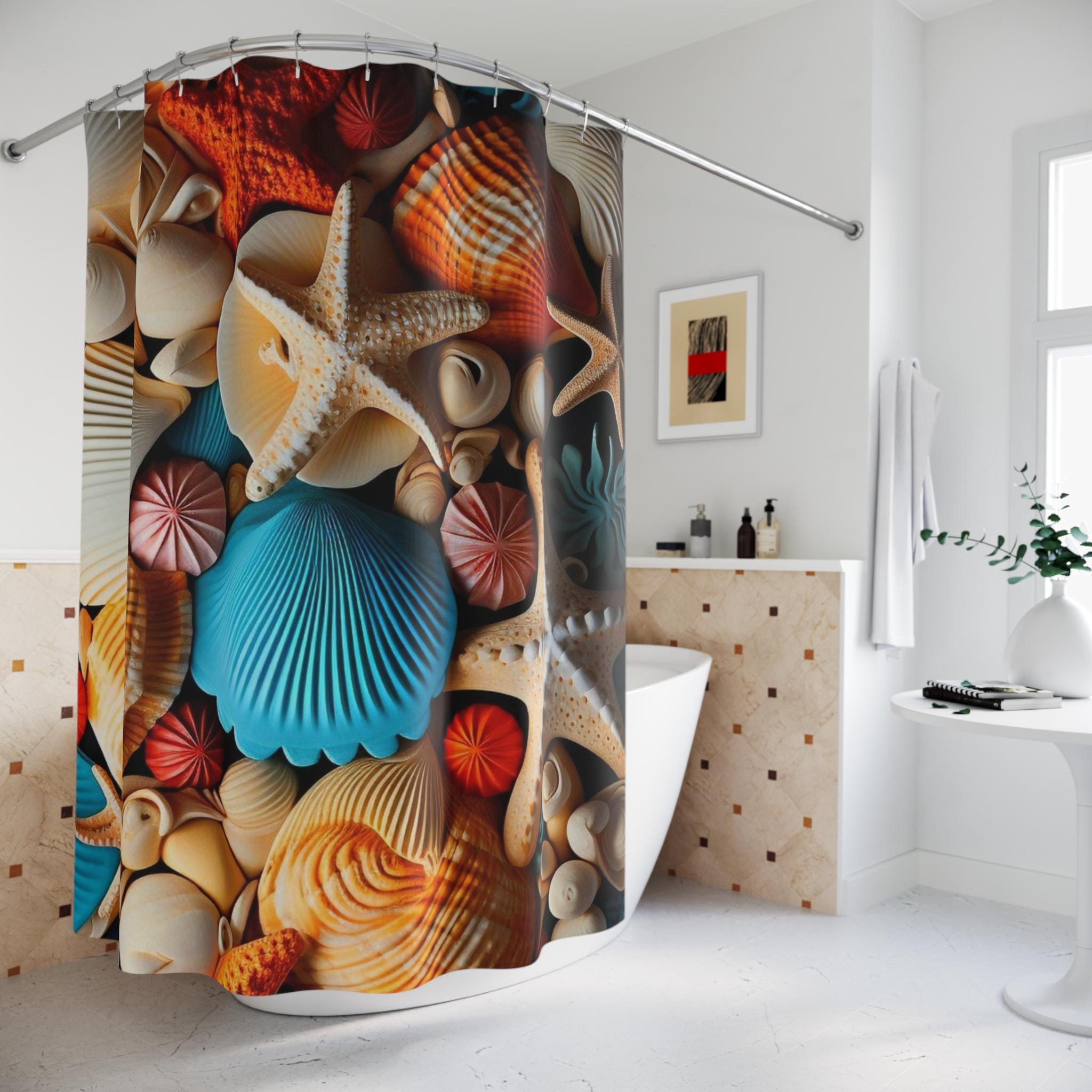 Bring a slice of shore to your bathroom with this vibrant, textured shell and starfish shower curtain. Rich corals, sandy creams, and surprise teal accents layer together in a styled collage that reads like a tide-pool still life. The heavyweight polyester holds color beautifully and drapes with a soft, tactile presence that turns a simple rinse into a small coastal ritual. Hang it on any curved or straight rod to anchor a bathroom with beach memories — morning light, the hush of waves, and the quiet joy of finding a perfect shell.