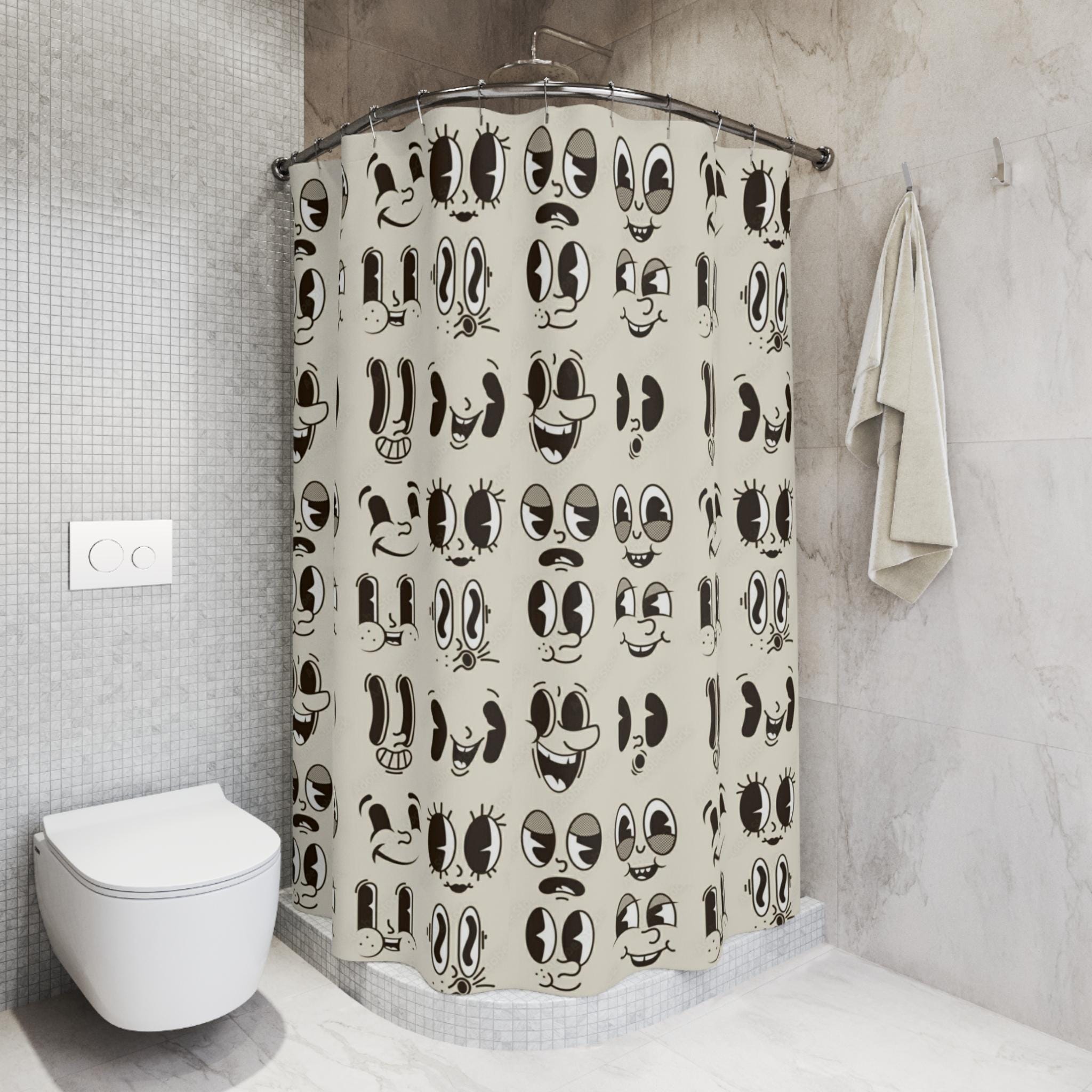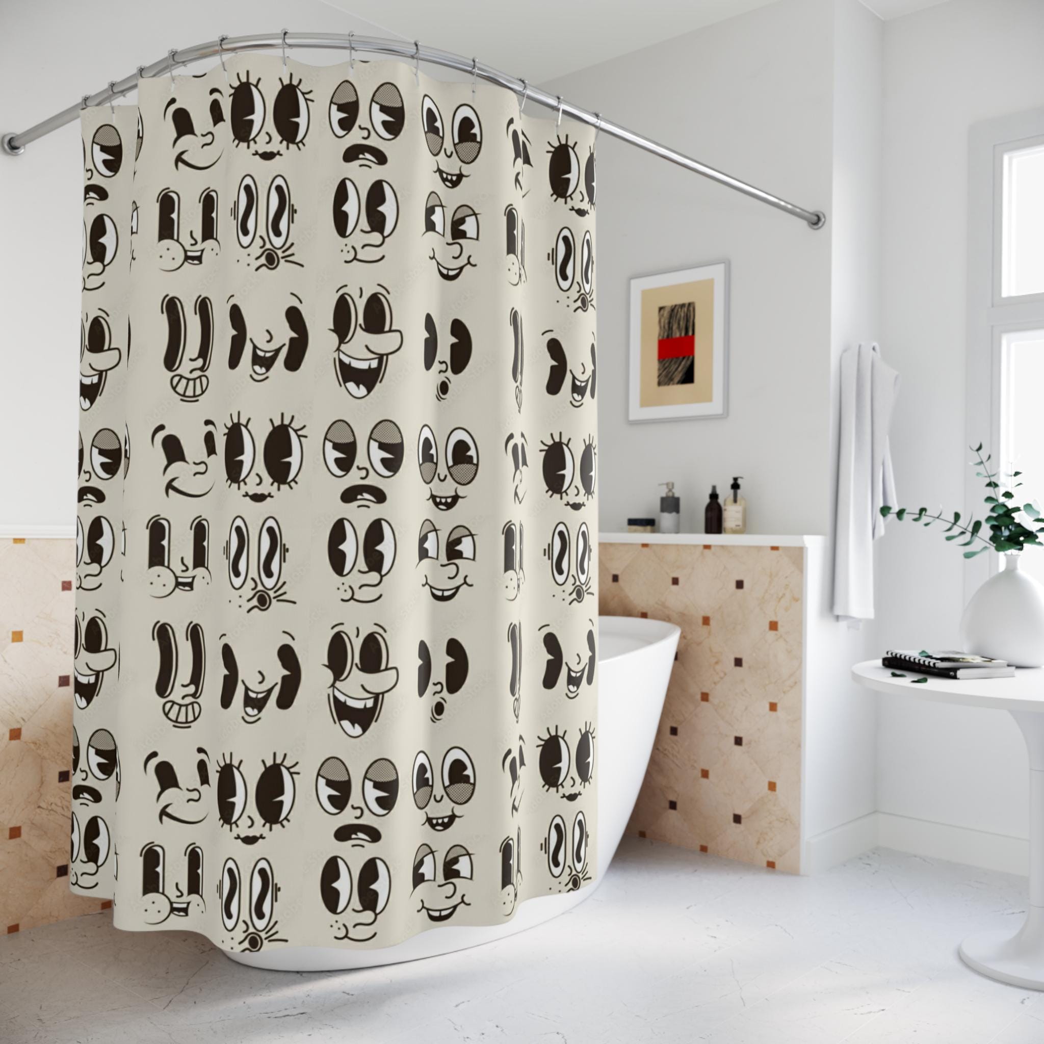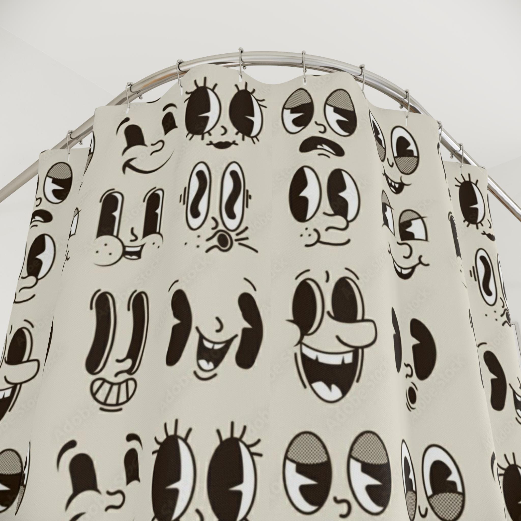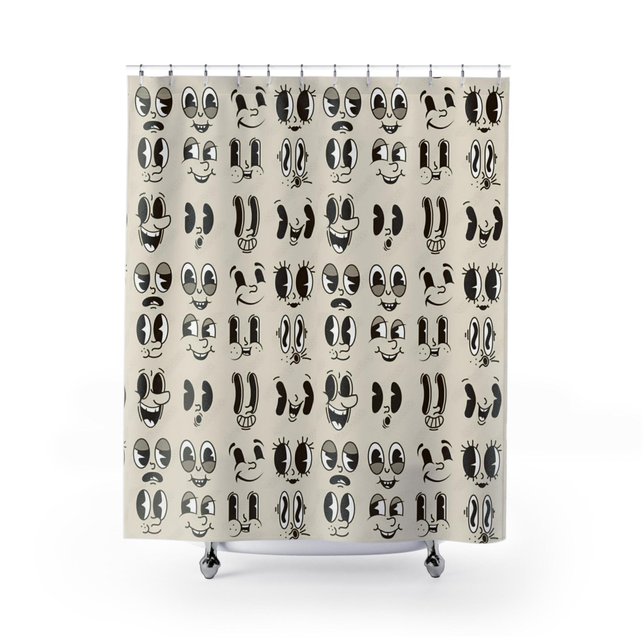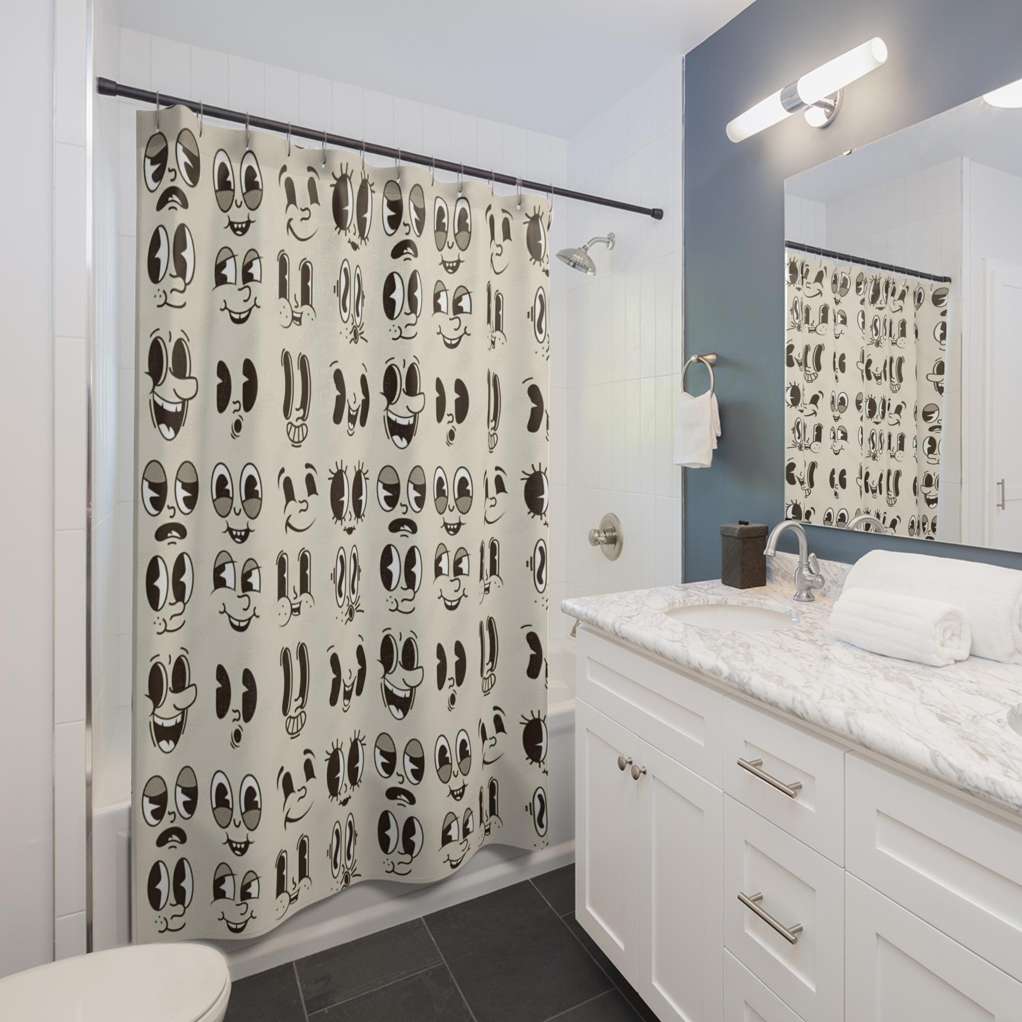Bring playful vintage charm to your bathroom with this illustrated polyester shower curtain. Rows of quirky, hand-drawn cartoon eyes and smiles float across a warm cream background, turning a routine shower into a moment of whimsy. The one-sided print has a slightly textured, retro ink look that reads like a cheerful sketchbook — fun without feeling youthful. Lightweight and quick-drying, it hangs neatly from 12 reinforced buttonholes (hooks not included) and adds personality to small apartments, shared bathrooms, or a creative studio washroom. Let it peek from behind the tub and spark a smile every morning or soften the mood during an evening wind-down.