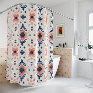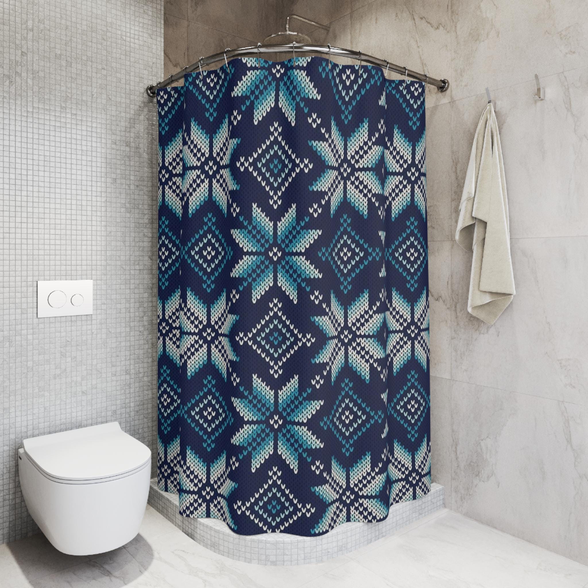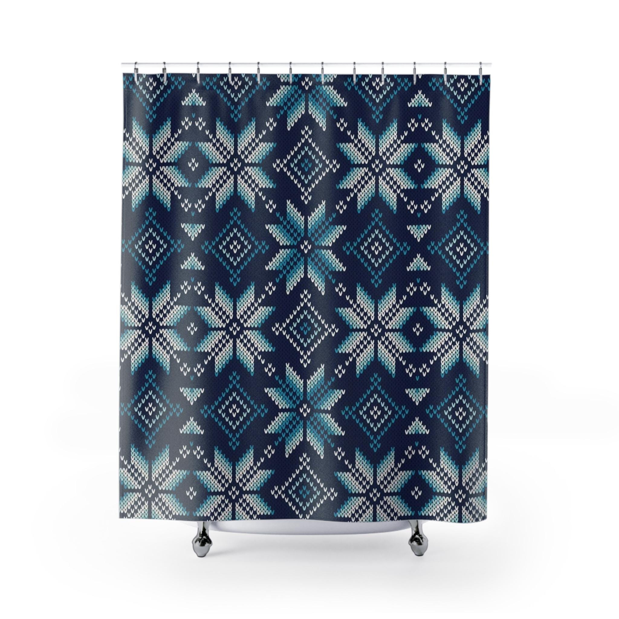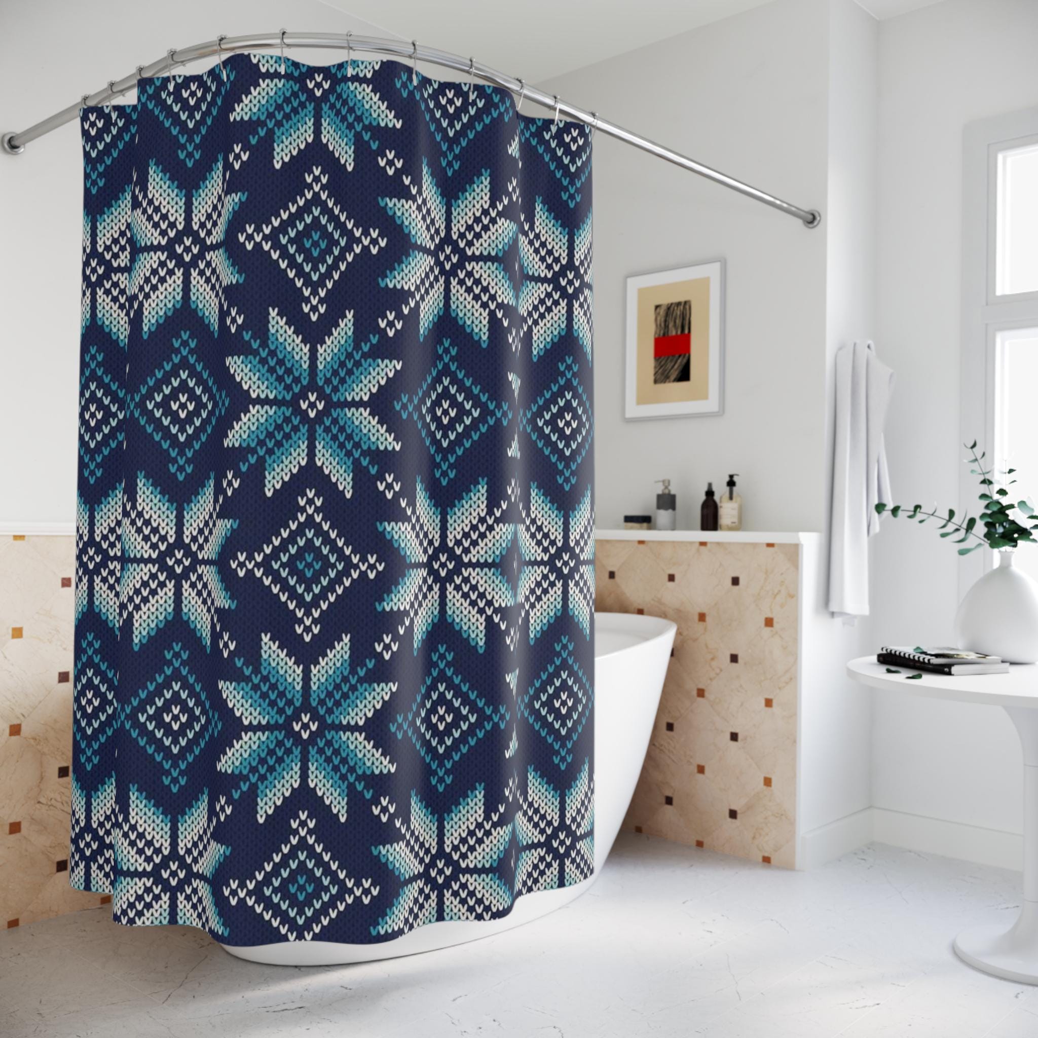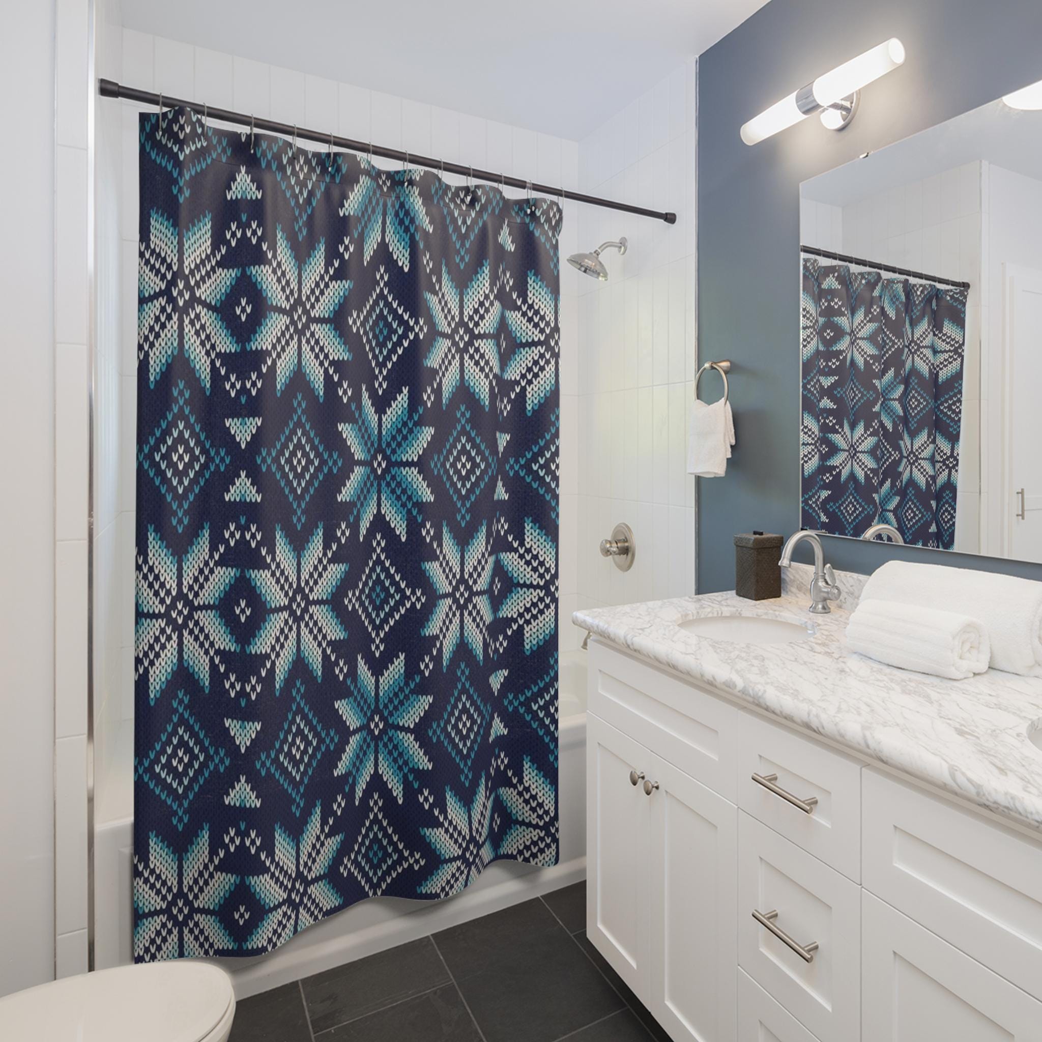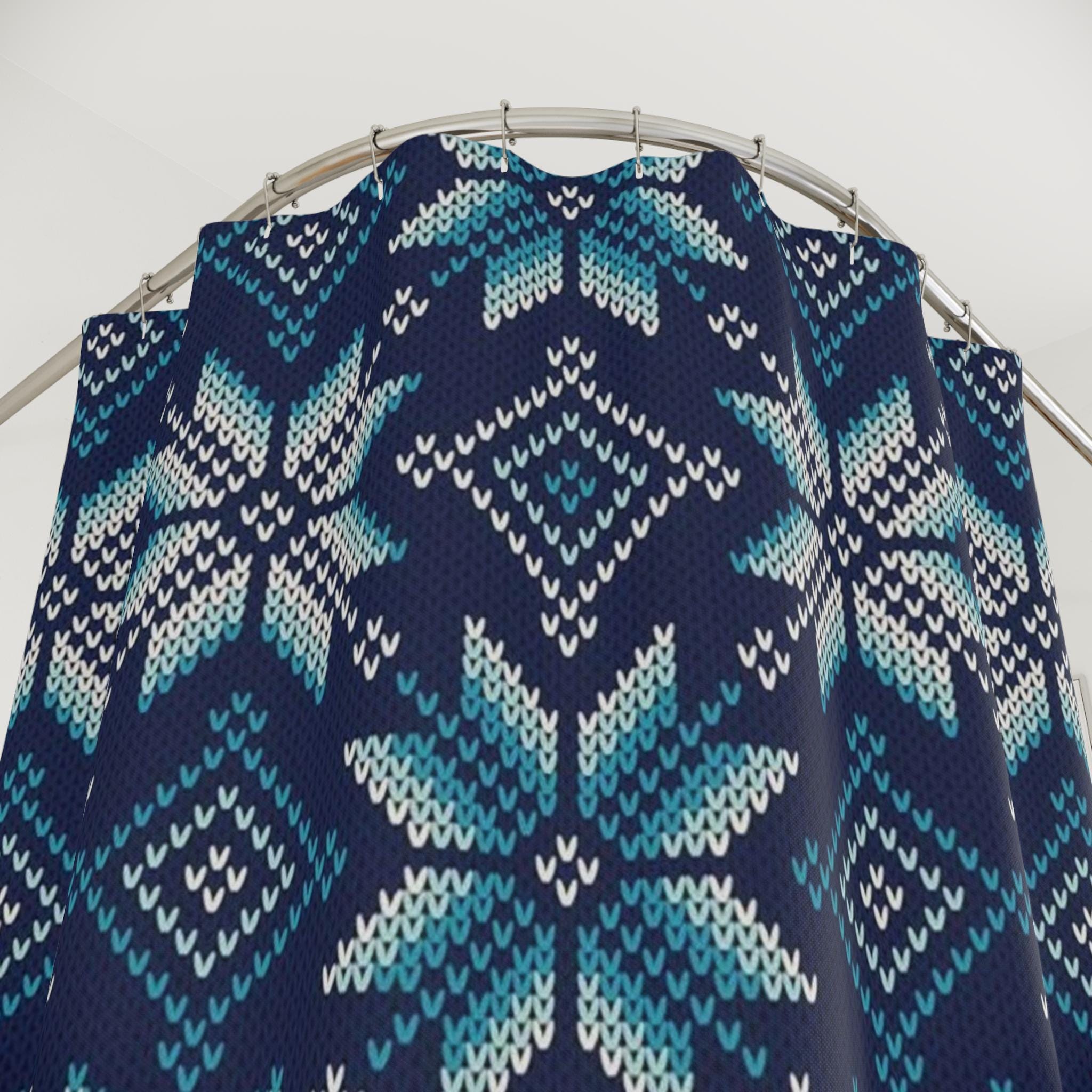 Bring a cozy, hand-knit feeling into your bathroom with this rich, Nordic-inspired shower curtain. Deep navy tones and icy teal stitches form layered snowflake motifs that read like a pixelated sweater. It hangs with twelve standard buttonholes along the top, letting the pattern drape with weight and structure. The fabric dries quickly and keeps its shape, so the textured look stays sharp through daily use. This curtain turns a quick morning routine into a quiet moment — think warm slippers, a steaming mug, and the calm hush of a winter evening at home.