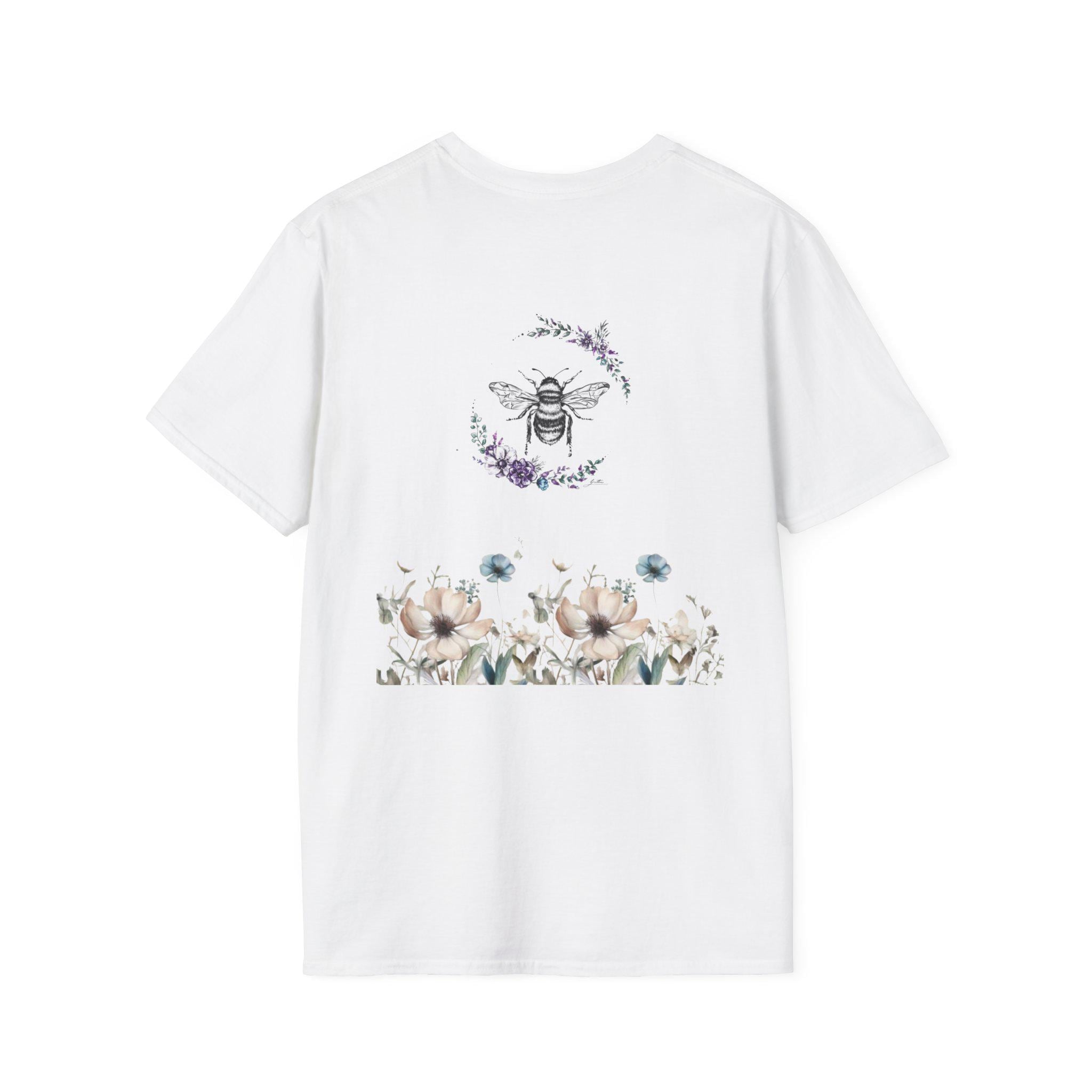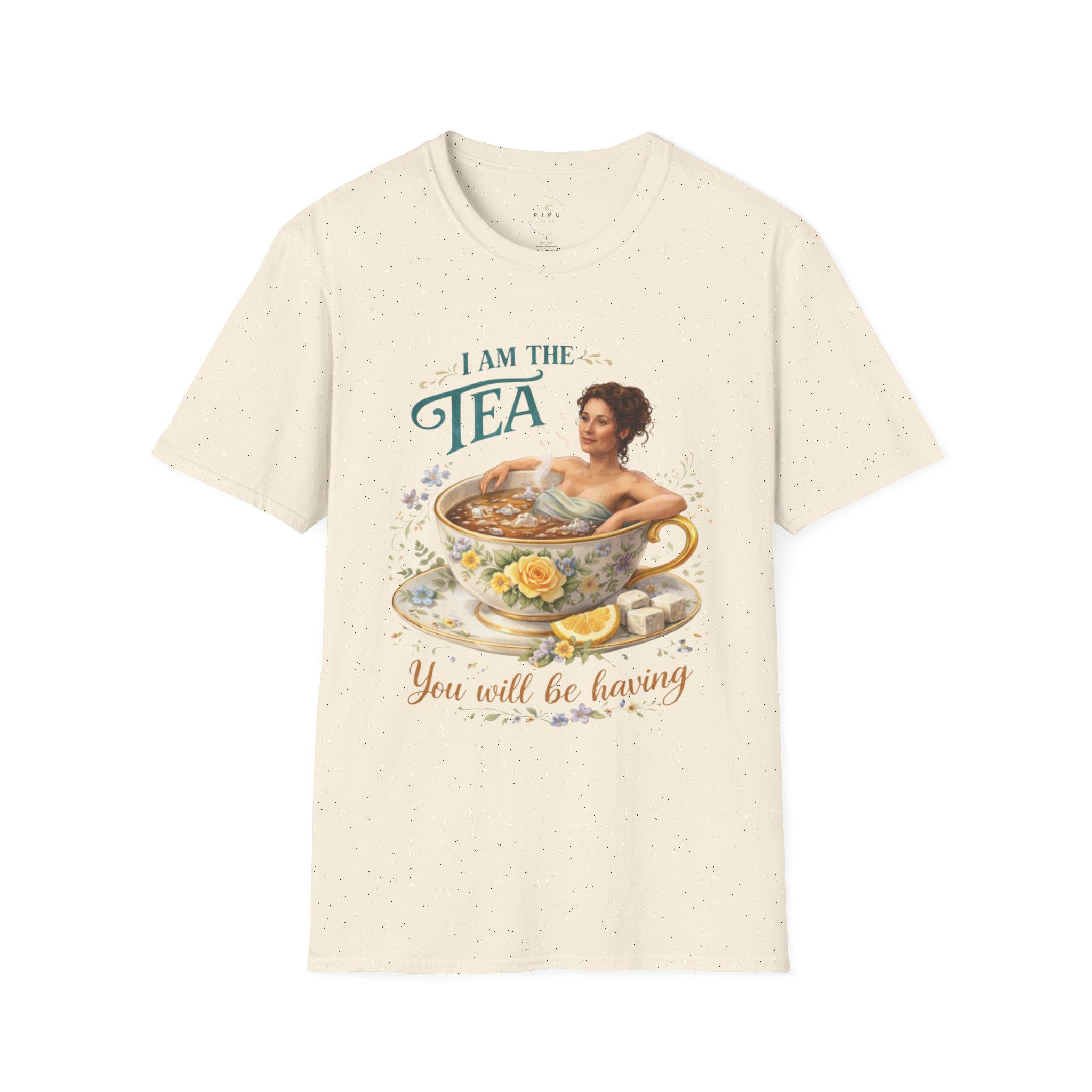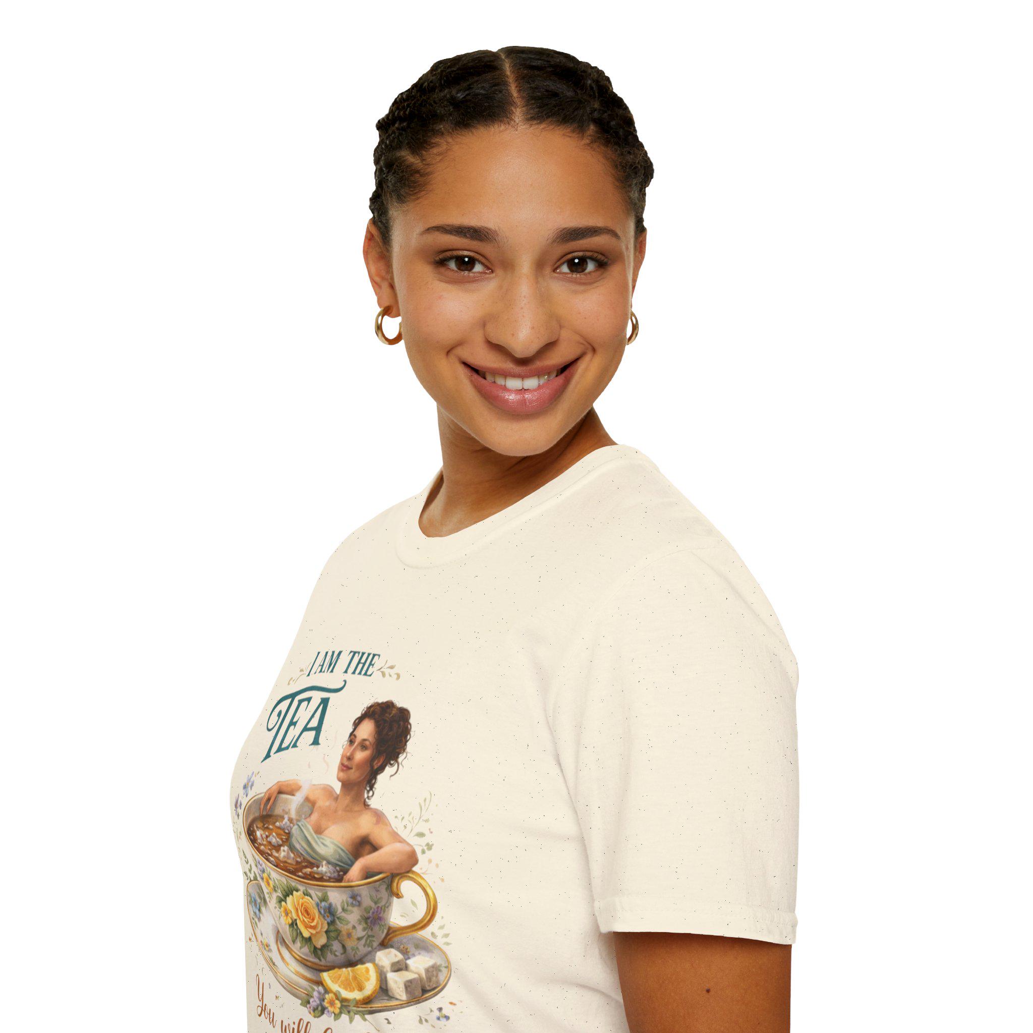 This lightweight crew-neck tee carries a gentle, whimsical vibe — soft cotton against your skin with artwork that feels like a warm, private moment. A vintage-style illustration of a woman soaking in an oversized teacup sits on the front, surrounded by delicate florals and the playful line “I am the tea you will be having.” The back continues the botanical story with a hand-drawn bee framed by a wreath and a band of watercolor blooms near the hem. Wear it for slow mornings, garden chats, or when you want a subtle, witty nod to self-care and calm. The neutral base keeps the artwork as the focal point, while thoughtful details like the ribbed collar and tear-away label keep the fit comfortable all day.